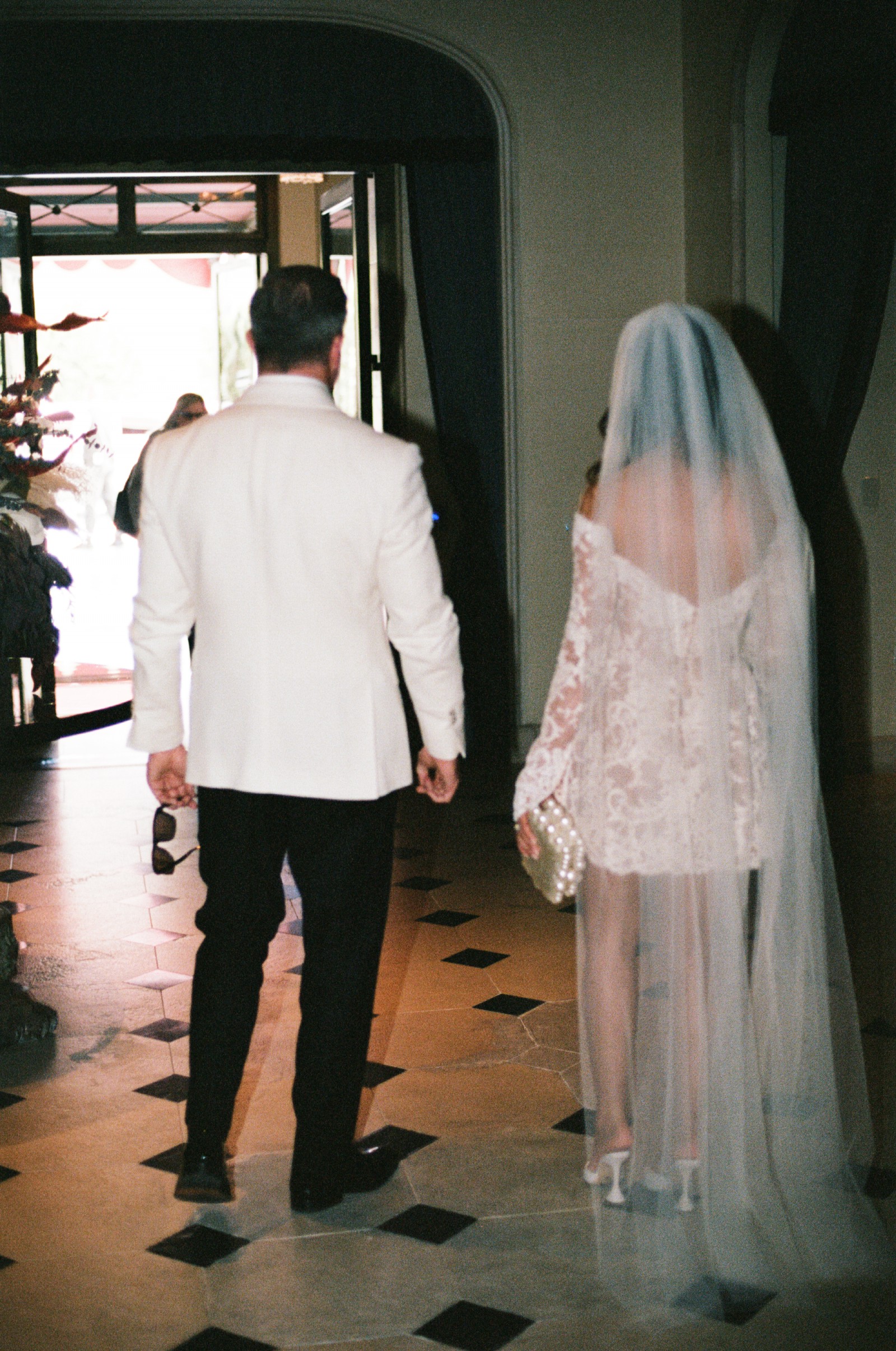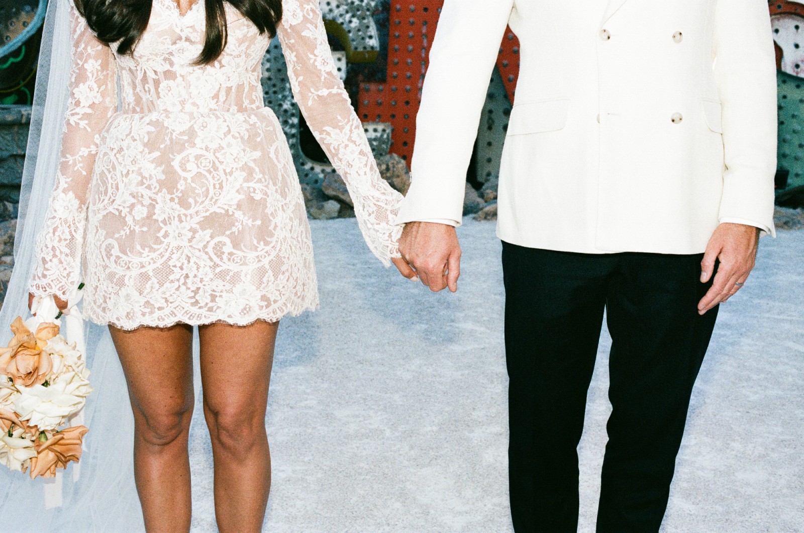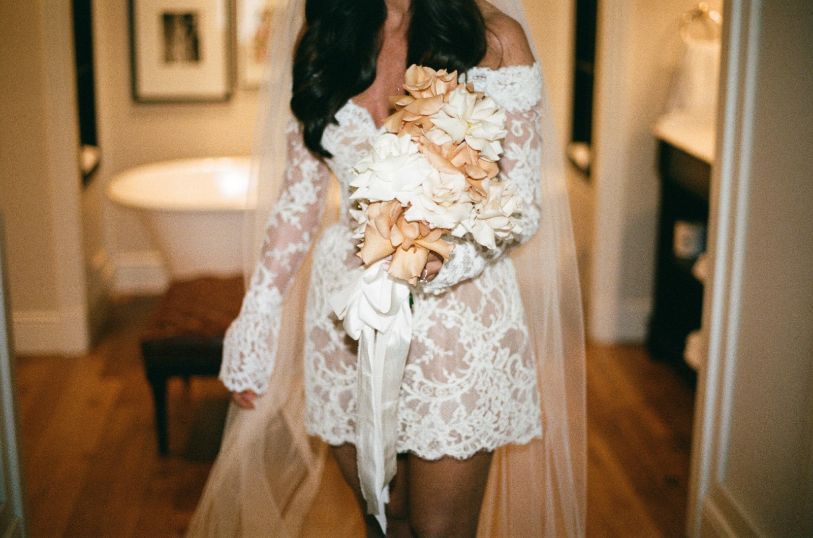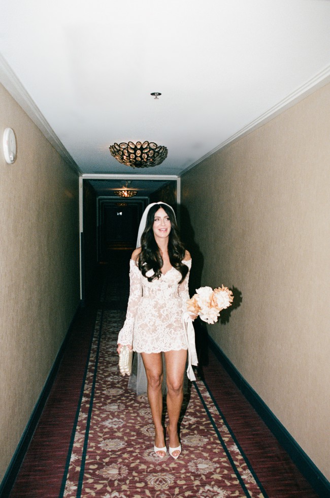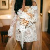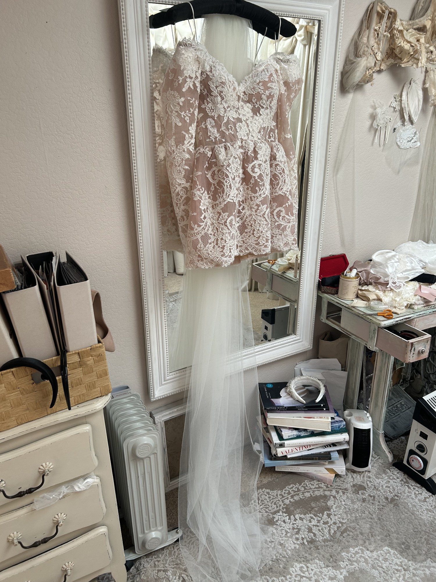Bridal mini-dress, classic Chorded French Lace with a floral and scroll design.