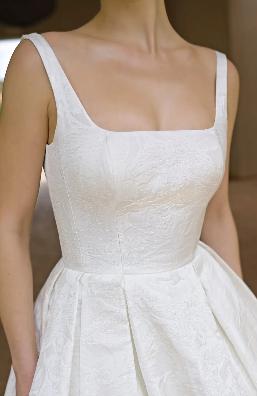 A beautiful, modern ballgown featuring dramatic layers of brocade fabric in ivory.