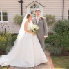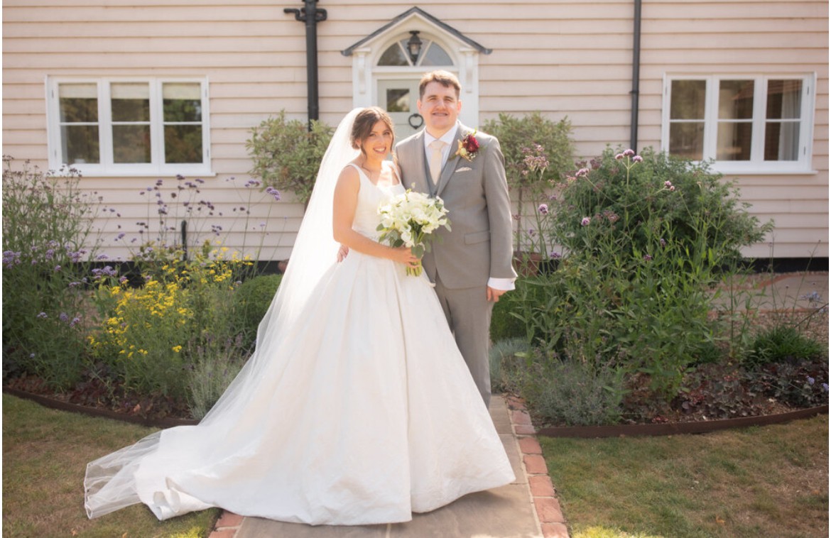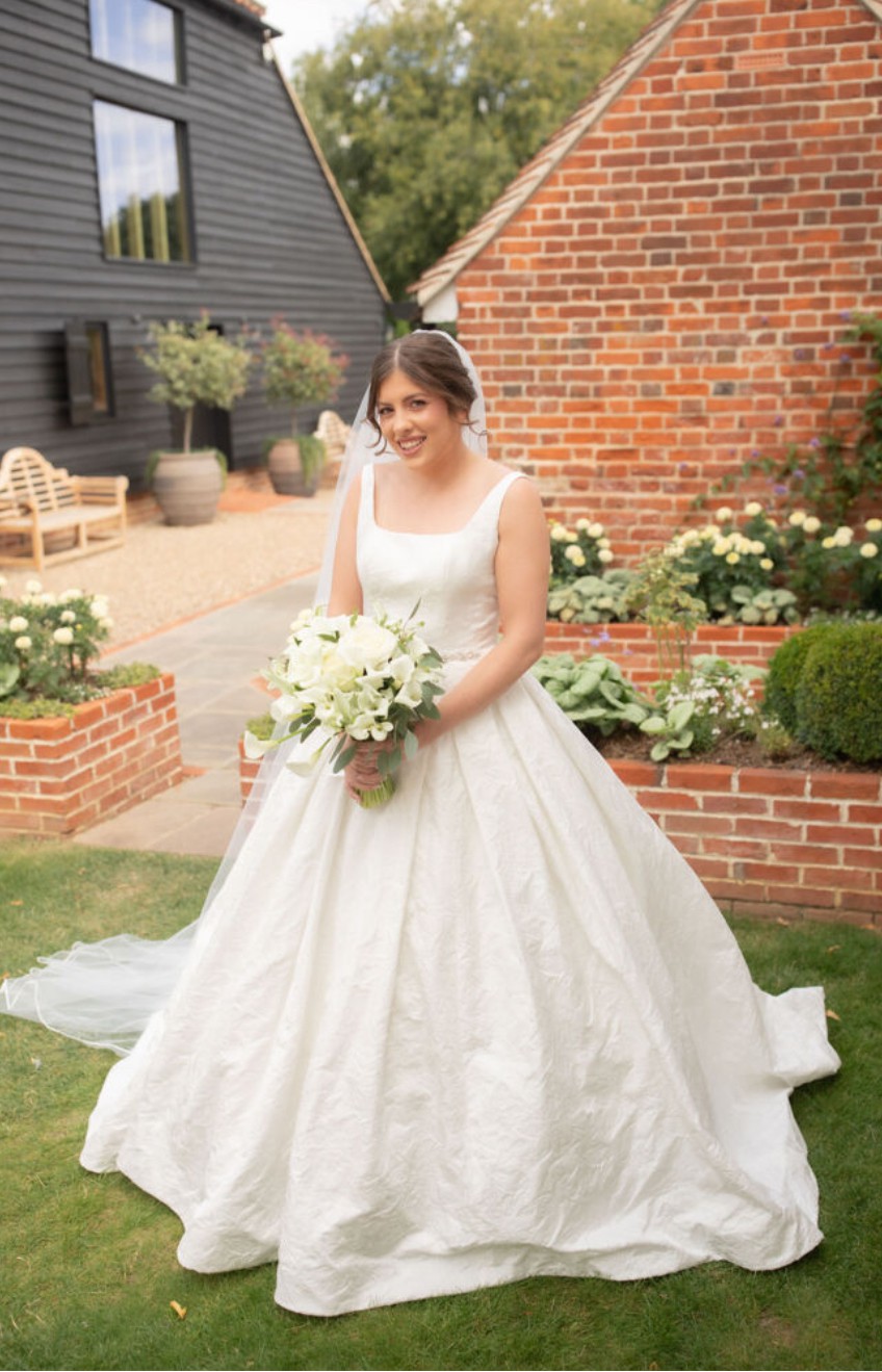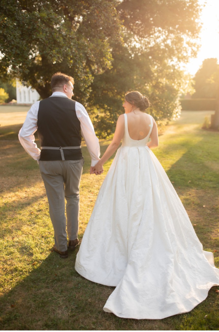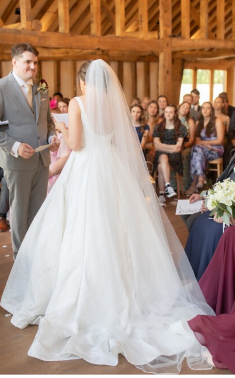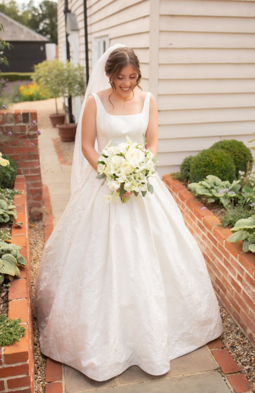 The dress has a discreet elastic hoop added to the buttons at the back to lift the train for evening dancing.