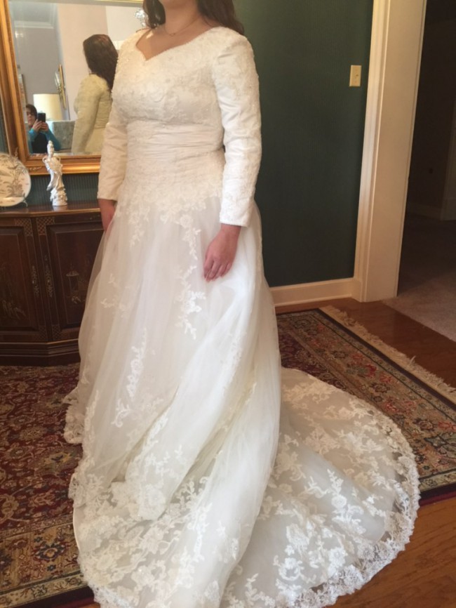 This Augustine dress by Latter Day Bride is the epitome of romance and elegance, perfect for the bride who wants to make a stunning statement on her special day. Crafted from sumptuous ivory lace, this floor-length ballgown features a timeless sweetheart neckline that beautifully frames the décolletage, enhancing your natural beauty. The long sleeves add a touch of sophistication, making it suitable for all seasons, while providing a modest yet striking silhouette.