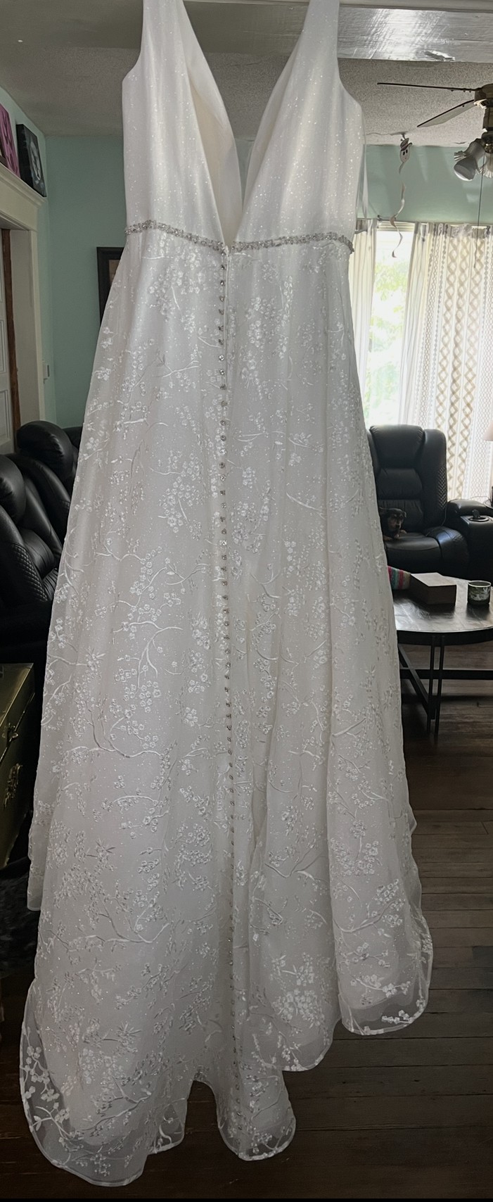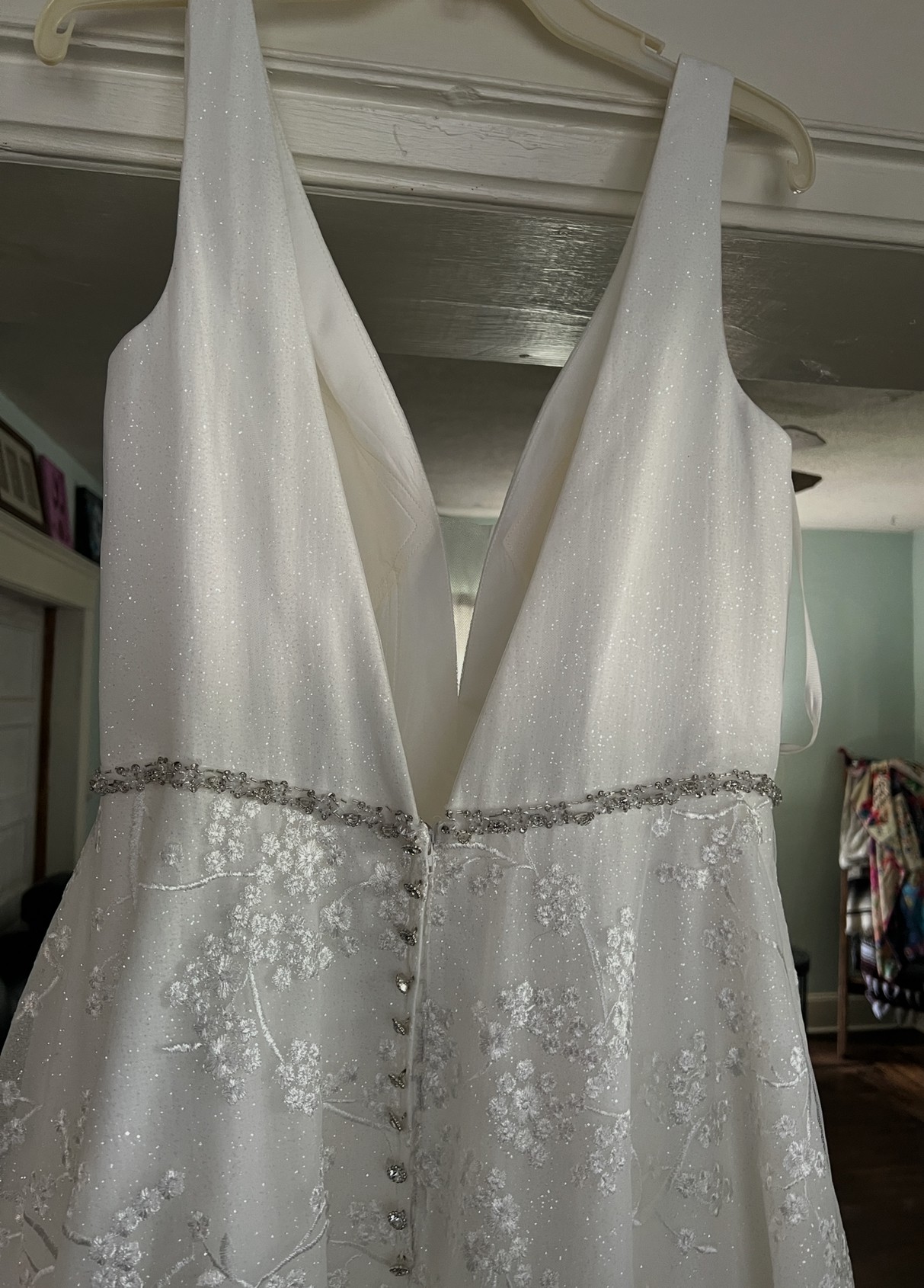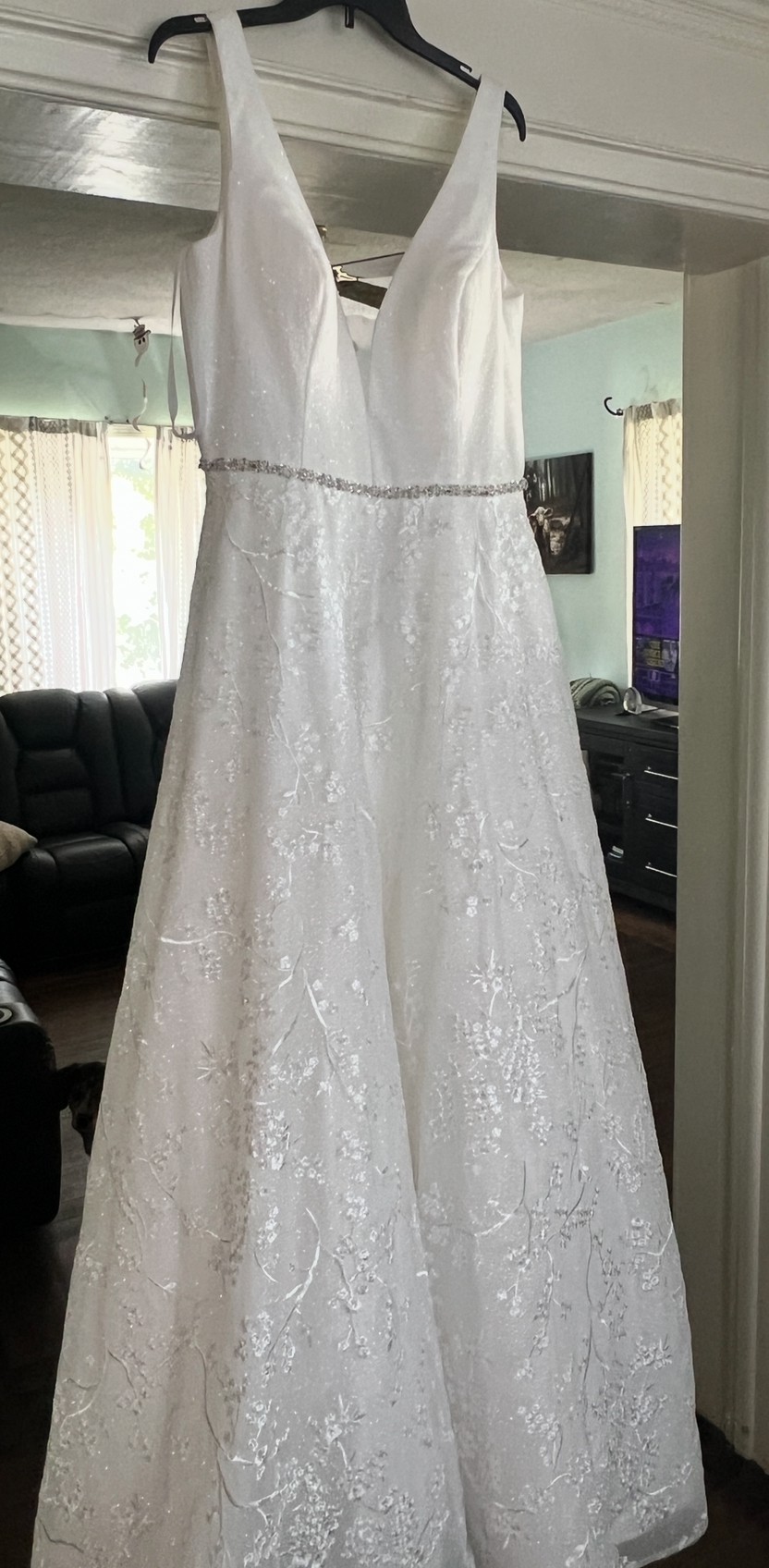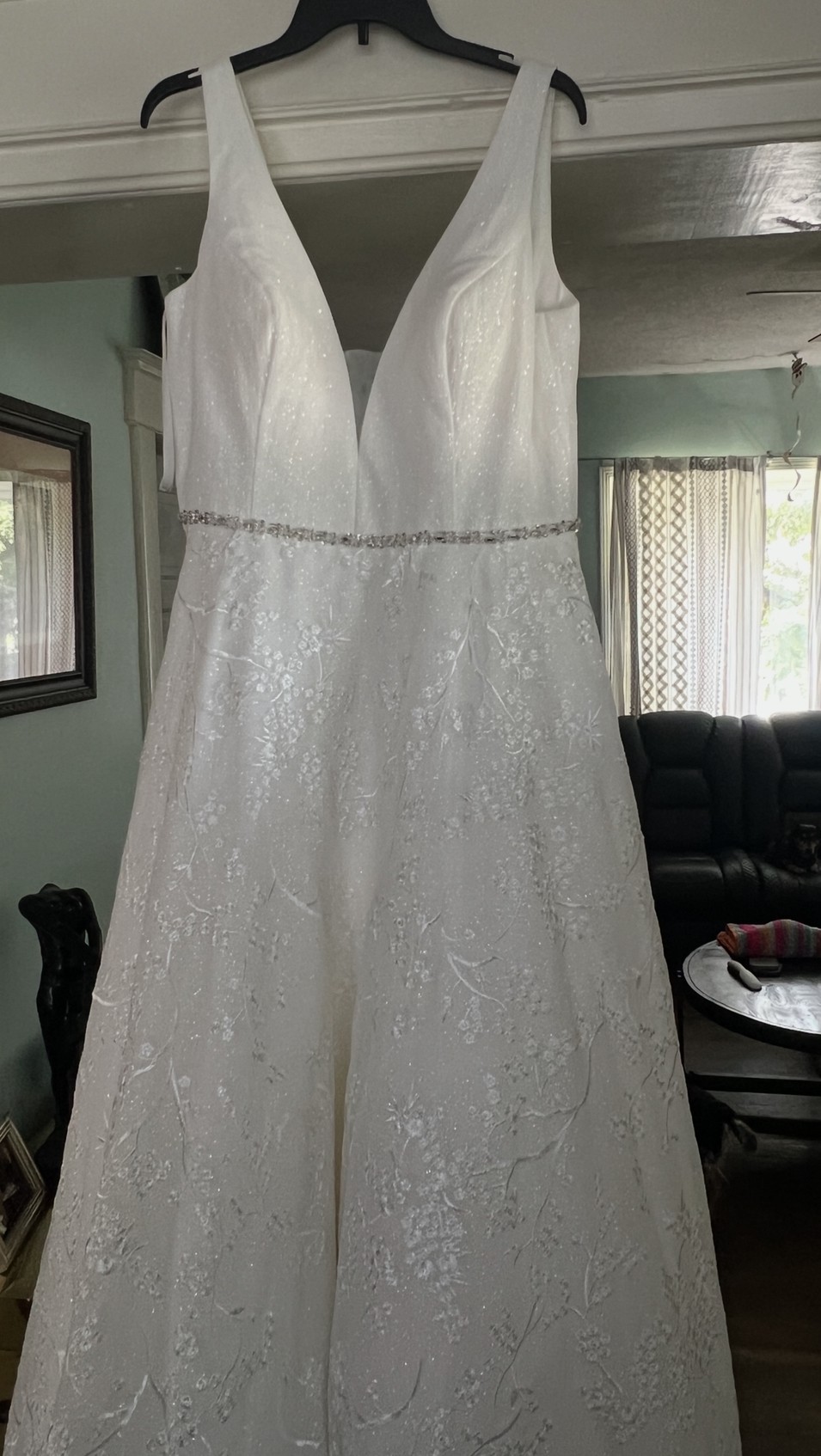 Wedding dress is an a line with V neckline and a sparkle full skirt with flower lace detail. Color is candlelight. It is a size 18. I also purchased a rose gold belt to go with it and the zipper gown bag. It is a very beautiful dress, very lightweight and it has pockets. It has not been altered, and it has never been worn except for being tried on.