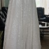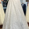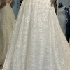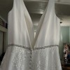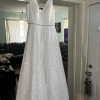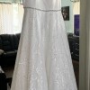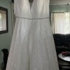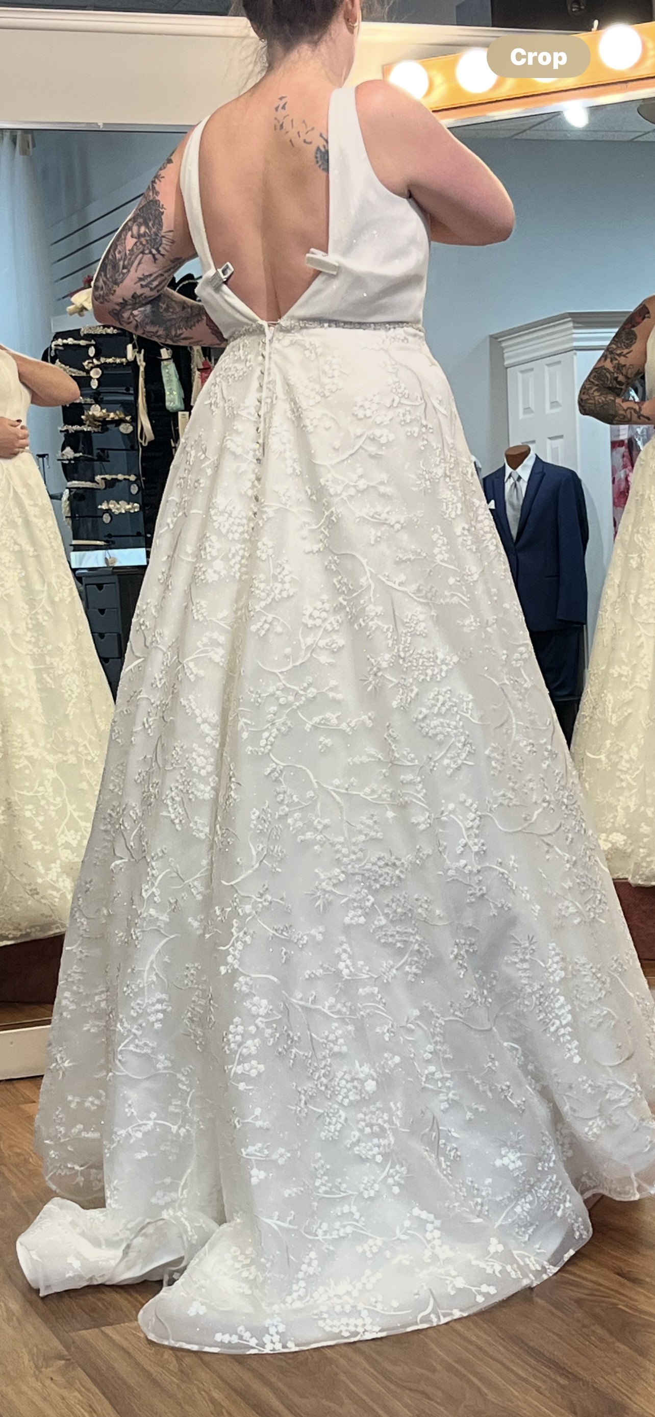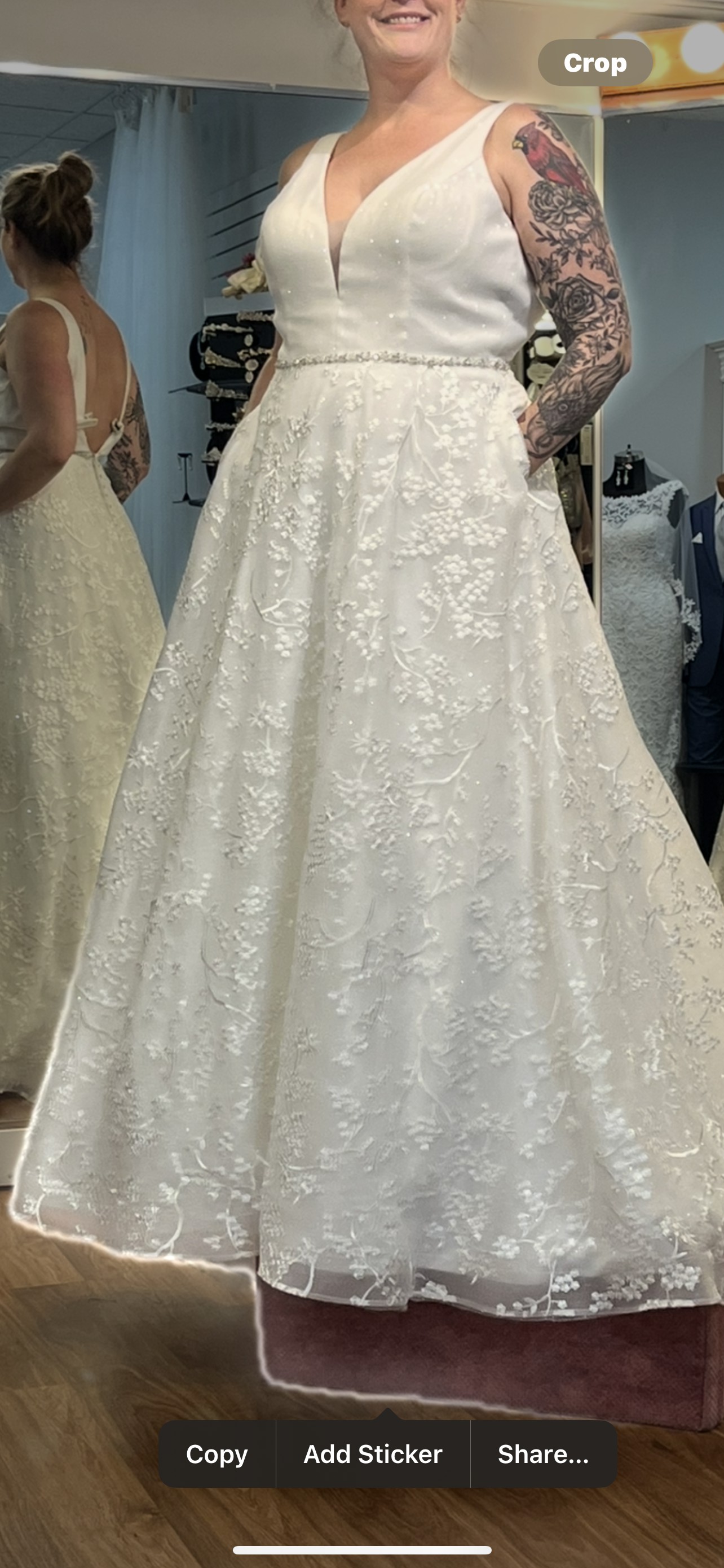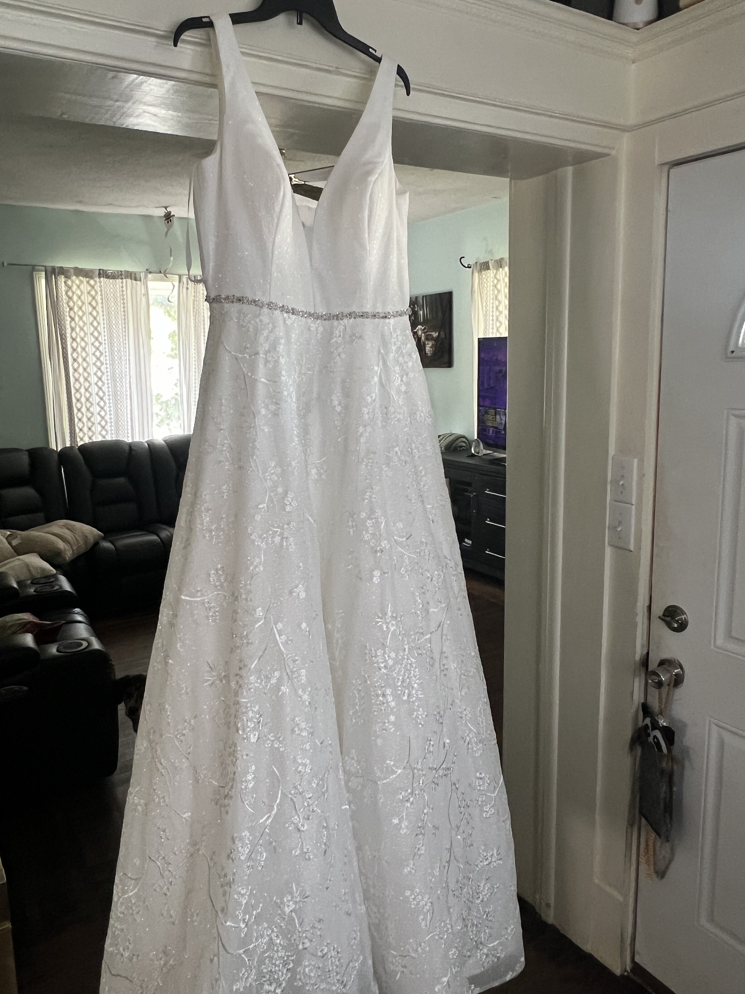 Wedding dress is an a line with V neckline and a sparkle full skirt with flower lace detail. Color is candlelight. It is a size 18. I also purchased a rose gold belt to go with it and the zipper gown bag. It is a very beautiful dress, very lightweight and it has pockets. It has not been altered, and it has never been worn except for being tried on.