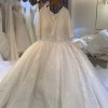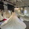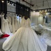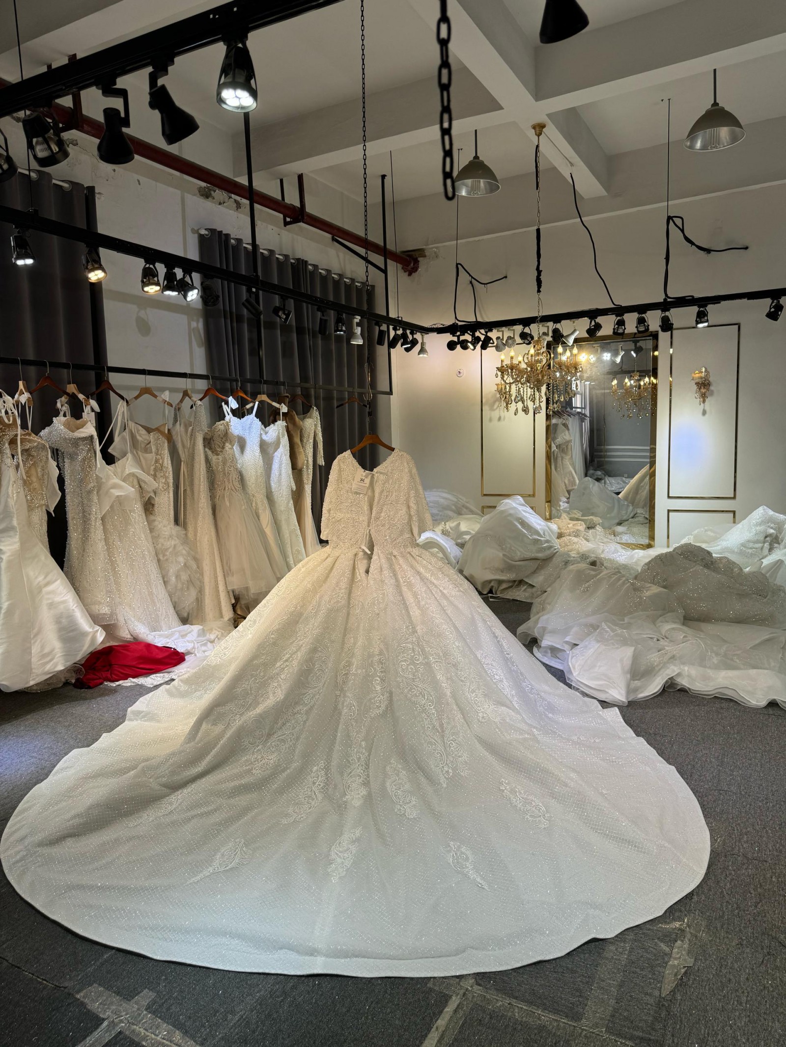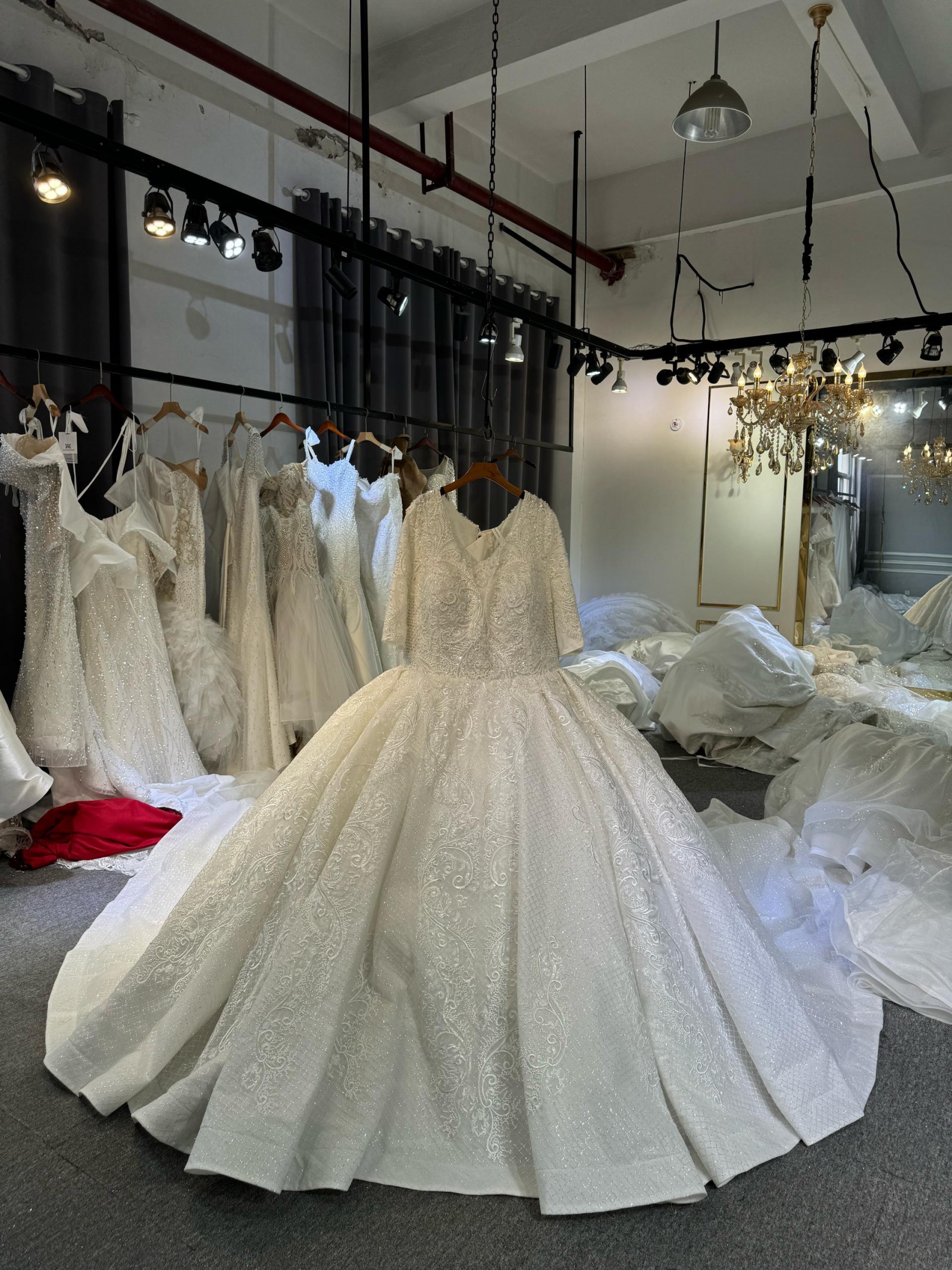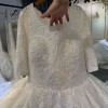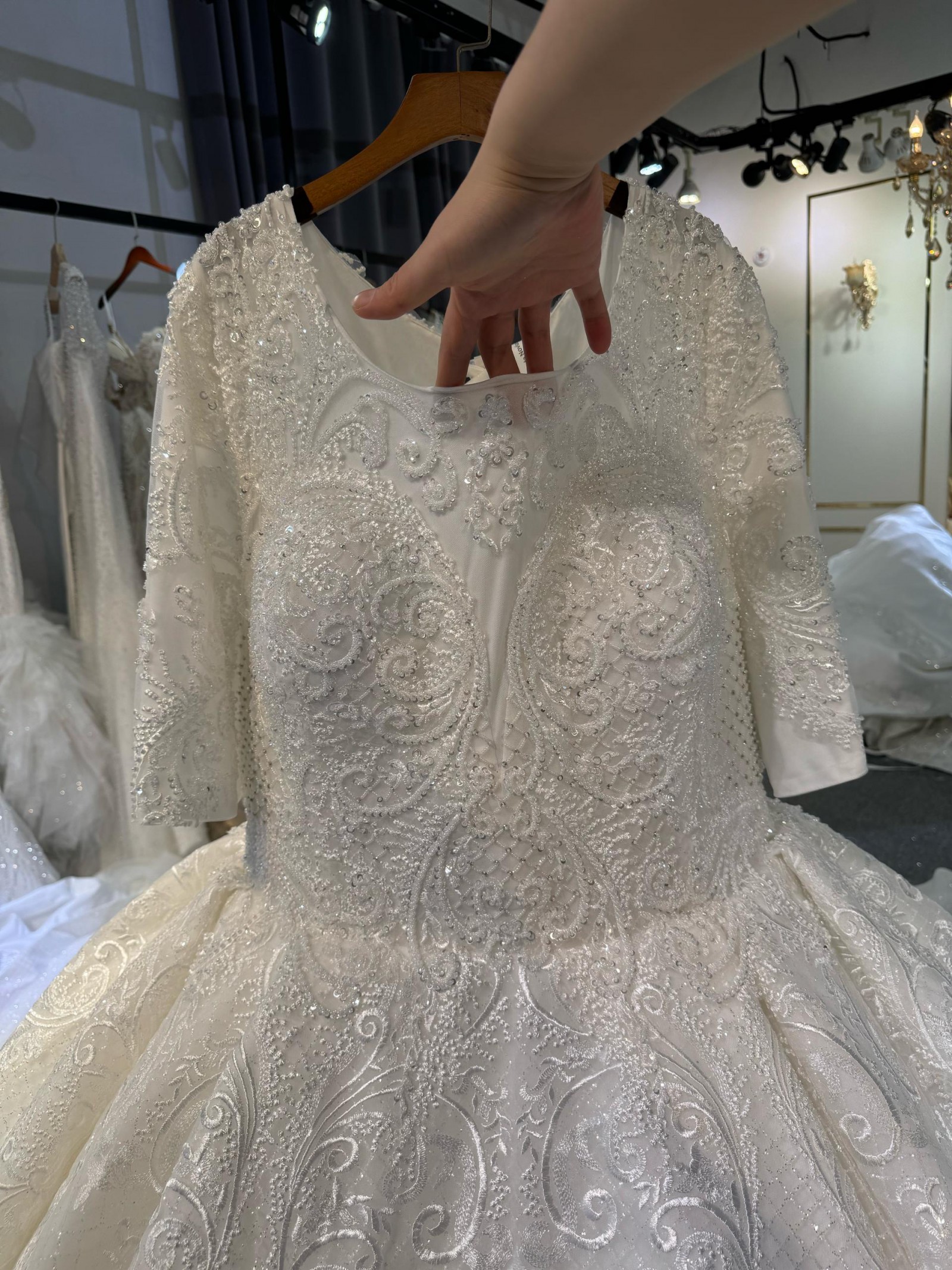 The boat neckline perfectly frames the shoulders, and the 3/4 sleeves provide just the right amount of coverage while maintaining a soft, flattering silhouette. The corset back allows for a customized fit, hugging the waist and enhancing the gown's breathtaking shape. The stunning overskirt adds volume and drama, making it a showstopper for any bride seeking a fairytale dress.