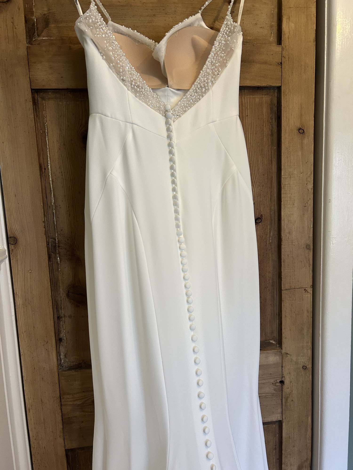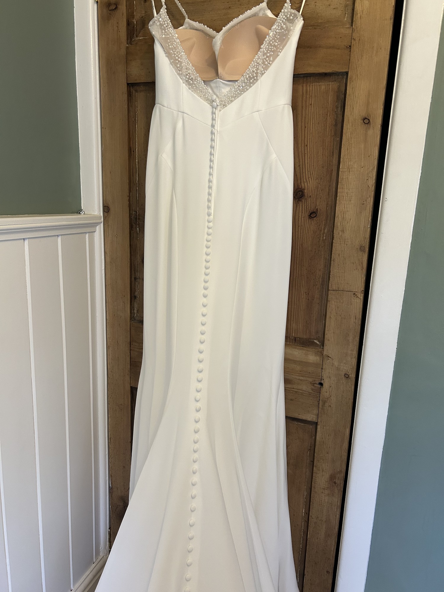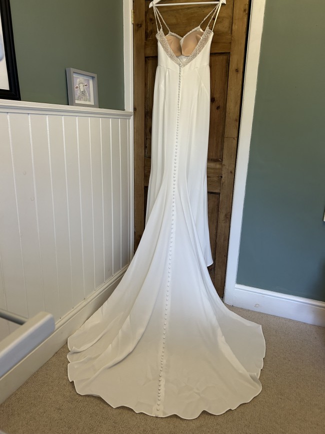 This Cove wedding dress by Stella York encapsulates timeless elegance with a contemporary twist. Crafted from luxurious crepe, its fit and flare silhouette beautifully accentuates your figure, creating a stunning hourglass shape that will leave you feeling confident and radiant on your special day. The delicate spaghetti straps add a touch of sophistication while providing the necessary support for a seamless fit.