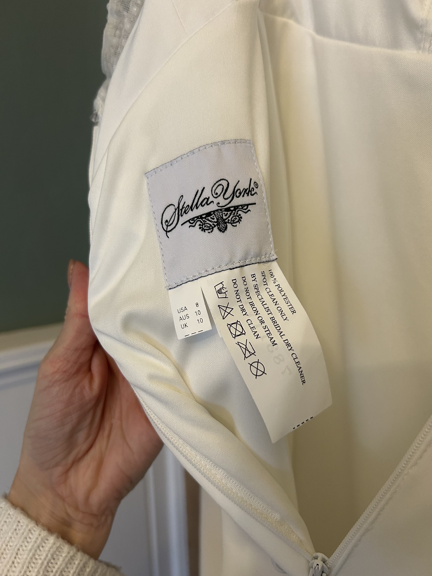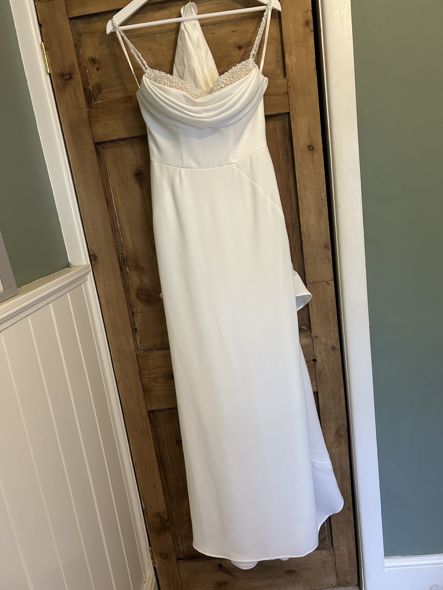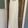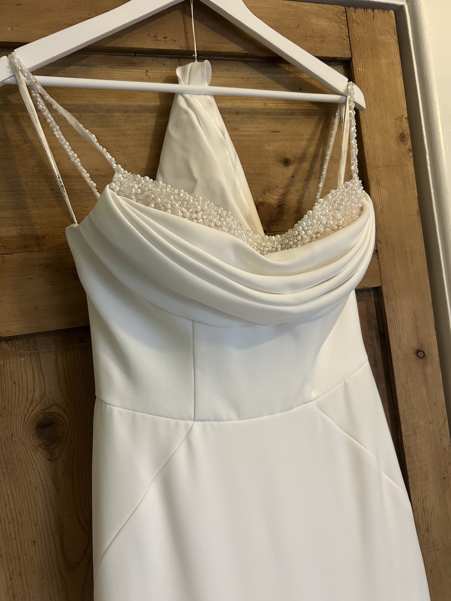 This Cove wedding dress by Stella York encapsulates timeless elegance with a contemporary twist. Crafted from luxurious crepe, its fit and flare silhouette beautifully accentuates your figure, creating a stunning hourglass shape that will leave you feeling confident and radiant on your special day. The delicate spaghetti straps add a touch of sophistication while providing the necessary support for a seamless fit.
