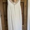 The breathtaking curve neckline frames your décolletage, lending an air of romantic charm. As you turn, the backless design reveals a daring yet tasteful element, ensuring all eyes are on you as you make your grand entrance. The ivory hue adds a classic, ethereal quality, perfect for any wedding theme or season.