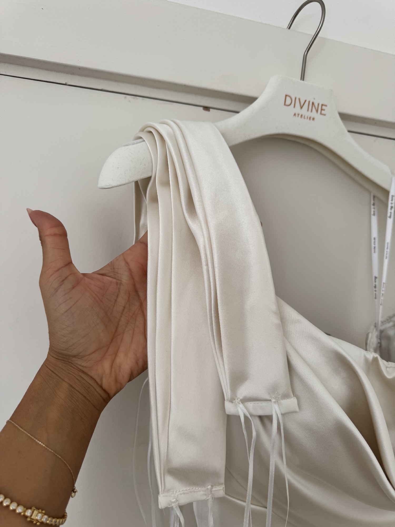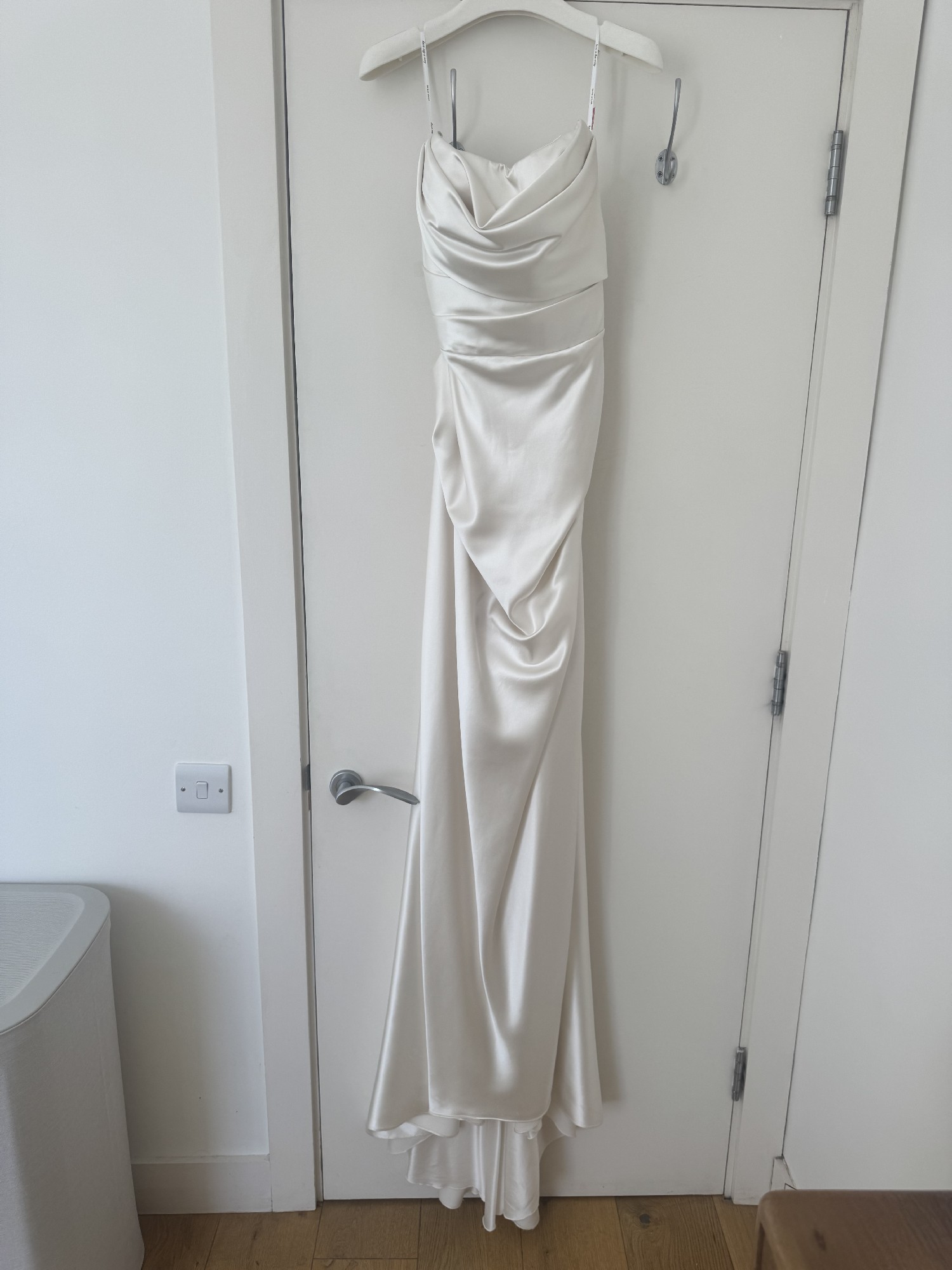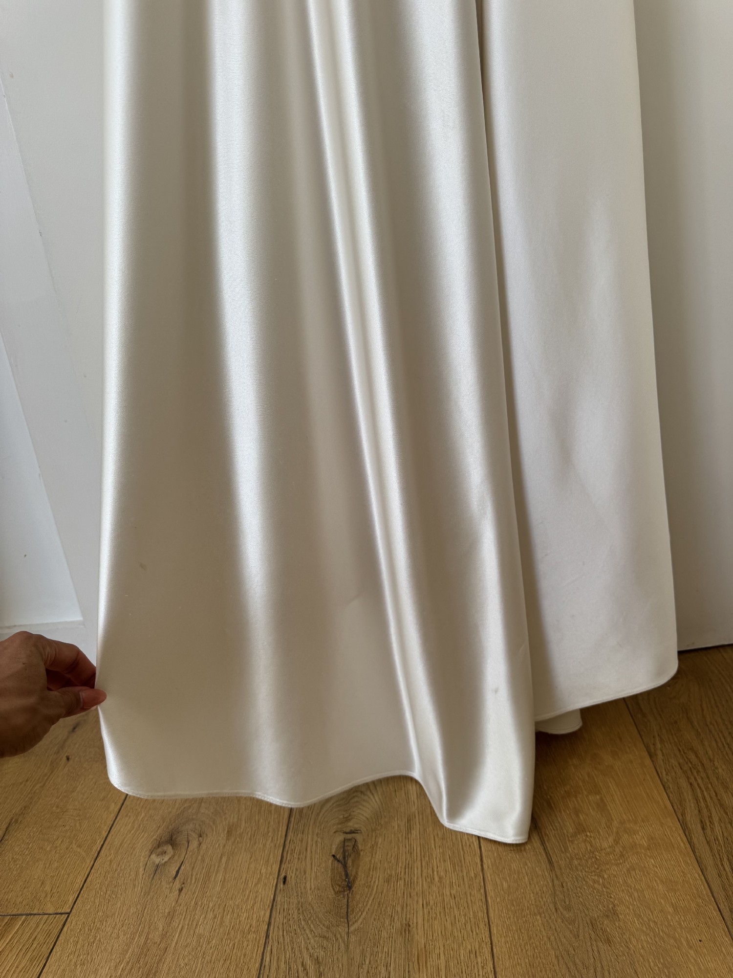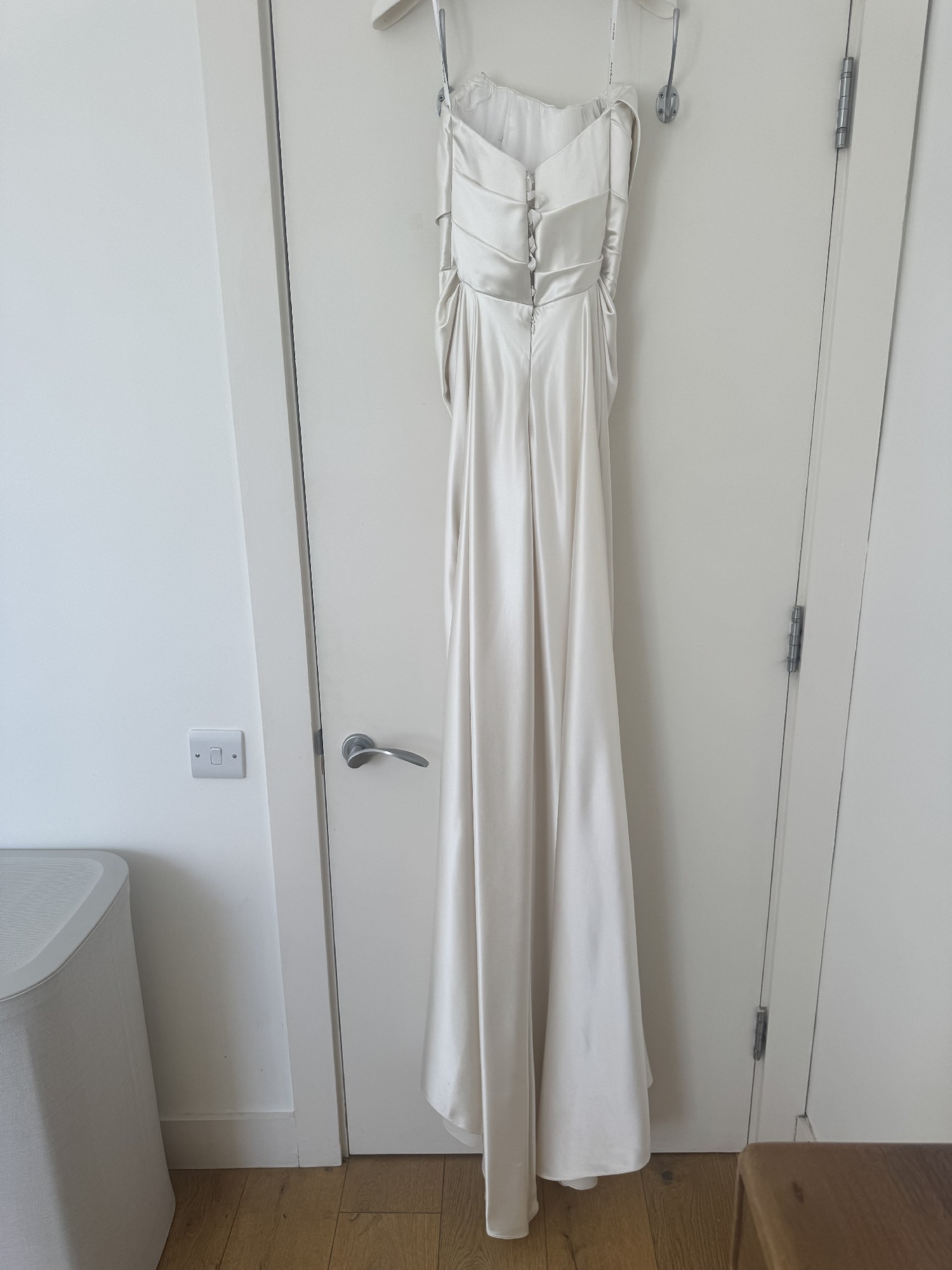 Drapes/sleeves also included - I paid £3950 in total. Absolutely beautiful dress - my DREAM dress. Worn for a few hours because our ceremony was at sunset and I changed into a short party dress after dinner. It's in great condition - no snags or pulls. Some barely visible marks at the hem (pictured) and one mark which my regular dry cleaner tells me is red wine and can be removed by a specialist wedding dress dry cleaner (which he is not!). I have pictured it clearly. It's in really great condition, has only been altered slightly as it's a corset back and didn't need much adjusting. I'm 5"9 and wore 5 inch heels so it's still very long. Happy to answer any further questions or send more pictures and videos.