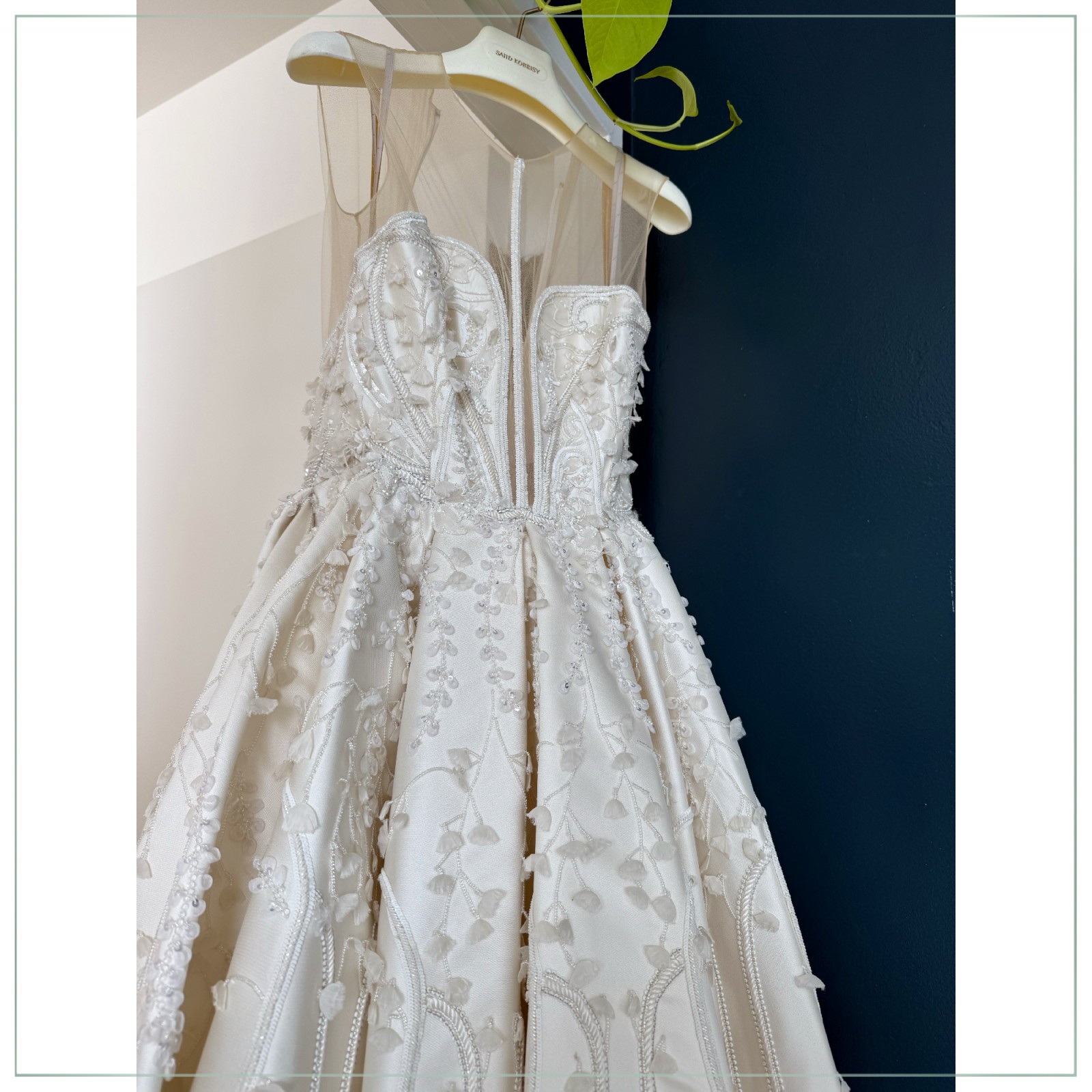 The beading on this exquisite gown is a symphony of intricate details and delicate artistry.