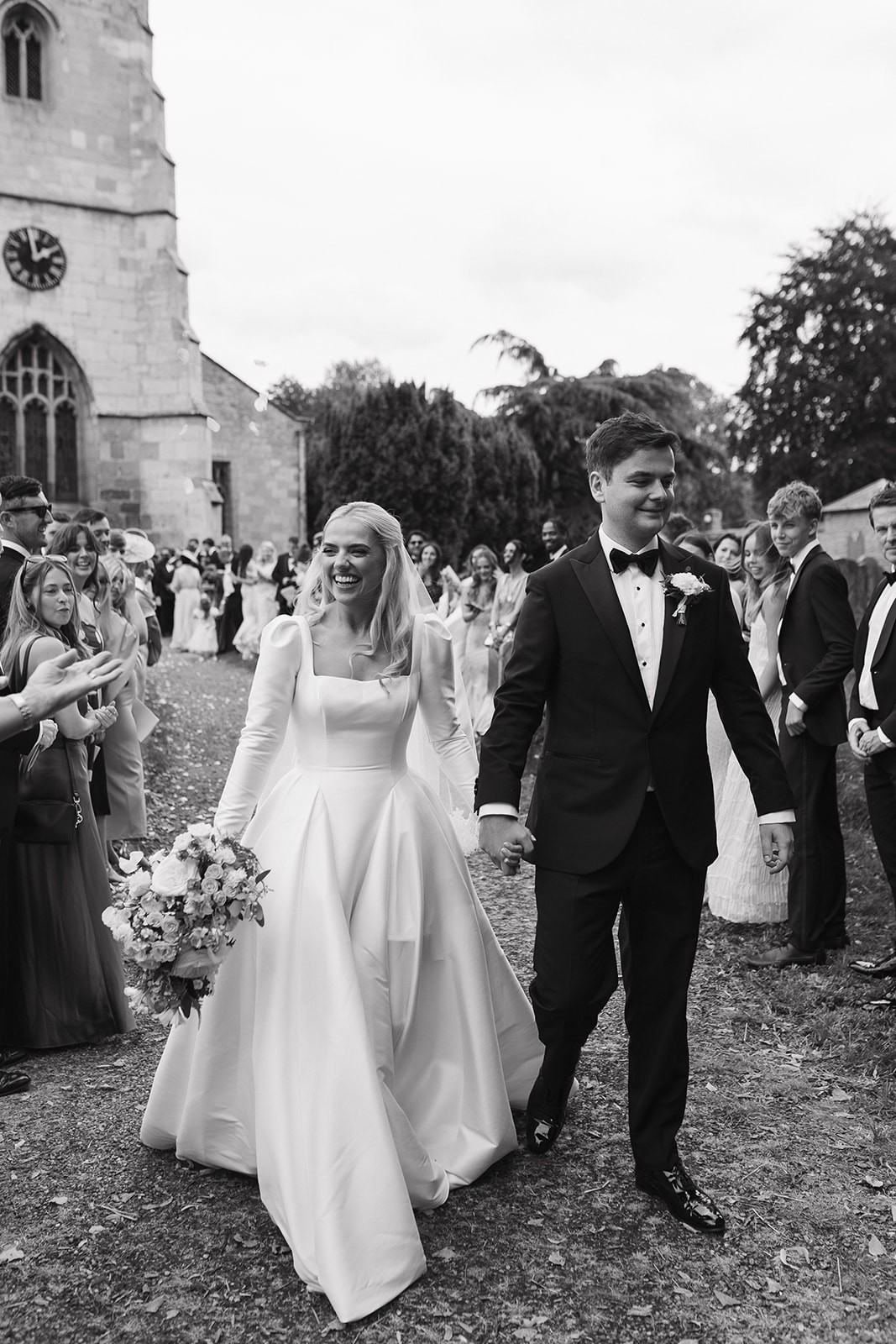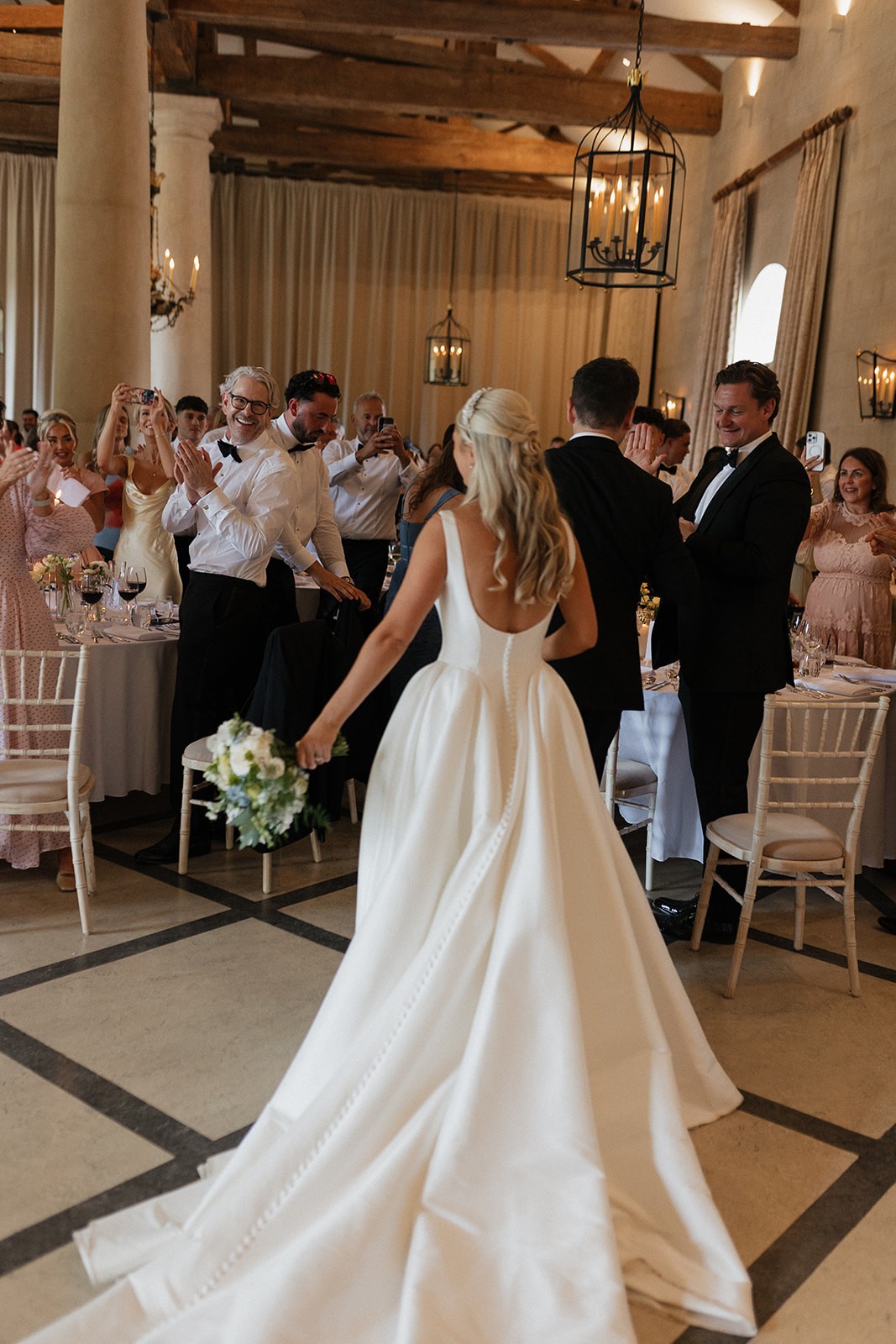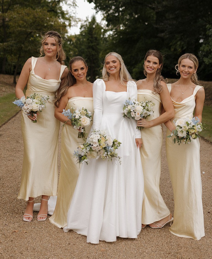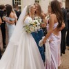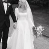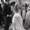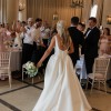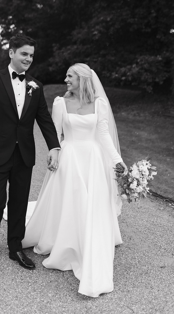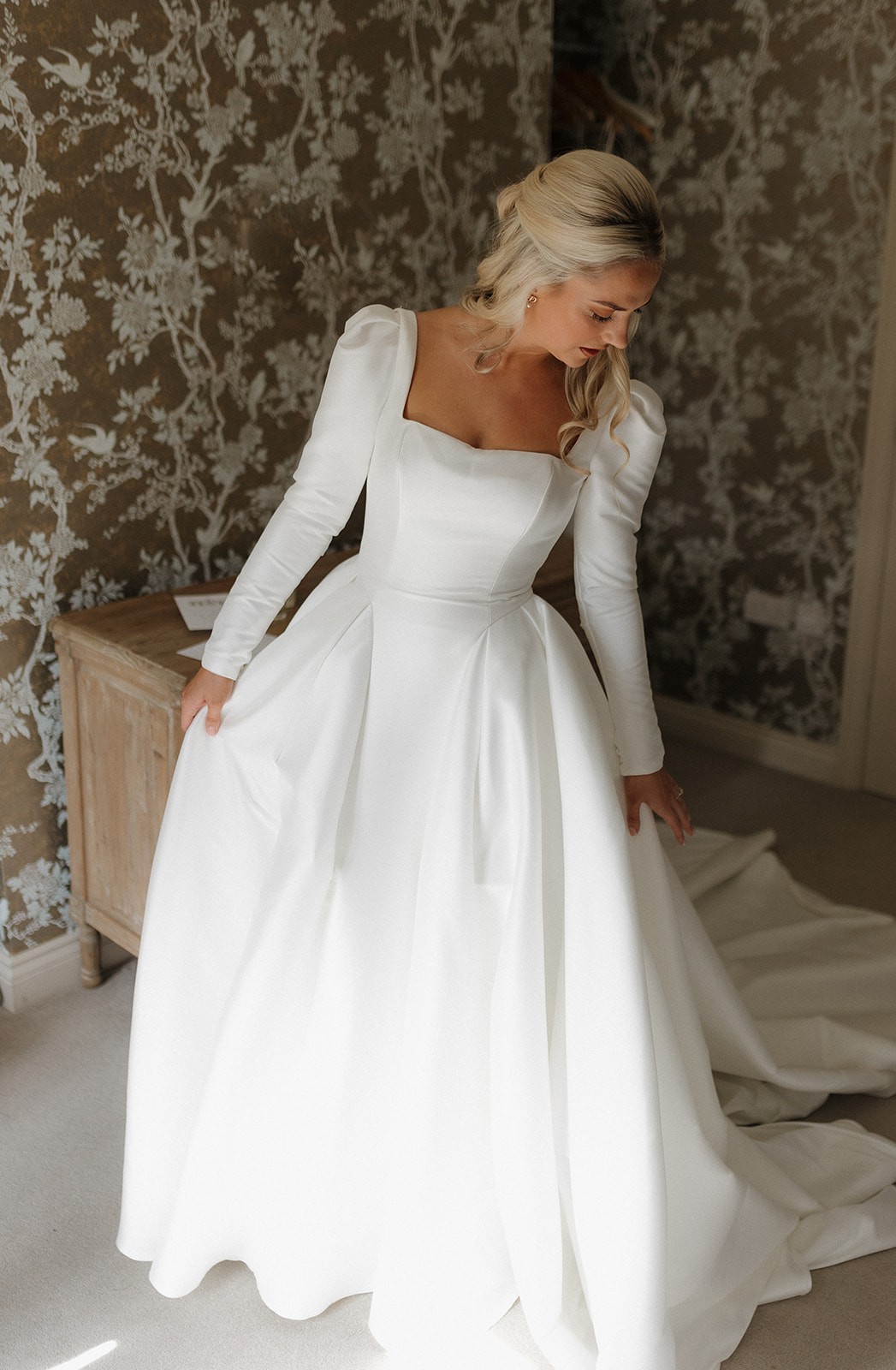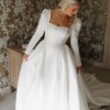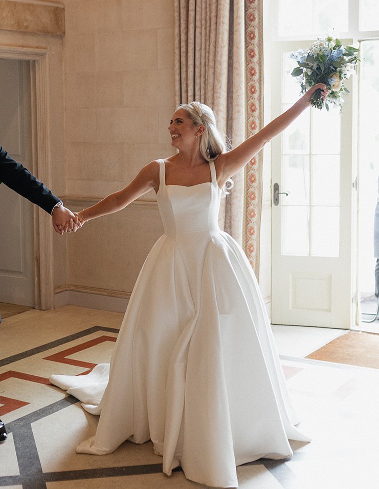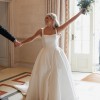 Dabira is a stretch Mikado ball gown with a square neckline and scoop back. The dress features a full skirt with couture seaming, box pleats at the hips, pockets and Mikado covered buttons extending to end of chapel length train. The Basque waist line is a distinguishing and super flattering feature. The Sleeves are detachable which gives the dress a new lease of life for evening!