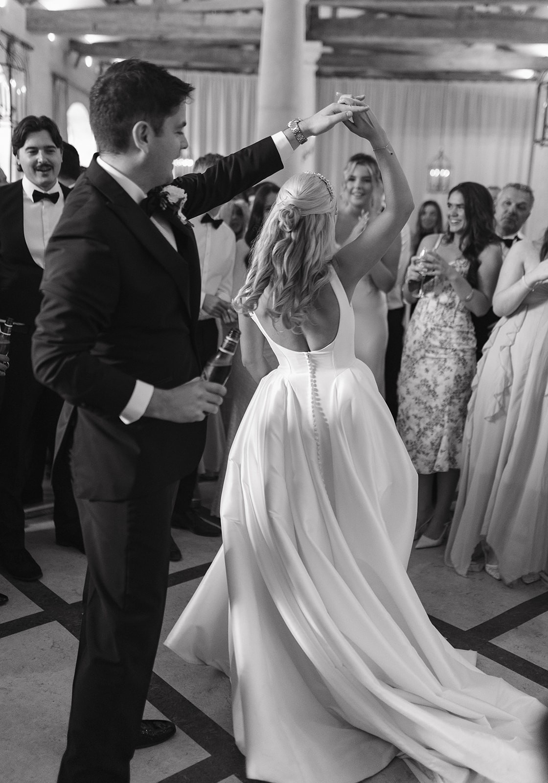 - A bustle has also been added to the dress, and a bra has been built into the top