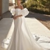 This absolutely beautiful off white, two piece mermaid wedding dress gives day to night, isle to party elegance and drama in one outfit.