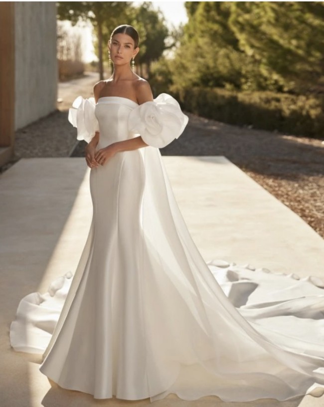 Strapless, straight neck line and removable ruffled sleeves and organza back cape.