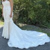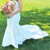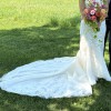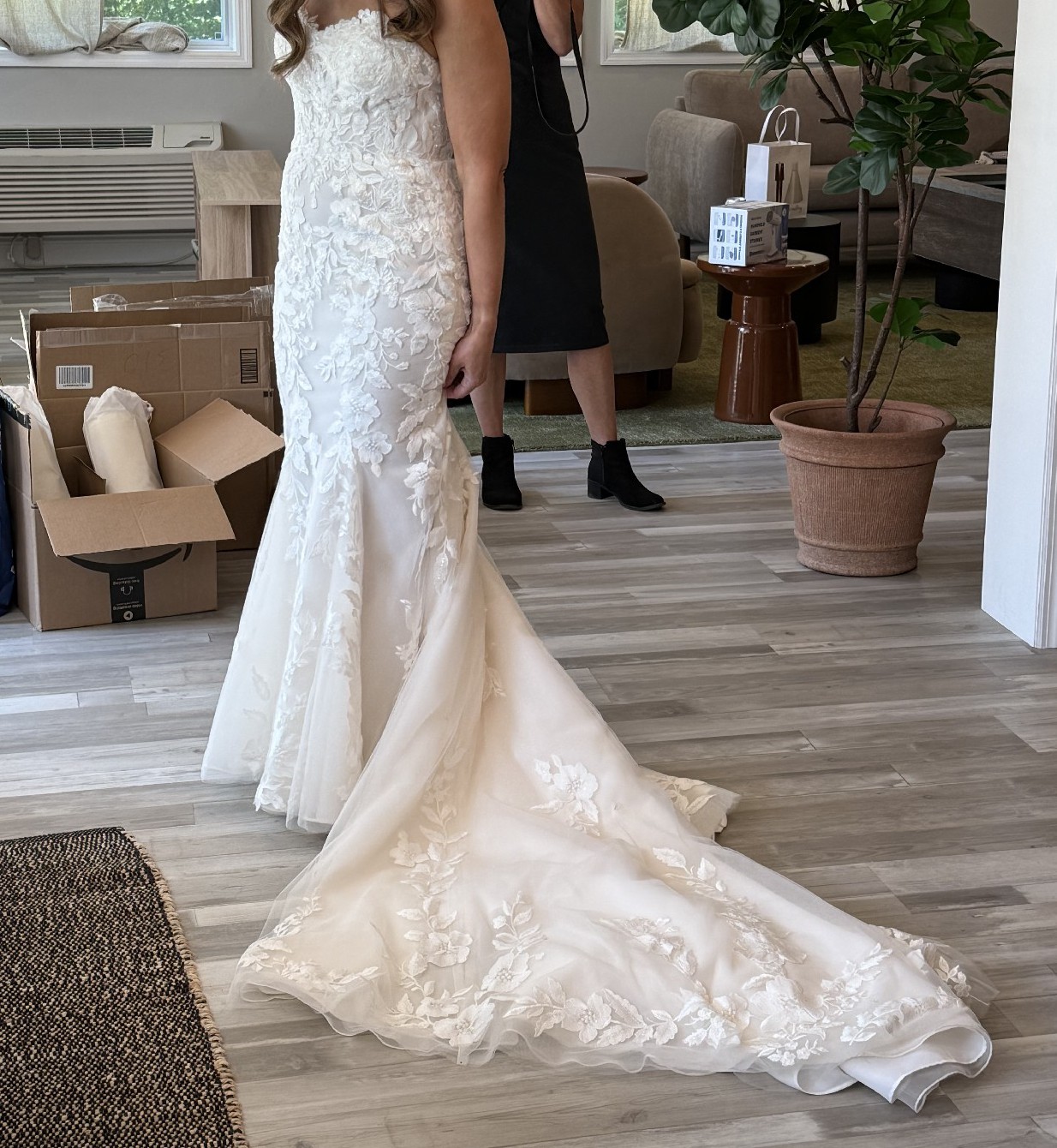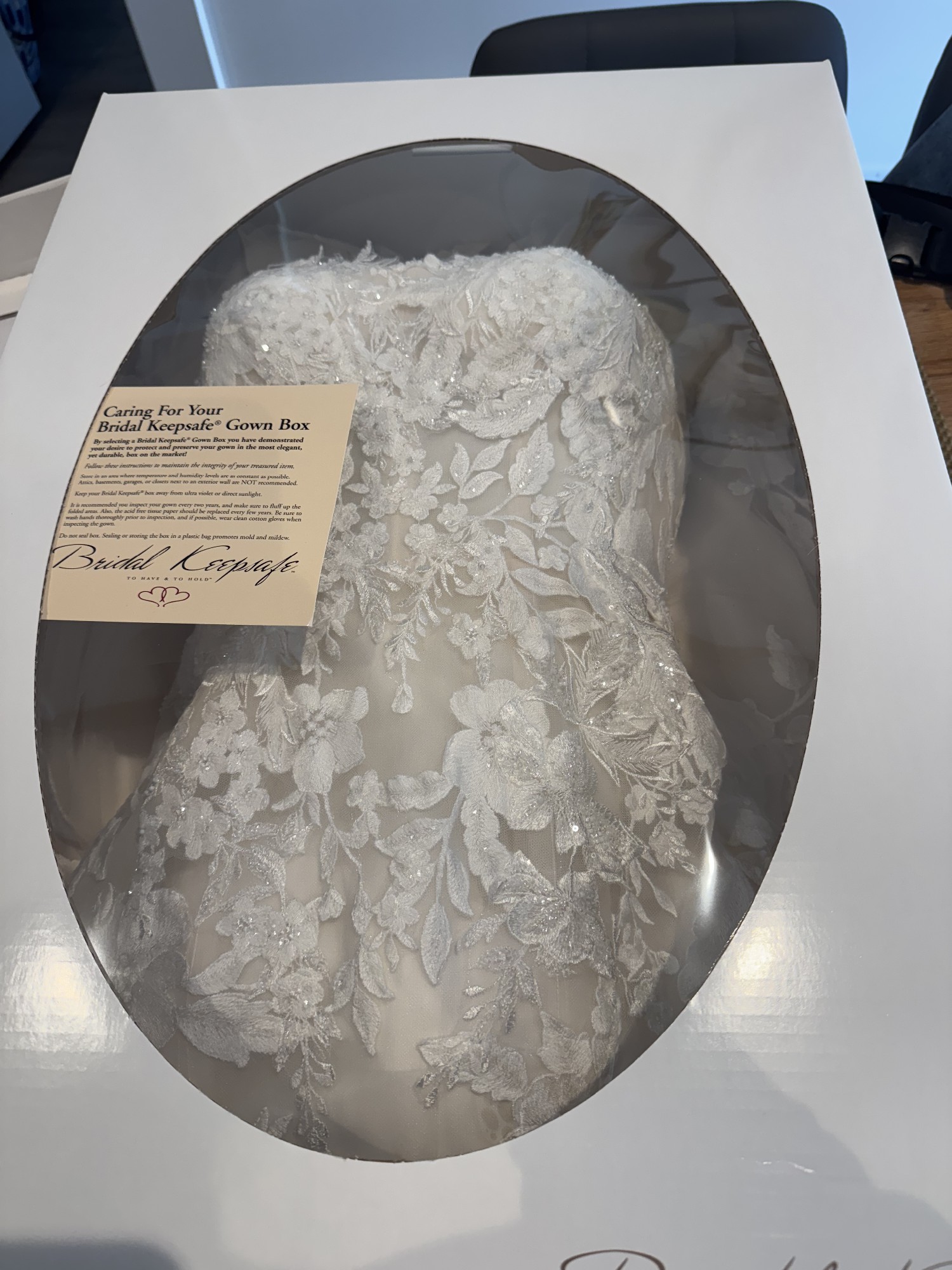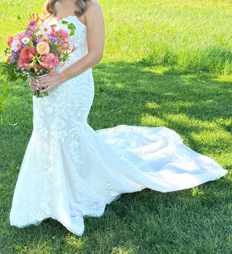 This dress is a size 8-10 based upon the designers measurements, but I am a true size 4. My waist is a size 27 and bust is 34. The dress was created based upon my measurements and it has been lovingly cared for since the big day with dry cleaning and preservation. I hope to pass on this dress on so that another bride can feel as stunning and confident as I did while wearing it. Don’t miss out on the opportunity to make this dress your own and walk down the aisle in style!