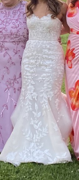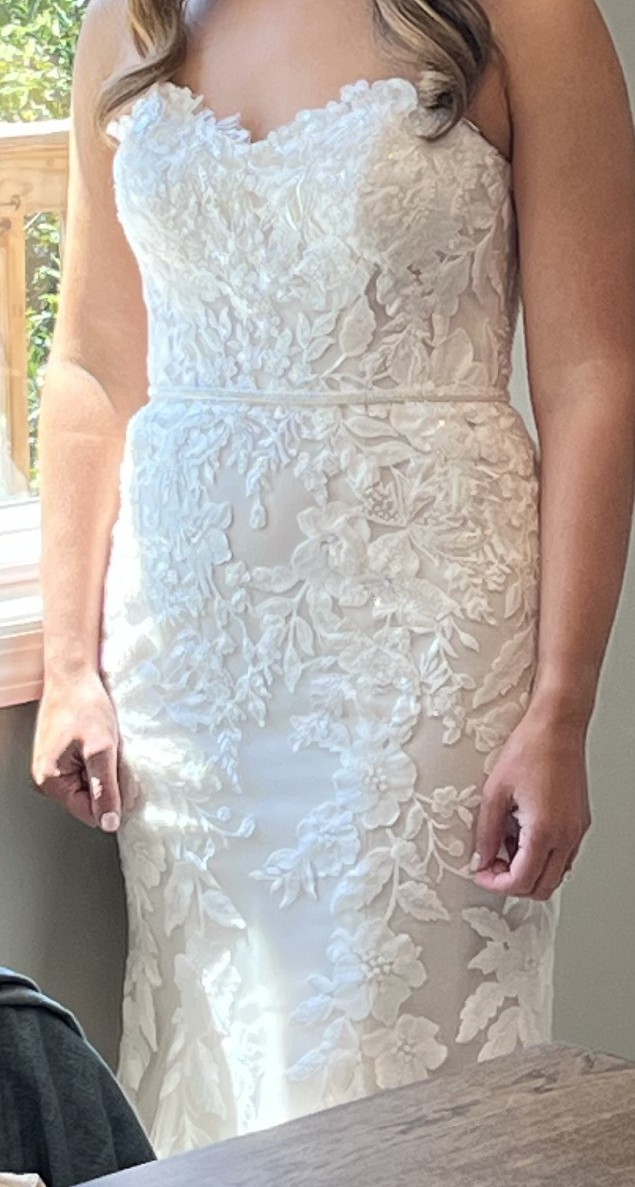 The exquisite ivory fabric is adorned with delicate beading and embroidery, adding just the right amount of sparkle to your ceremony. The floor-length design flows beautifully, allowing you to twirl and dance the night away, while the strapless silhouette keeps it effortlessly chic. I also have a lovely belt (retail $500) that complements the dress perfectly, completing the entire bridal ensemble.