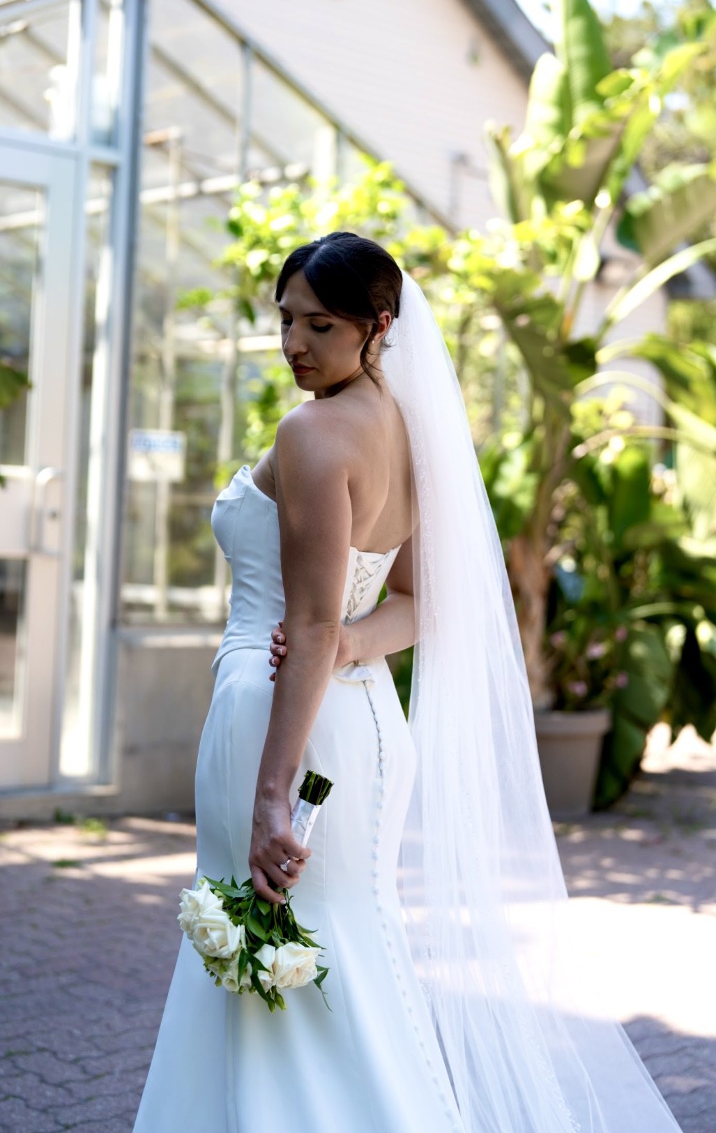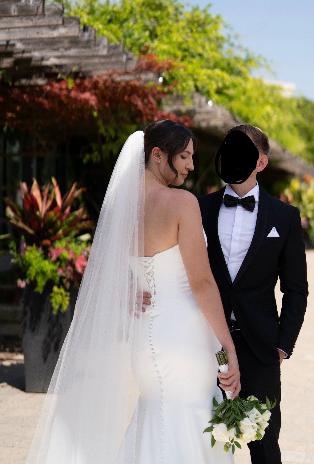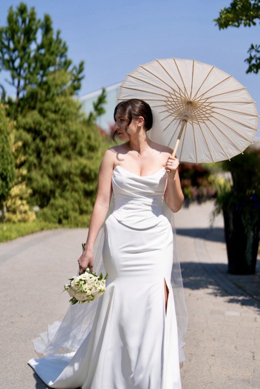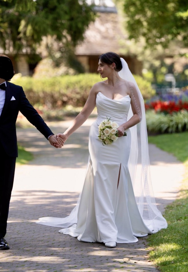 Will sale with veil (retail price $600) cathedral length. Veil has hand beaded pears all over the edges. Beautiful corset dress that is figure hugging and classy. Comes with shoulder straps that can be attached as per the last photo. Very supportive bust as the corset is adjustable. Has a slit on the left side. It’s all one piece, with a corset top. Dress is dry cleaned and ready for another new bride! Please message for any question :)