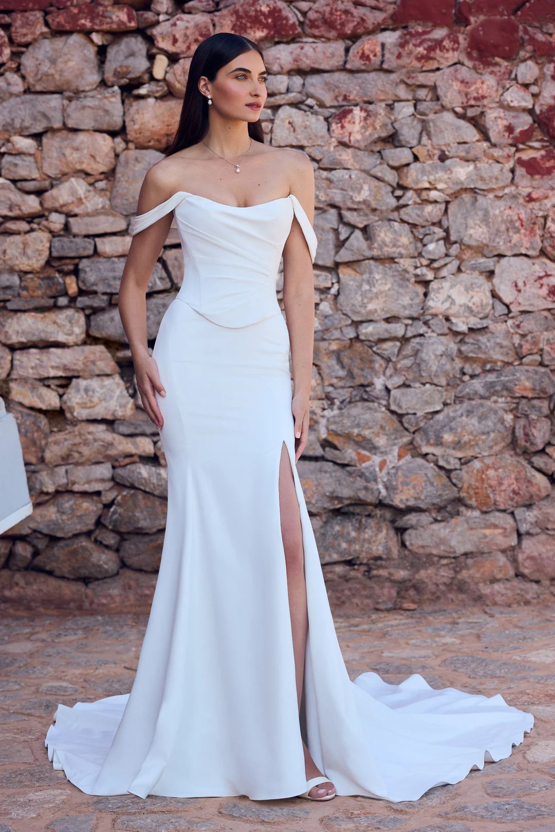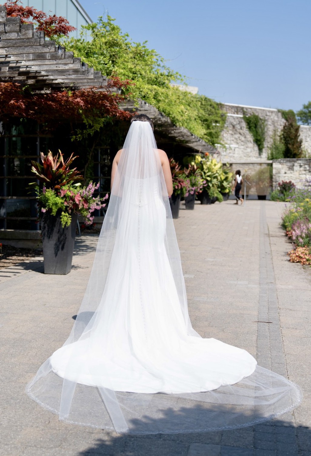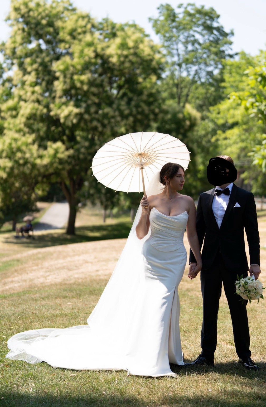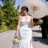 Will sale with veil (retail price $600) cathedral length. Veil has hand beaded pears all over the edges. Beautiful corset dress that is figure hugging and classy. Comes with shoulder straps that can be attached as per the last photo. Very supportive bust as the corset is adjustable. Has a slit on the left side. It’s all one piece, with a corset top. Dress is dry cleaned and ready for another new bride! Please message for any question :)