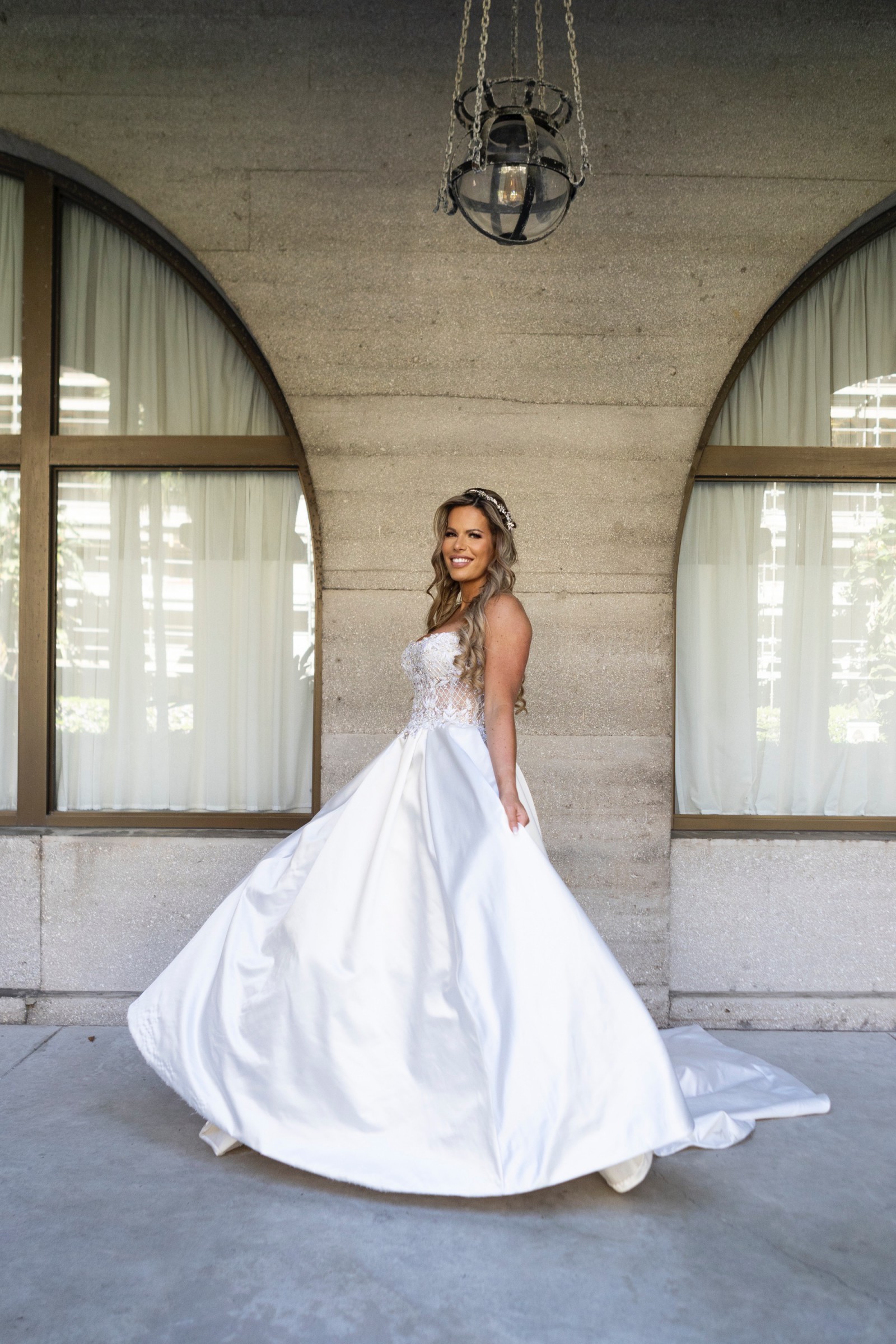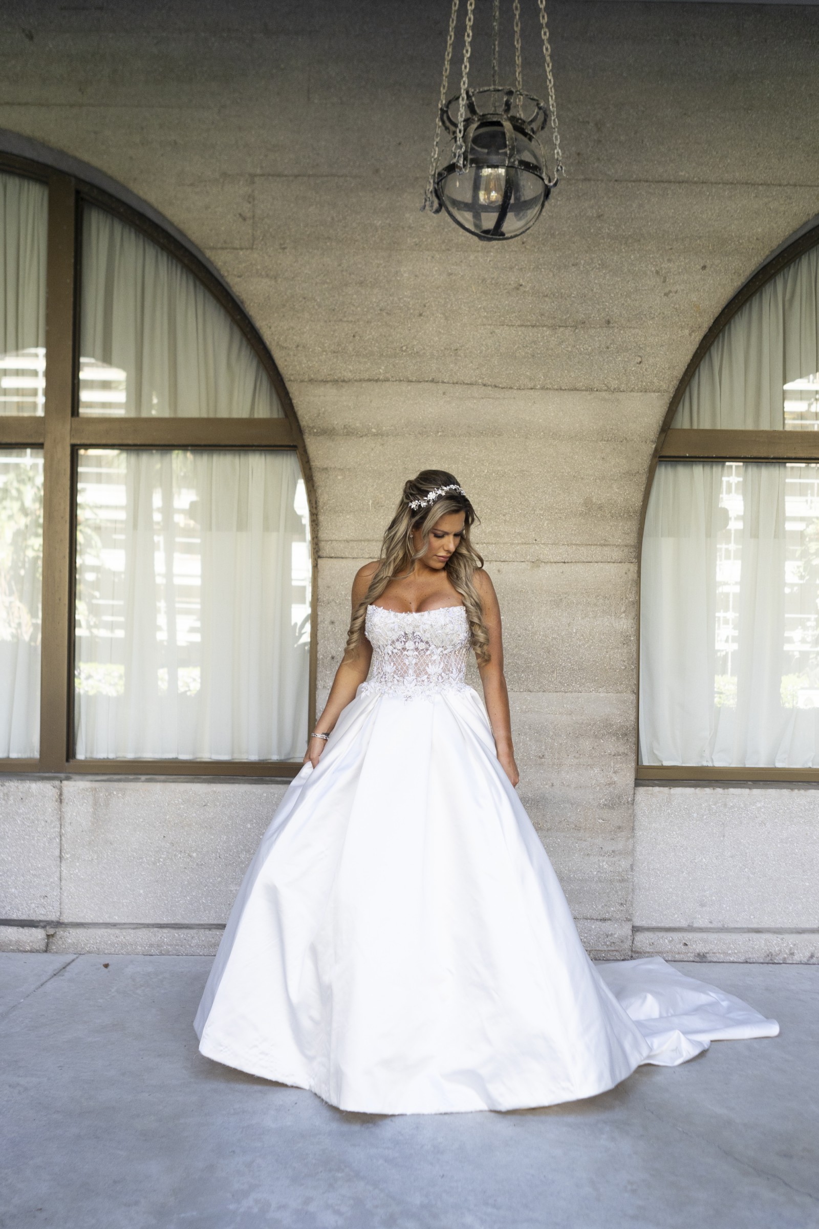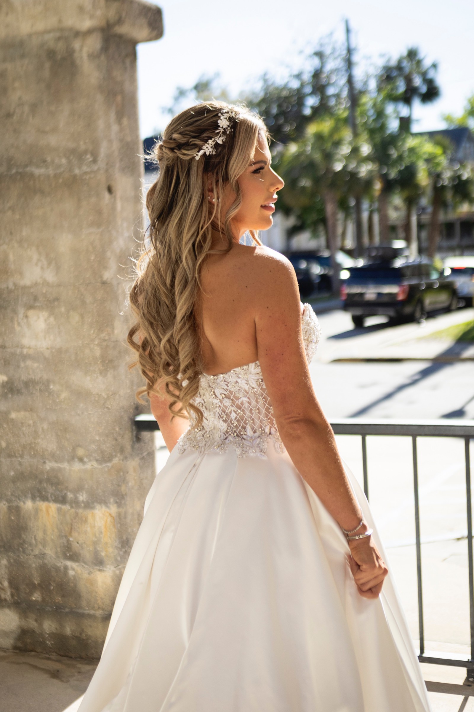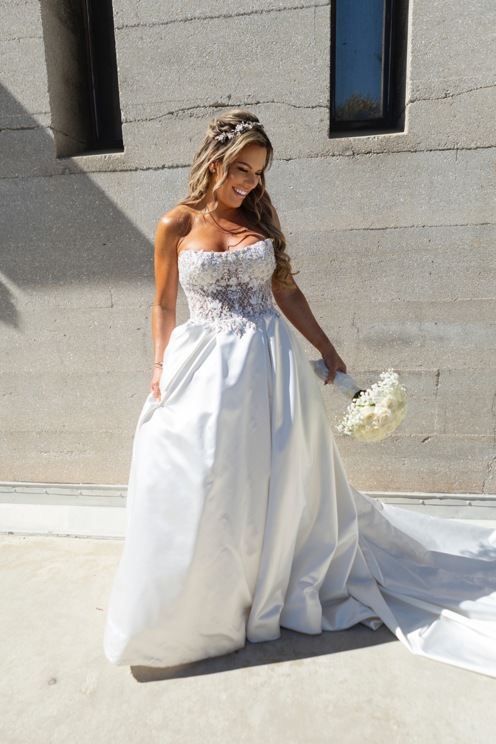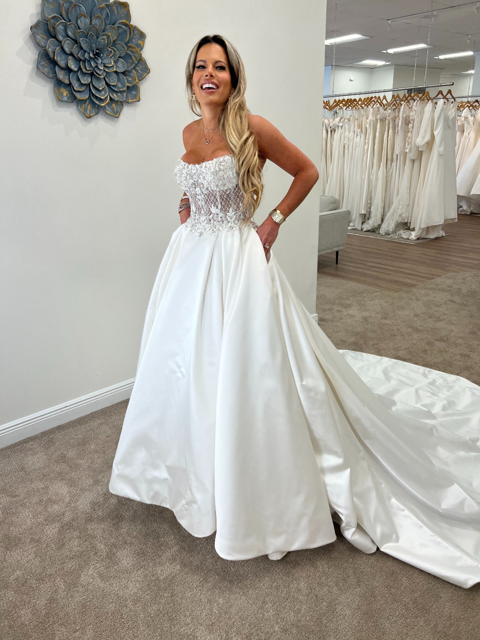 One of the highlights of this gown is its exquisite beading and crystal embellishments that catch the light with every movement. The backless design adds a touch of allure, while the strapless construction creates a timeless and sophisticated look. You'll love the unexpected, yet incredibly practical, feature of pockets—perfect for keeping small essentials close at hand during your celebration.