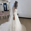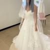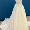 • Romantic floral lace appliqué across bodice, skirt, and train
