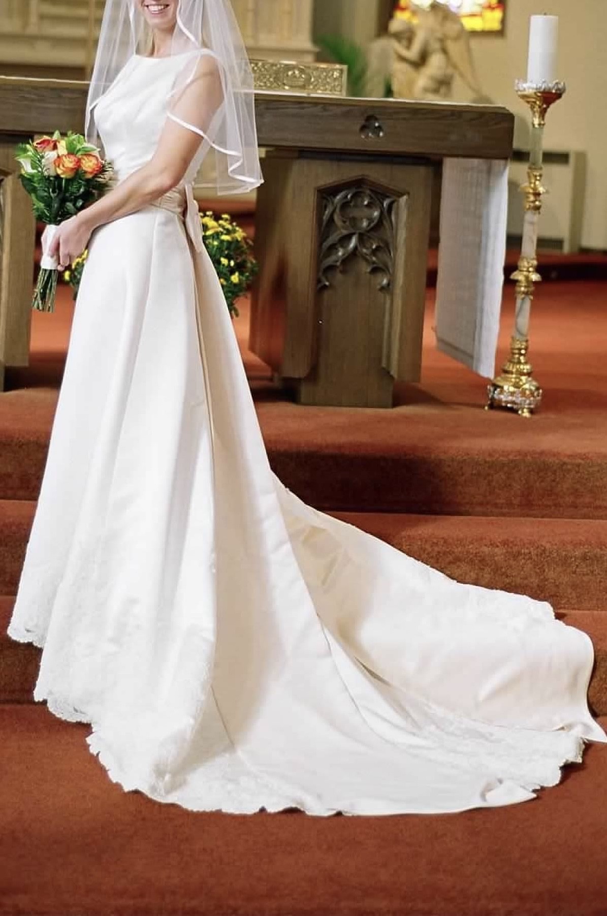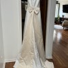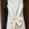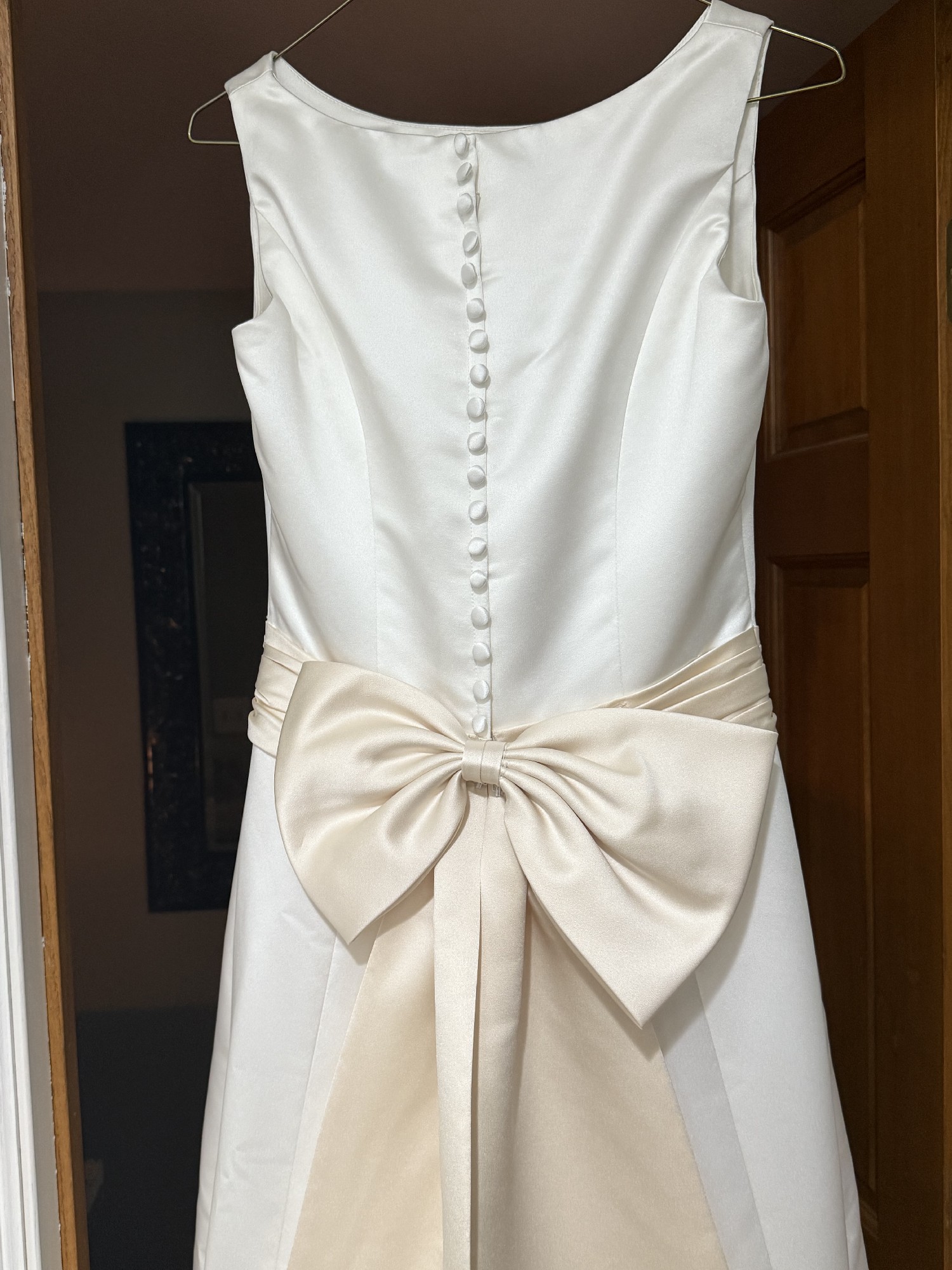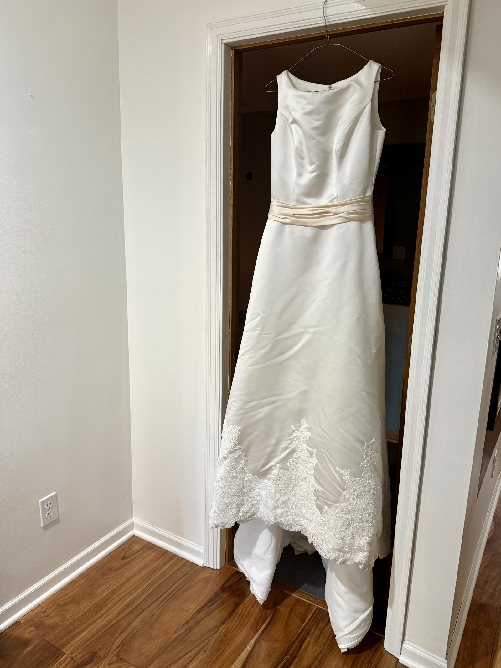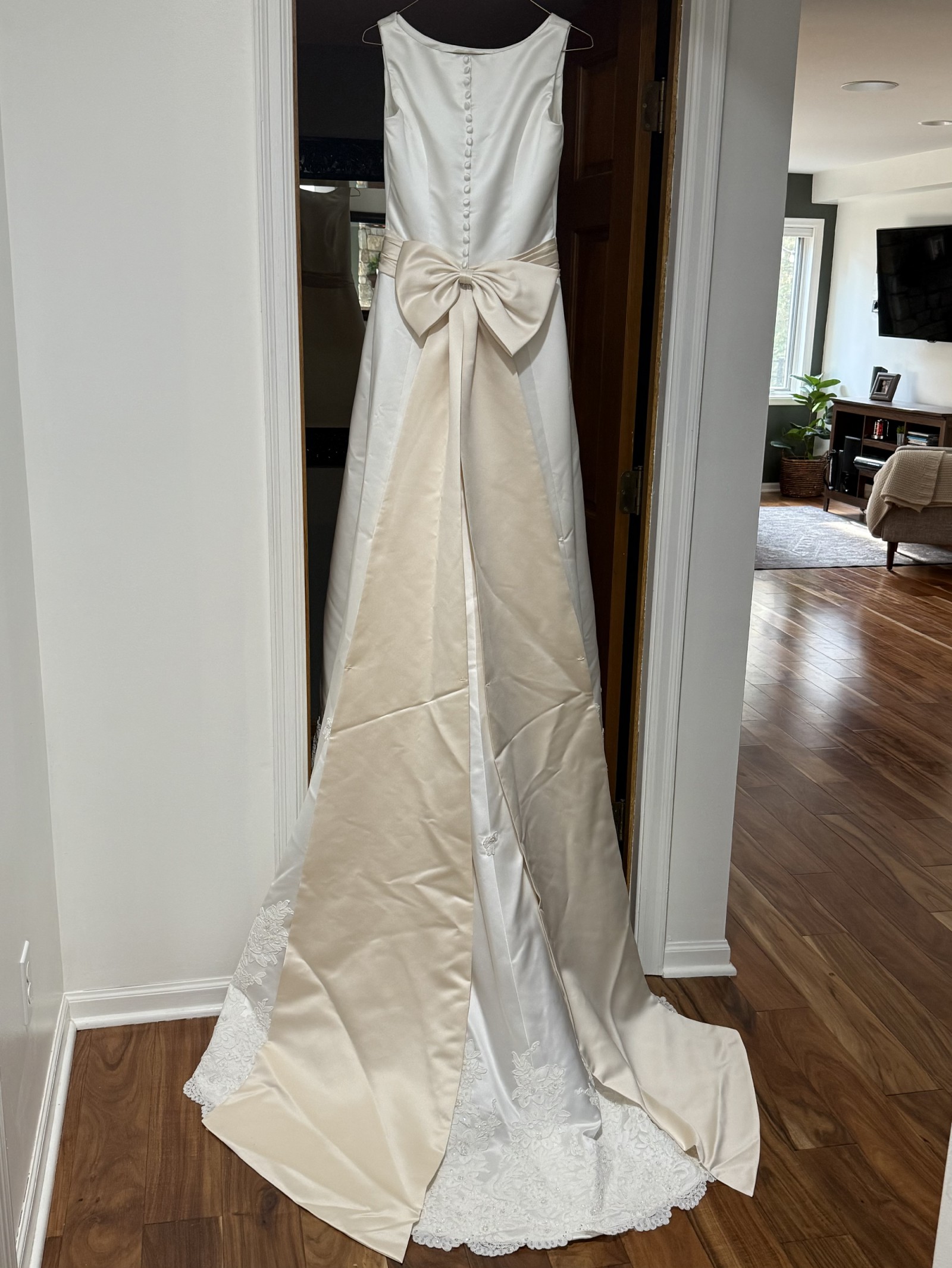 Beautiful ivory colored boatneck dress that shows off waist with champagne colored waist sash that is a bow in the back, with the ends of the bow flowing all the way down the long train. Floor length beaded lace bottom provides rich details to a classic silhouette and Audrey Hepburn style dress. Already bustled to hold the train up during the after party so you can dance the night away. Zip up back makes for an easy on/off with the buttoned back appearance. Like new. Only worn for a few hours and immediately dry cleaned and stored in a wedding gown sealed bag in a clean smoke-free home.