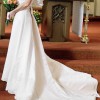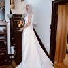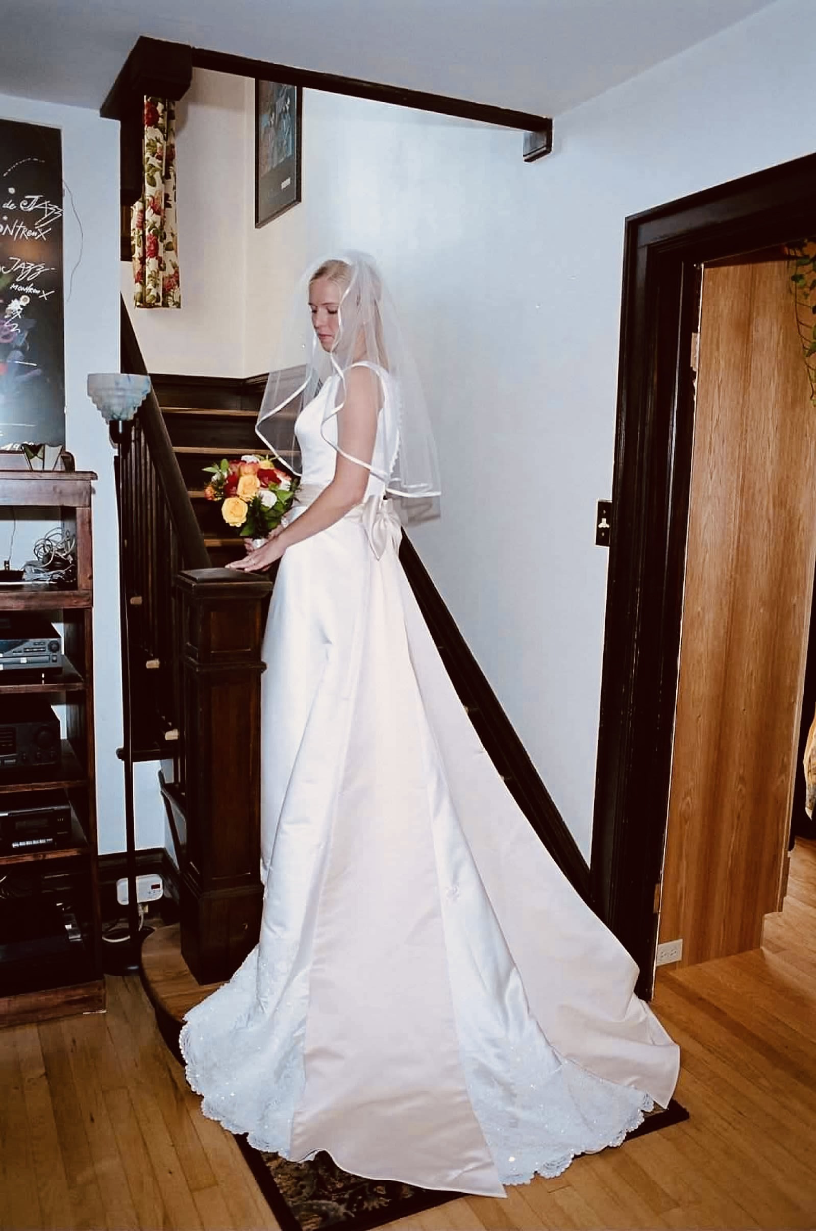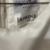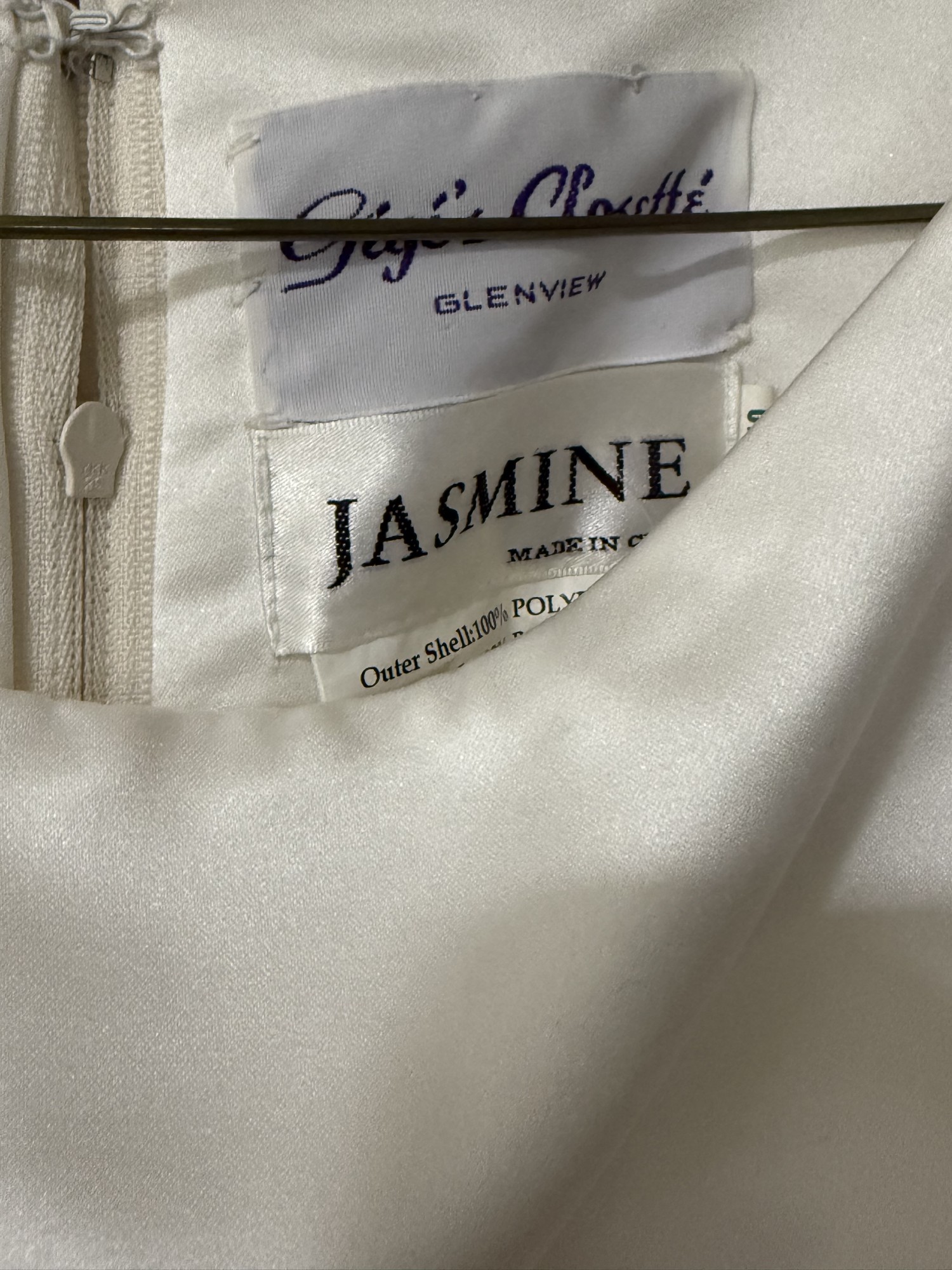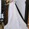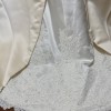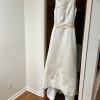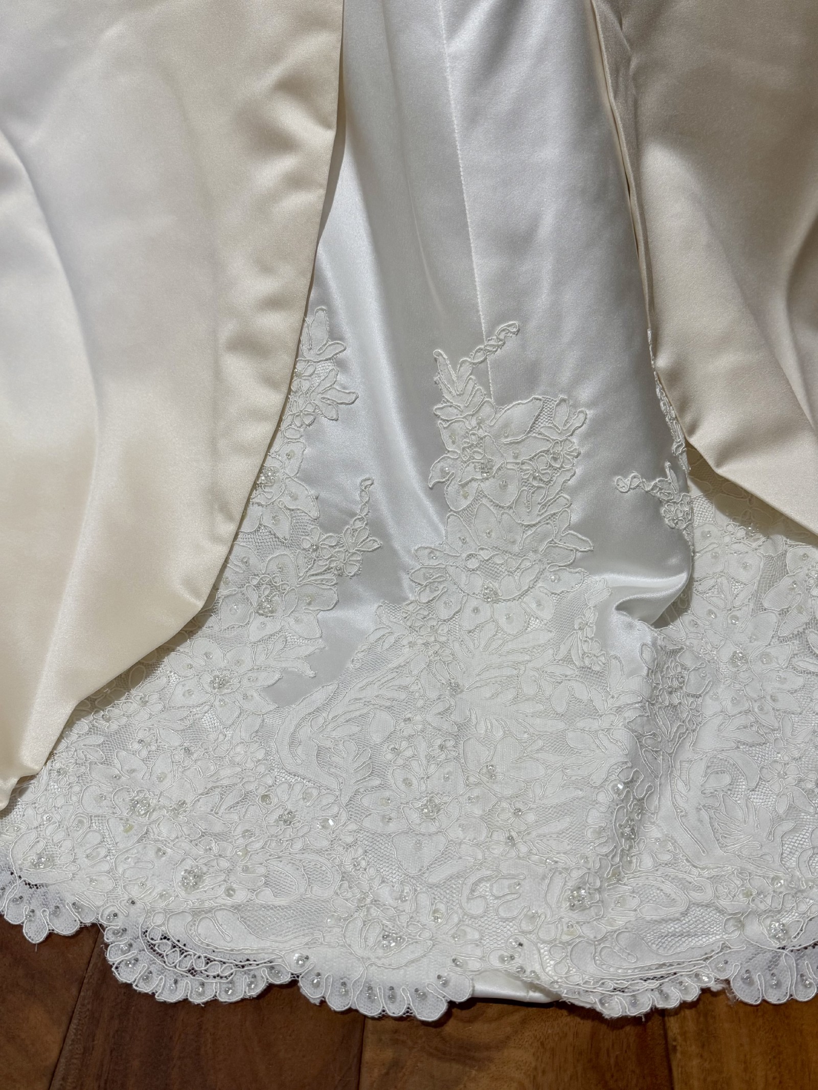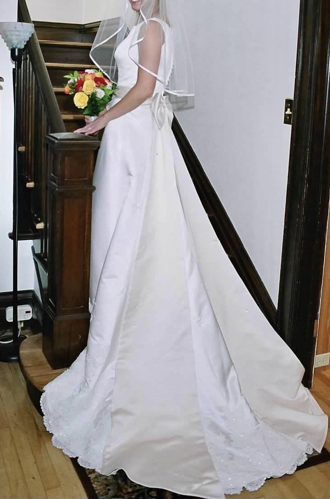 Beautiful ivory colored boatneck dress that shows off waist with champagne colored waist sash that is a bow in the back, with the ends of the bow flowing all the way down the long train. Floor length beaded lace bottom provides rich details to a classic silhouette and Audrey Hepburn style dress. Already bustled to hold the train up during the after party so you can dance the night away. Zip up back makes for an easy on/off with the buttoned back appearance. Like new. Only worn for a few hours and immediately dry cleaned and stored in a wedding gown sealed bag in a clean smoke-free home.