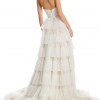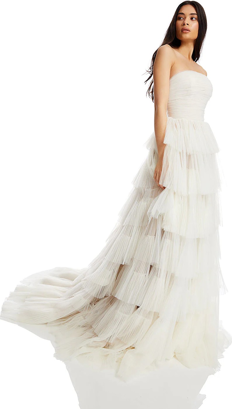 Romance reigns supreme with Agata. Featuring a structured, strapless bodice constructed from a lightweight satin base and directional tulle for a close, supportive fit, it falls into a full and dramatic tiered tulle skirt. Choose the bright ivory and mushroom colourway for an even more modern look.
