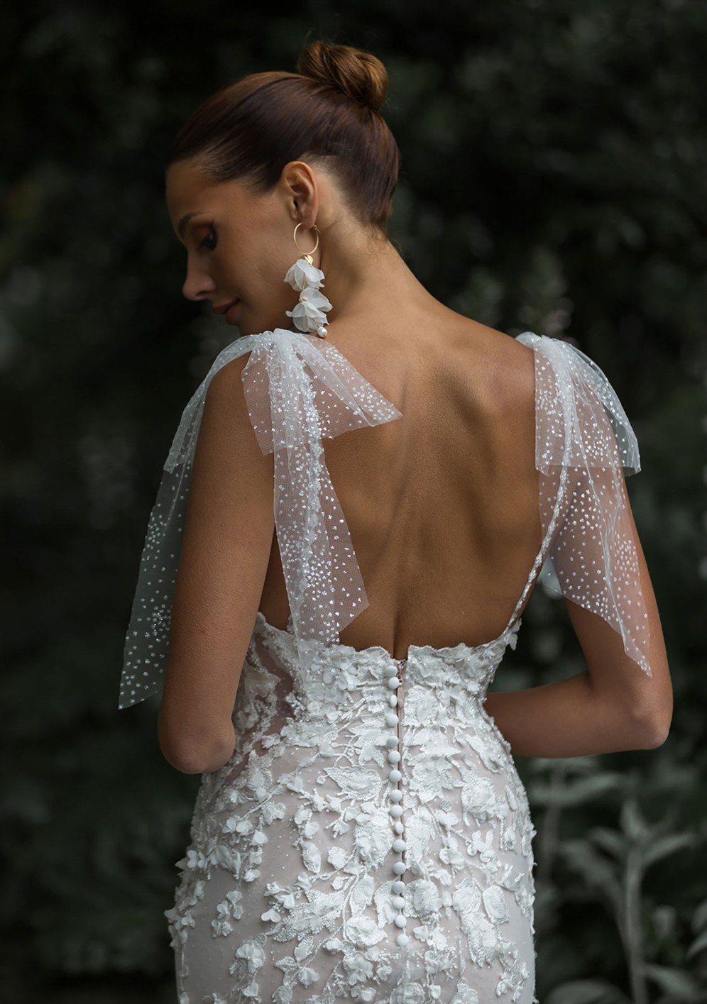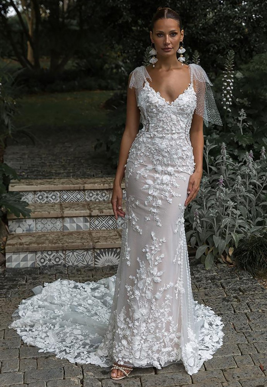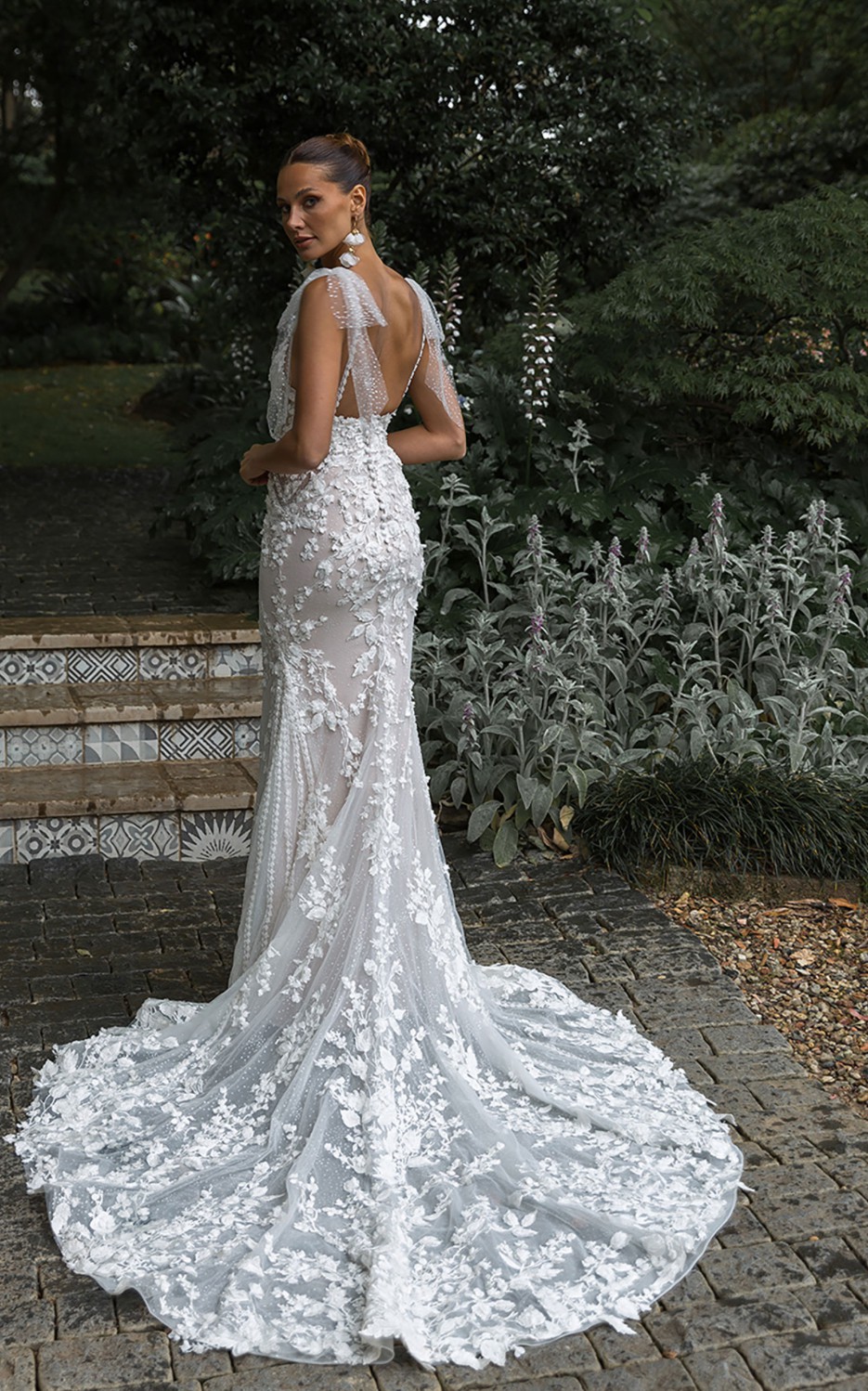 The exquisite details of this dress set it apart. Adorned with intricate 3D flowers, beading, sequins, and charming bows, it catches the light and sparkles from every angle. The low back adds a touch of allure, making it the perfect choice for a bride who wants to feel both beautiful and confident.