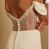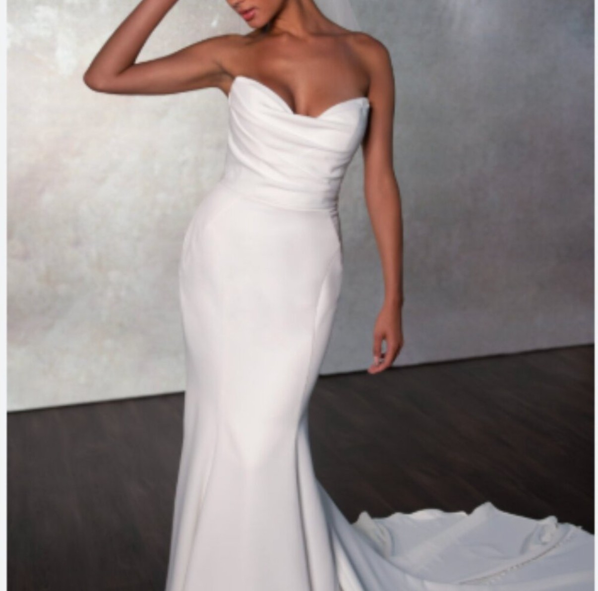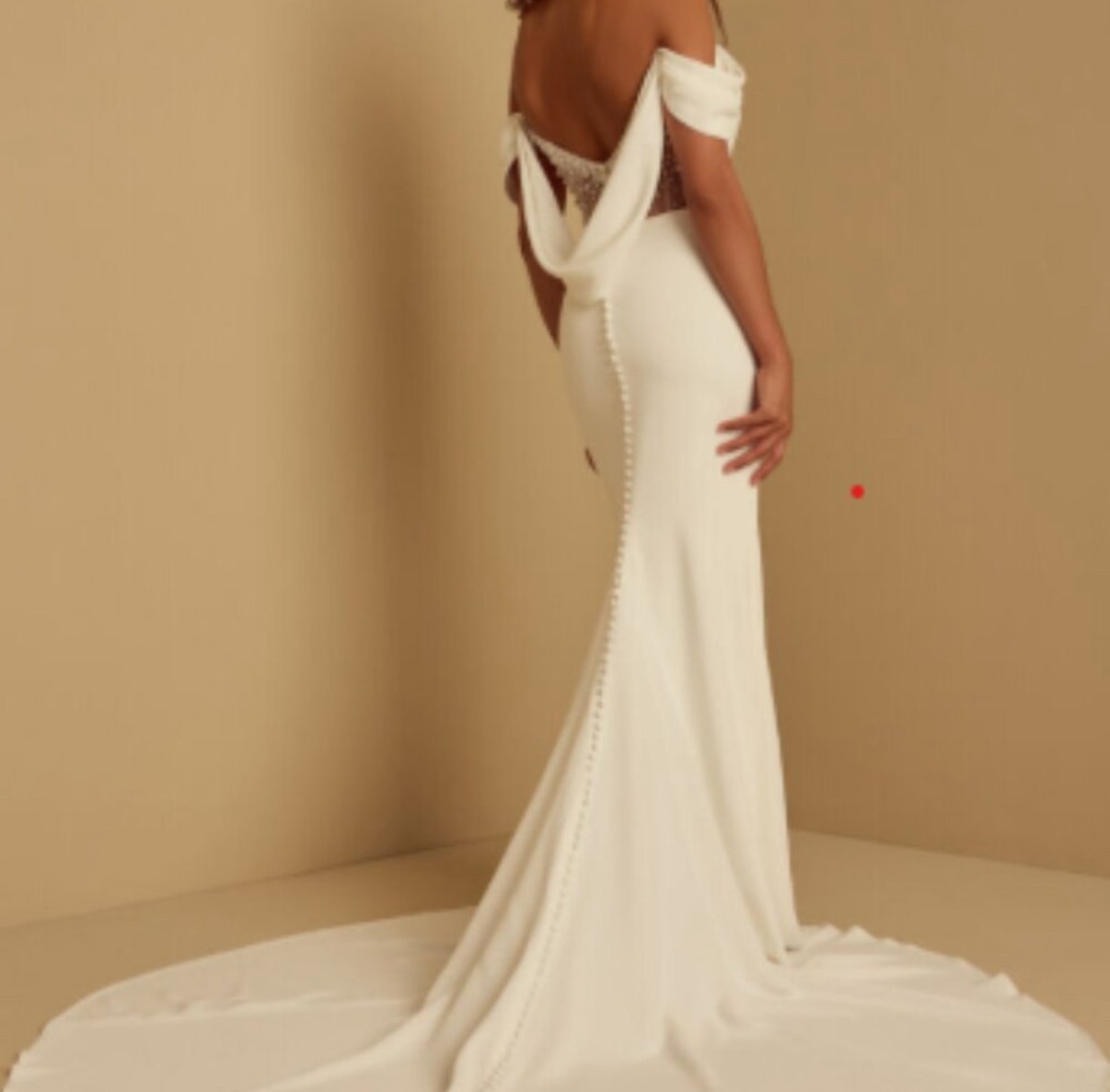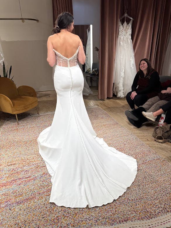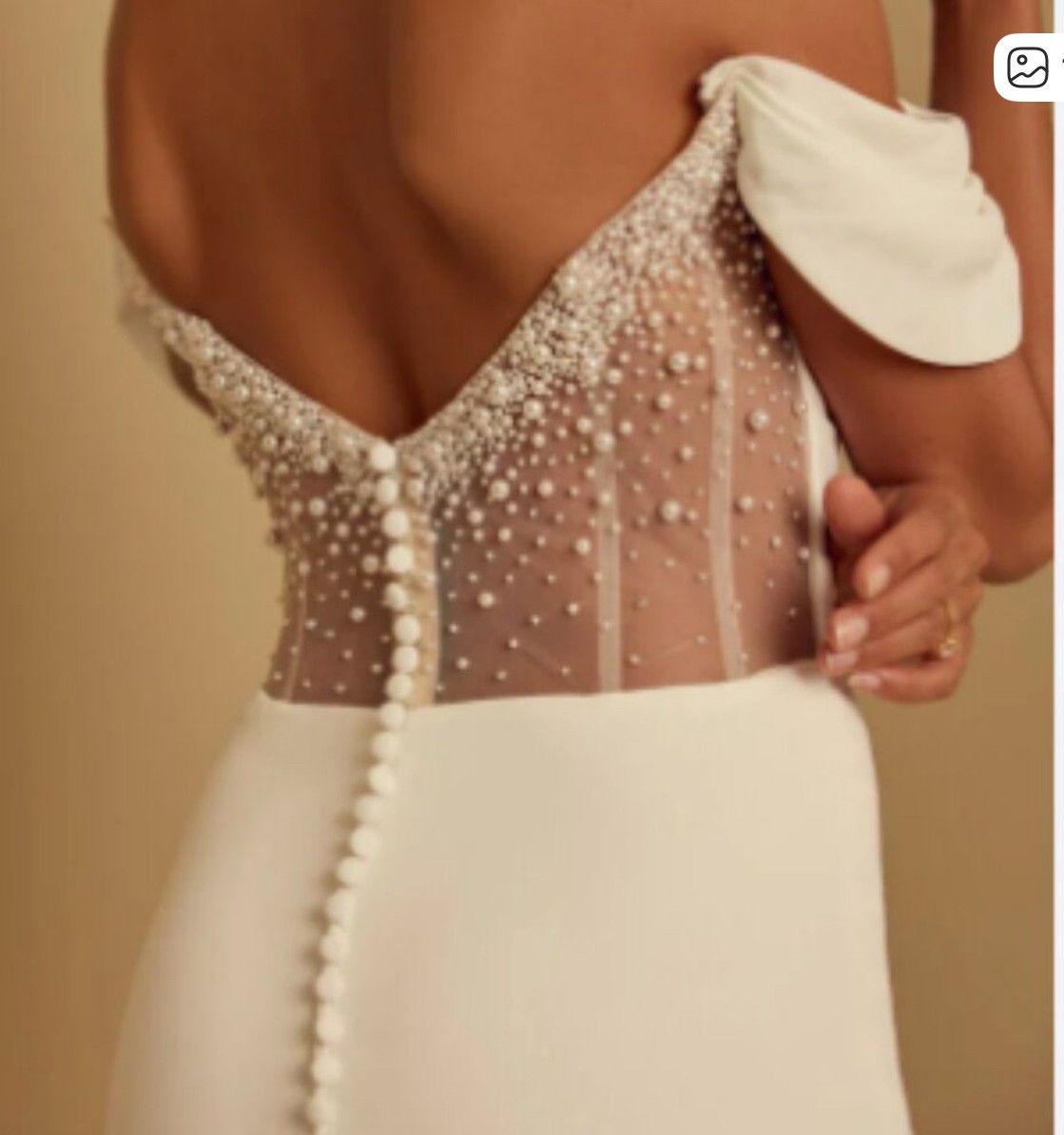 This dress is gorgeous, I fell in love with the pearl illusion back. Unfortunately the size wasn’t right for me and the dress is now discontinued. This is a crepe material, with a sheer pearl back and beautiful buttons all the way down. *The sleeves are not included.