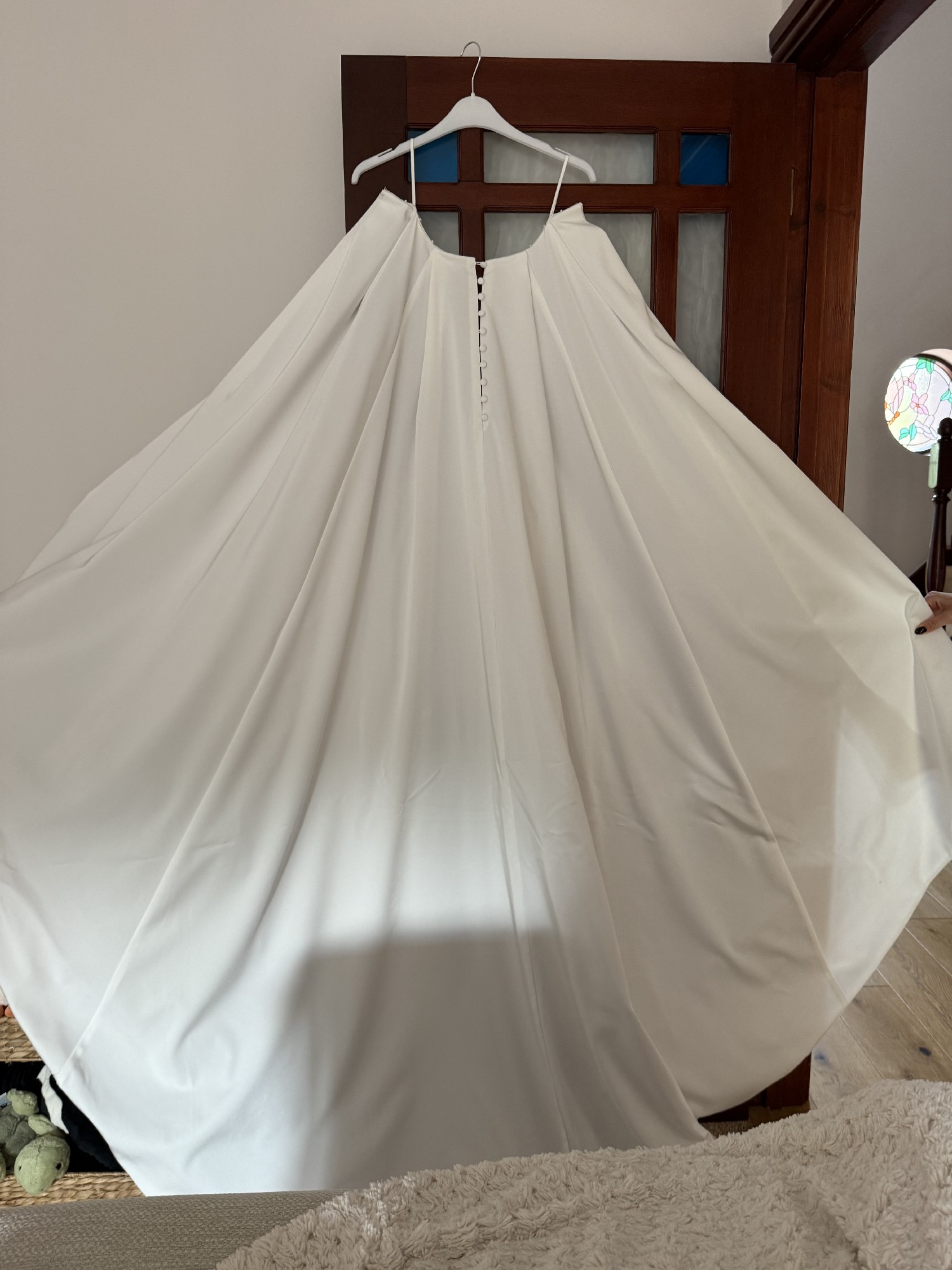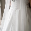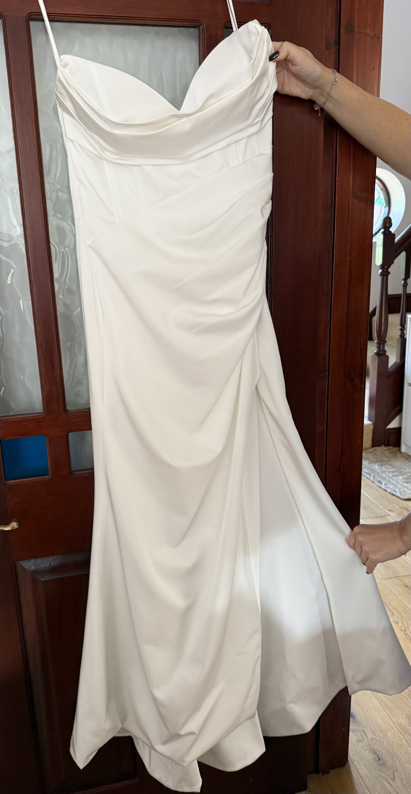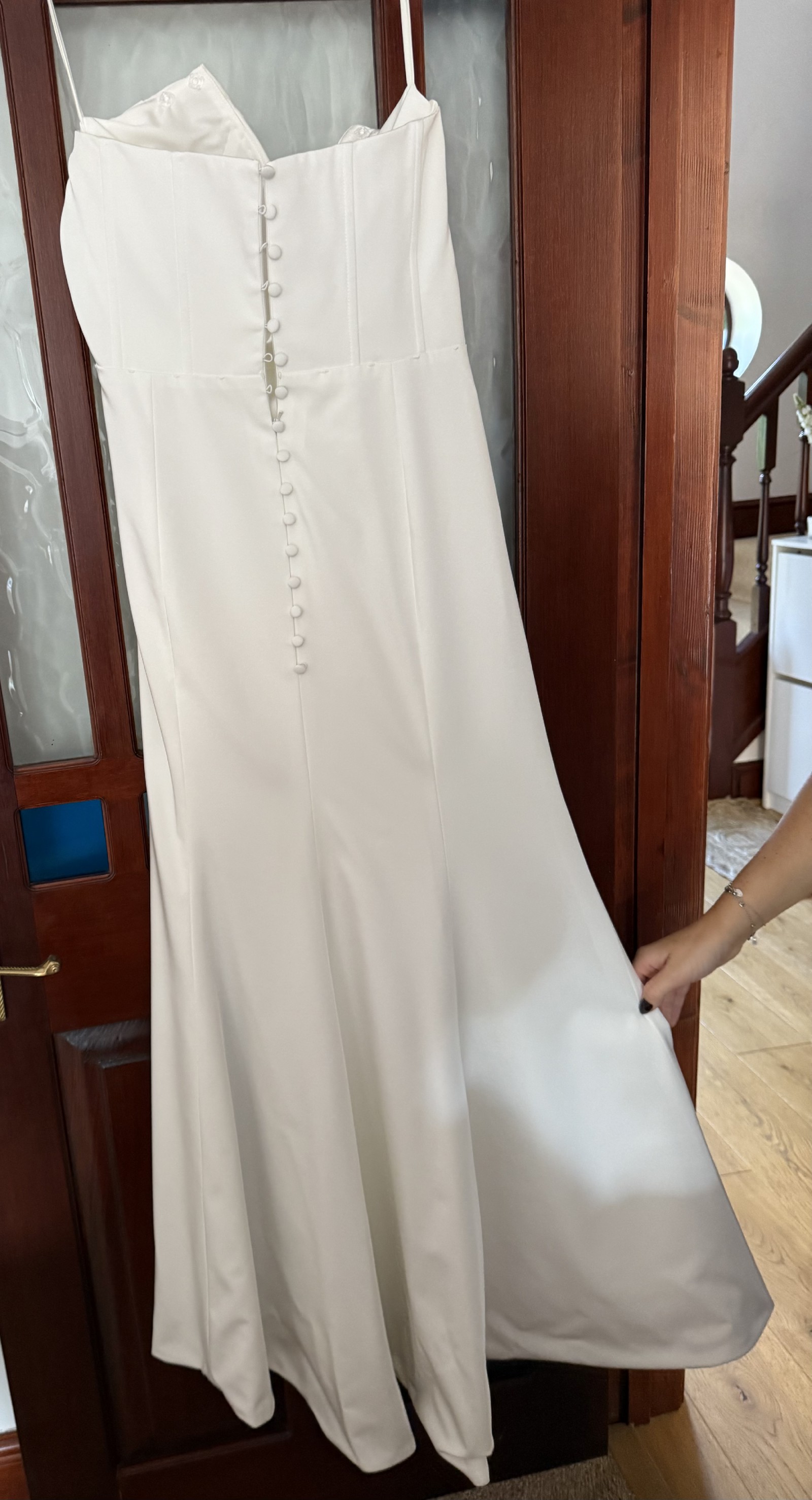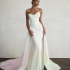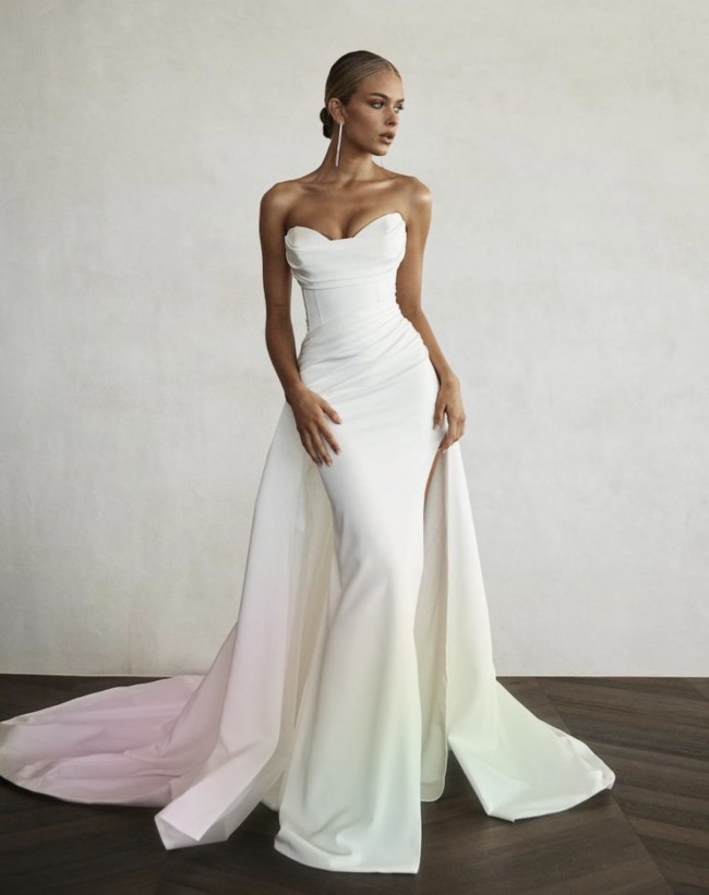 Two looks in one with the stunning crepe Huntleigh gown by Jane Hill. Signature sweetheart strapless gown, fit and flare silhouette with a high side leg slit complete with a full detachable back skirt train.