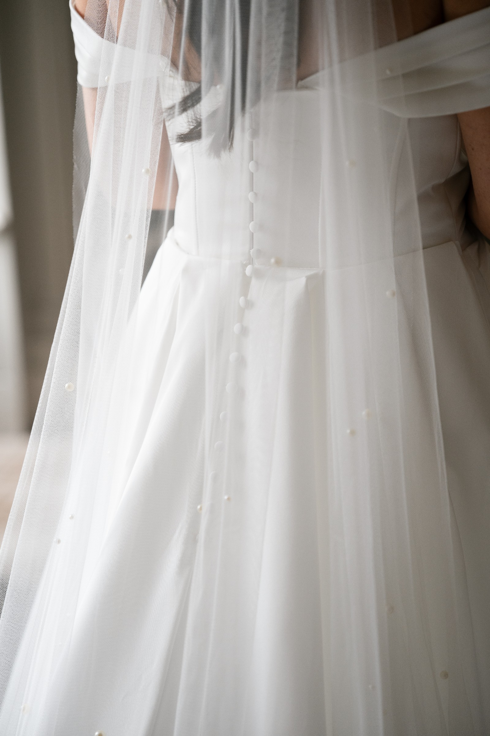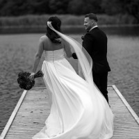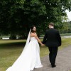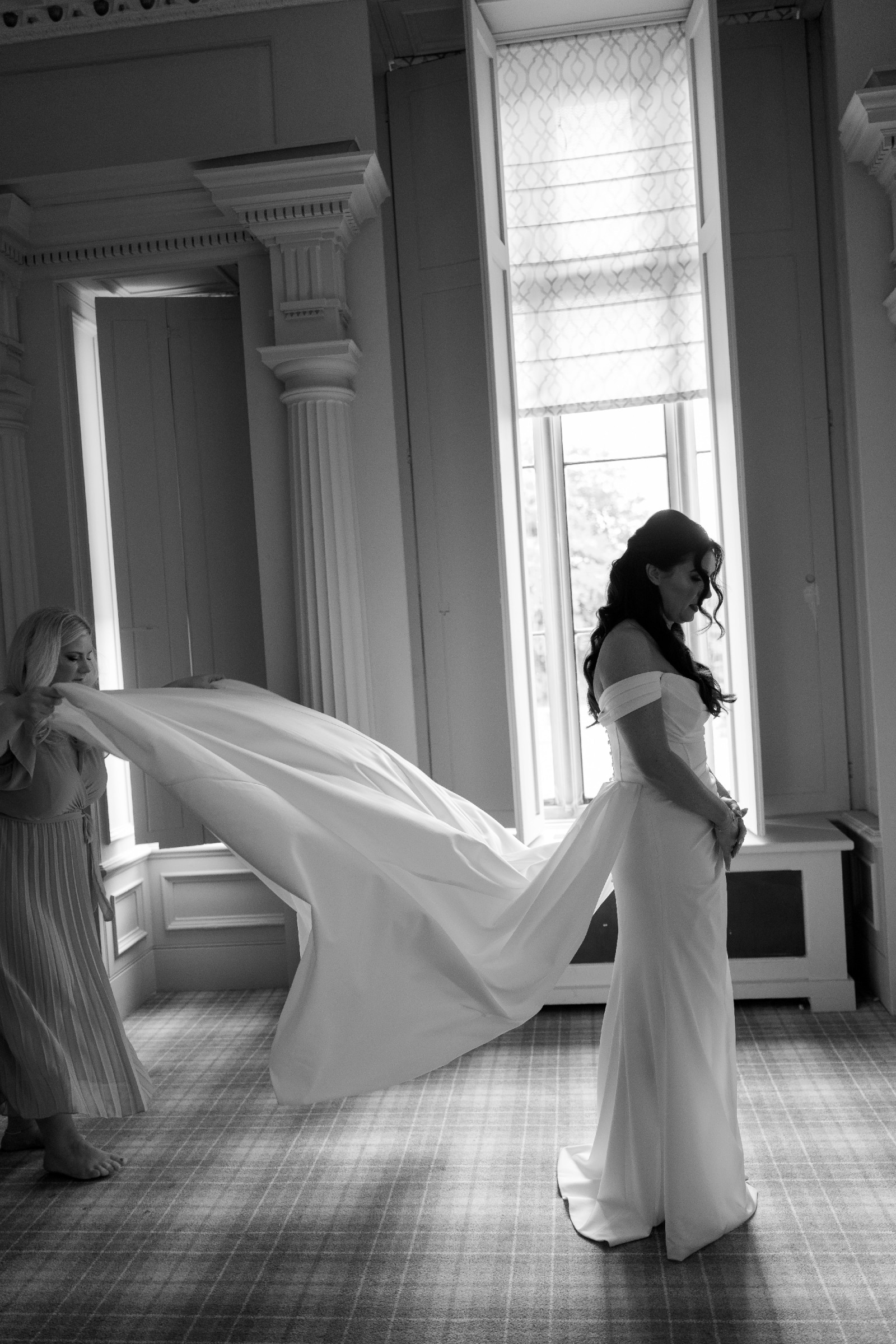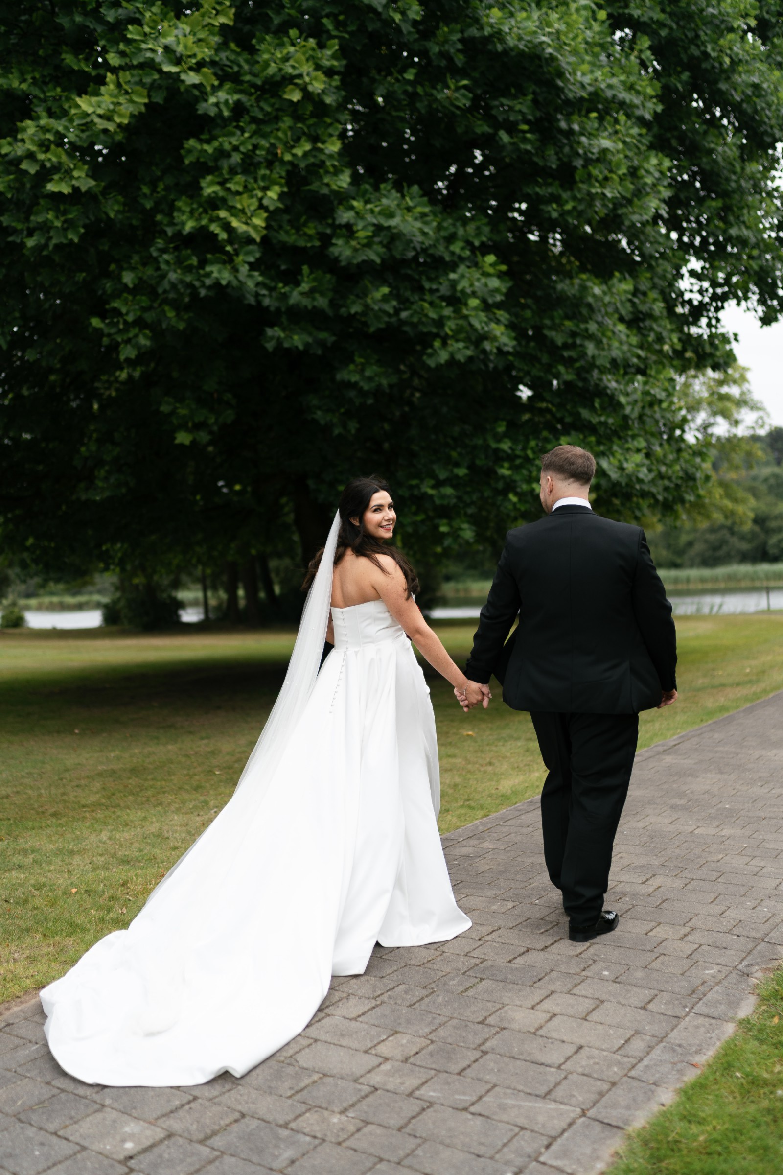 Two looks in one with the stunning crepe Huntleigh gown by Jane Hill. Signature sweetheart strapless gown, fit and flare silhouette with a high side leg slit complete with a full detachable back skirt train.