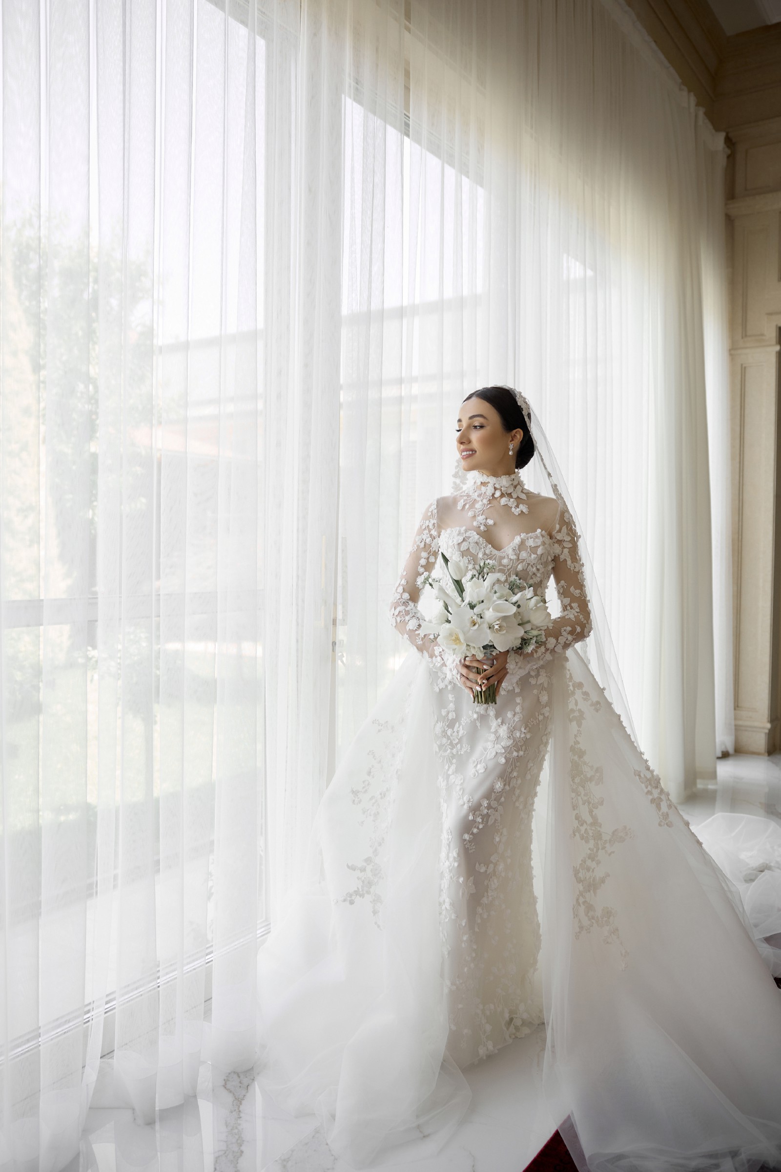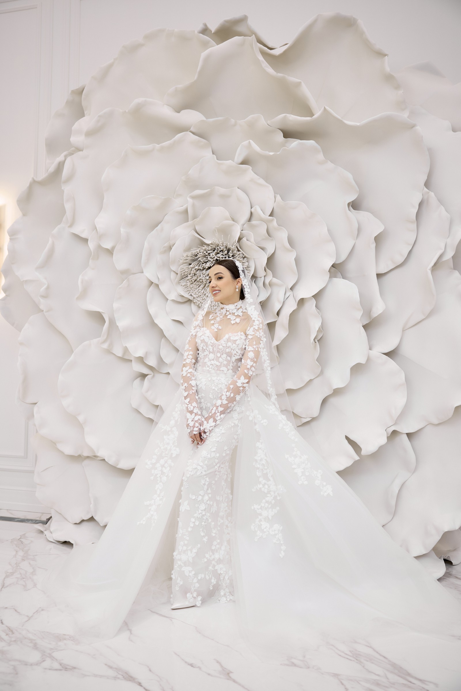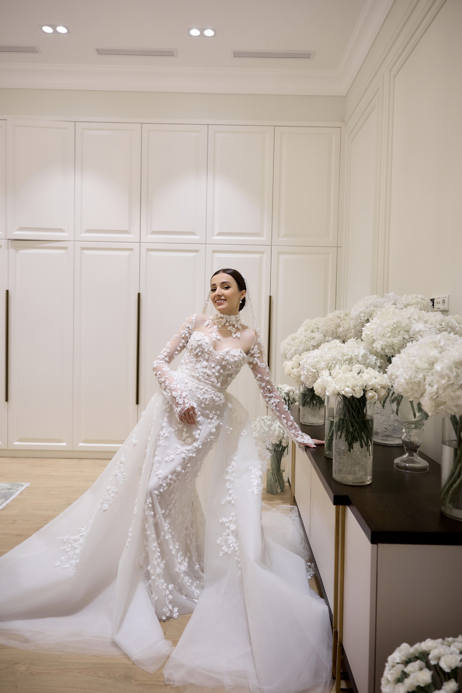 It’s a Vakko Wedding dress from new collection Spring-Summer 2025, bought at Vakko store in Istanbul, Zorlu Center. Romantic three-piece wedding ensemble consisting of a sheer embroidered bodysuit, a strapless corset dress, and a detachable overskirt. The bodysuit, with its long sleeves and high neckline, is made of semi-sheer tulle and delicately embellished with 3D floral embroidery, creating an elegant second-skin effect. The strapless corset dress provides structure and a flattering silhouette, while the detachable overskirt adds dramatic volume for the ceremony. Once removed, the look transforms into a lighter, more modern style — perfect for dancing and the evening reception. Worn once, professionally cleaned, and in perfect condition — ready to make another bride’s day unforgettable. I’m selling dress only, without veil.