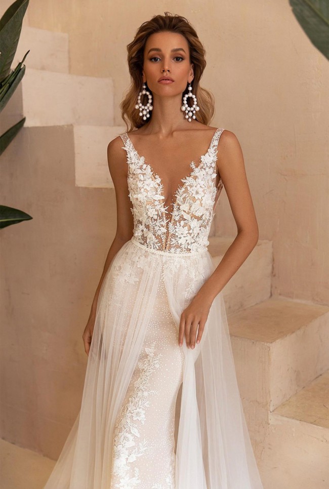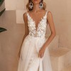 In a timeless ivory color, this gown radiates classic beauty, perfect for any wedding theme. The V-back design adds a touch of allure, making the dress just as captivating from behind as it is from the front. The exquisite craftsmanship of the fabric ensures it feels luxurious against the skin, while still being lightweight enough for dancing the night away.
