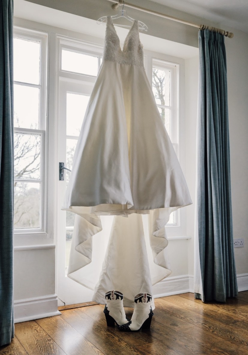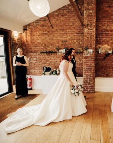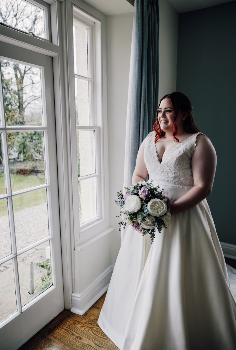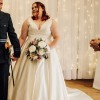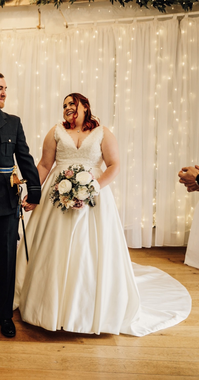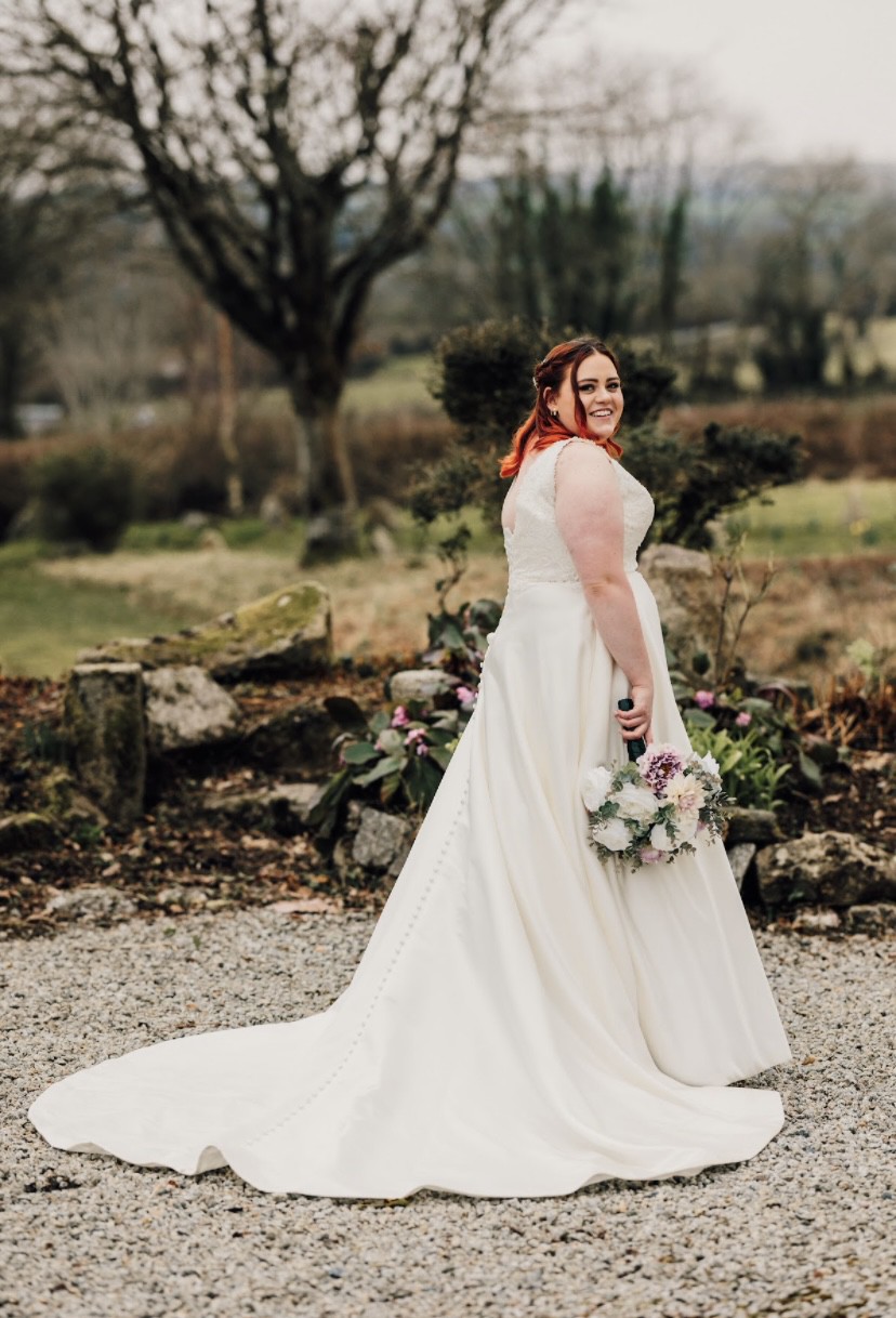 This stunning ballgown dress is everything I dreamed of for my special day. The elegant V-neckline adds a touch of sophistication while the sleeveless design allowed me to move freely and dance the night away. The corset back beautifully hugs my waist, providing a flattering silhouette that feels both magical and secure.
