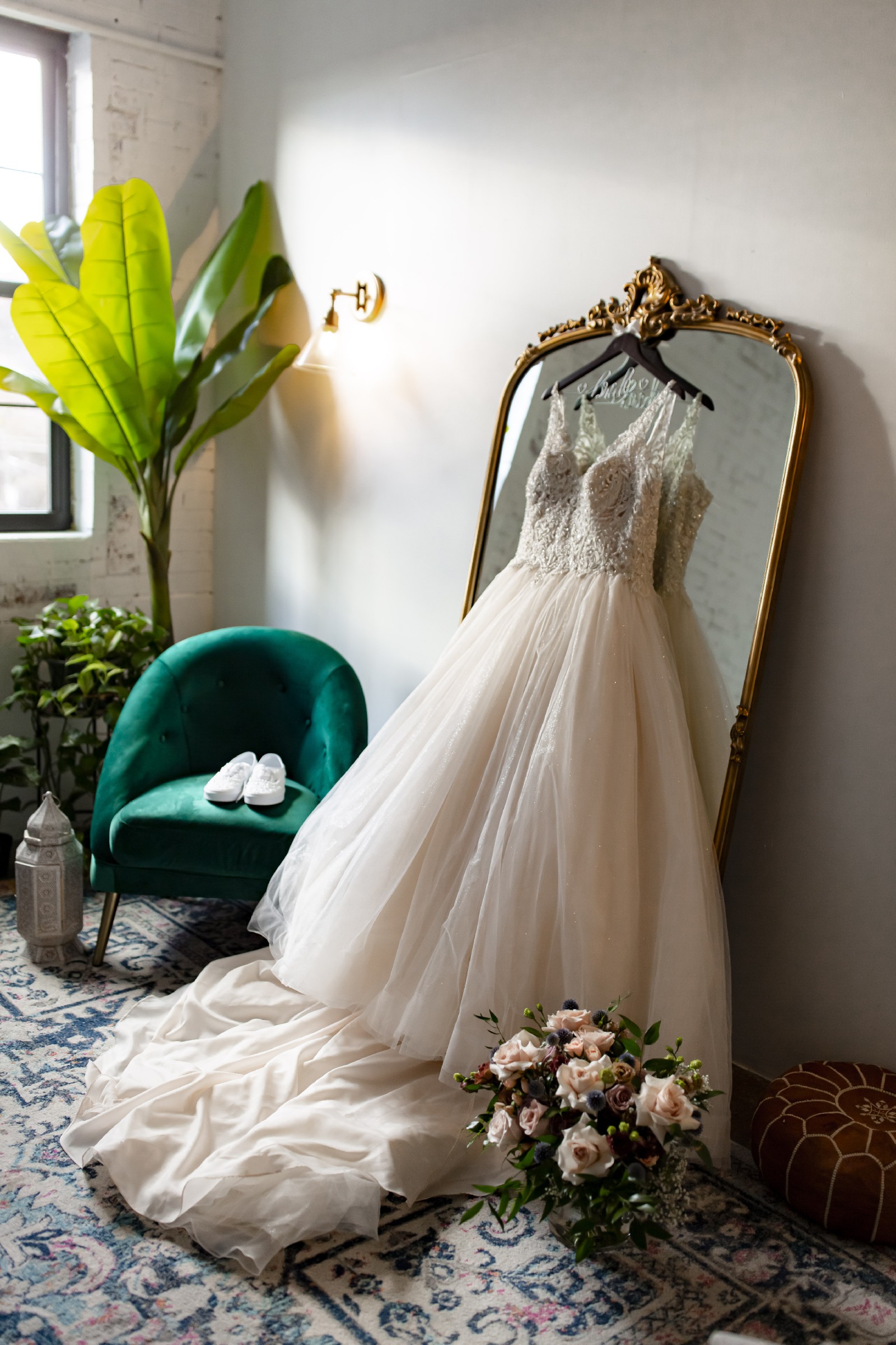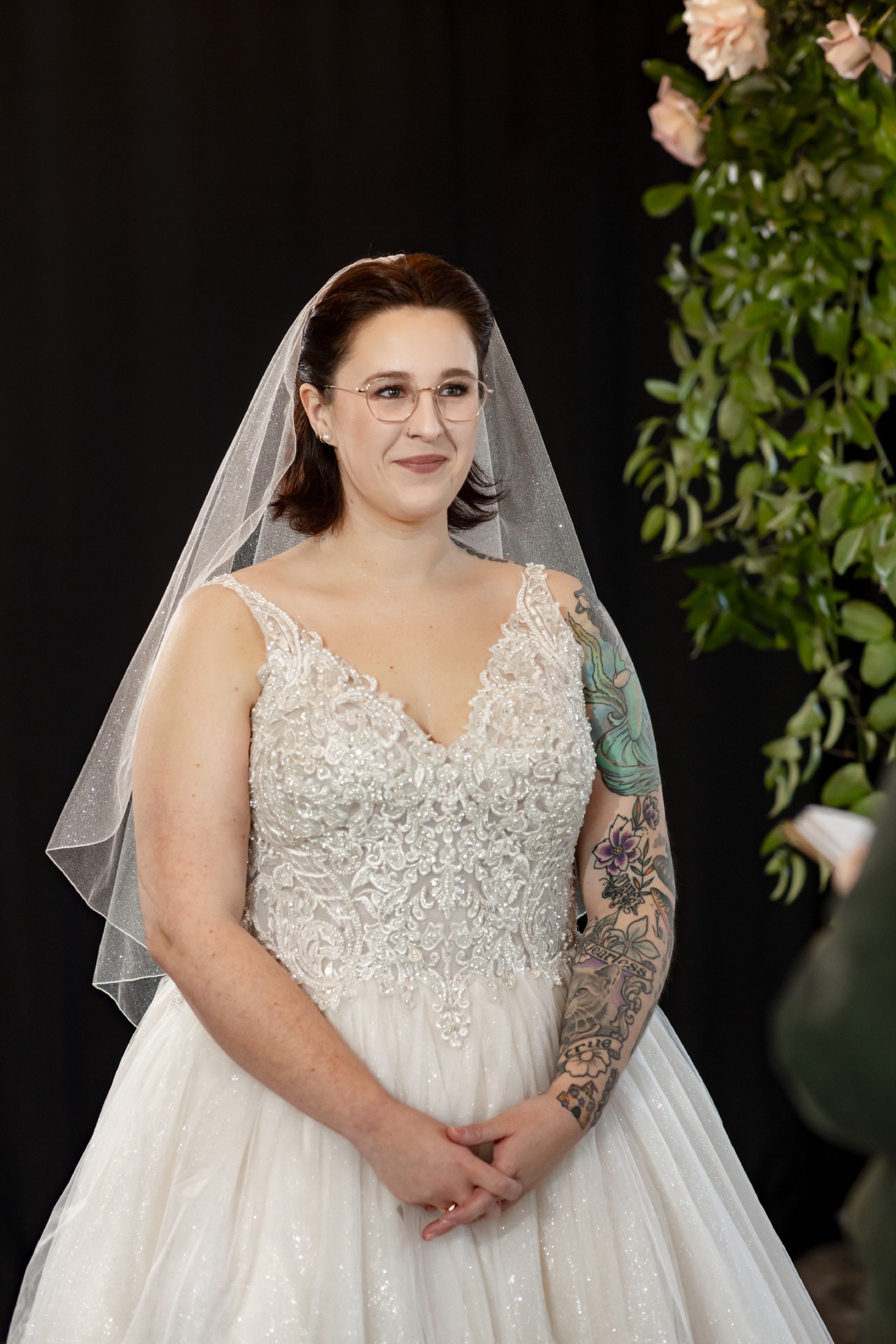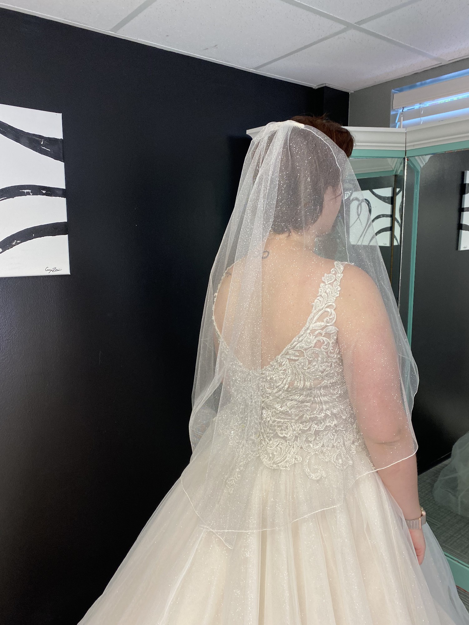 Included is a subtle glittery veil that is the perfect addition to this perfect dress.