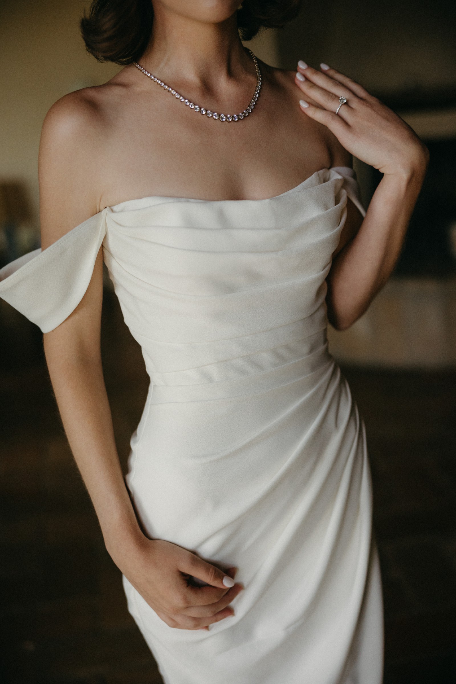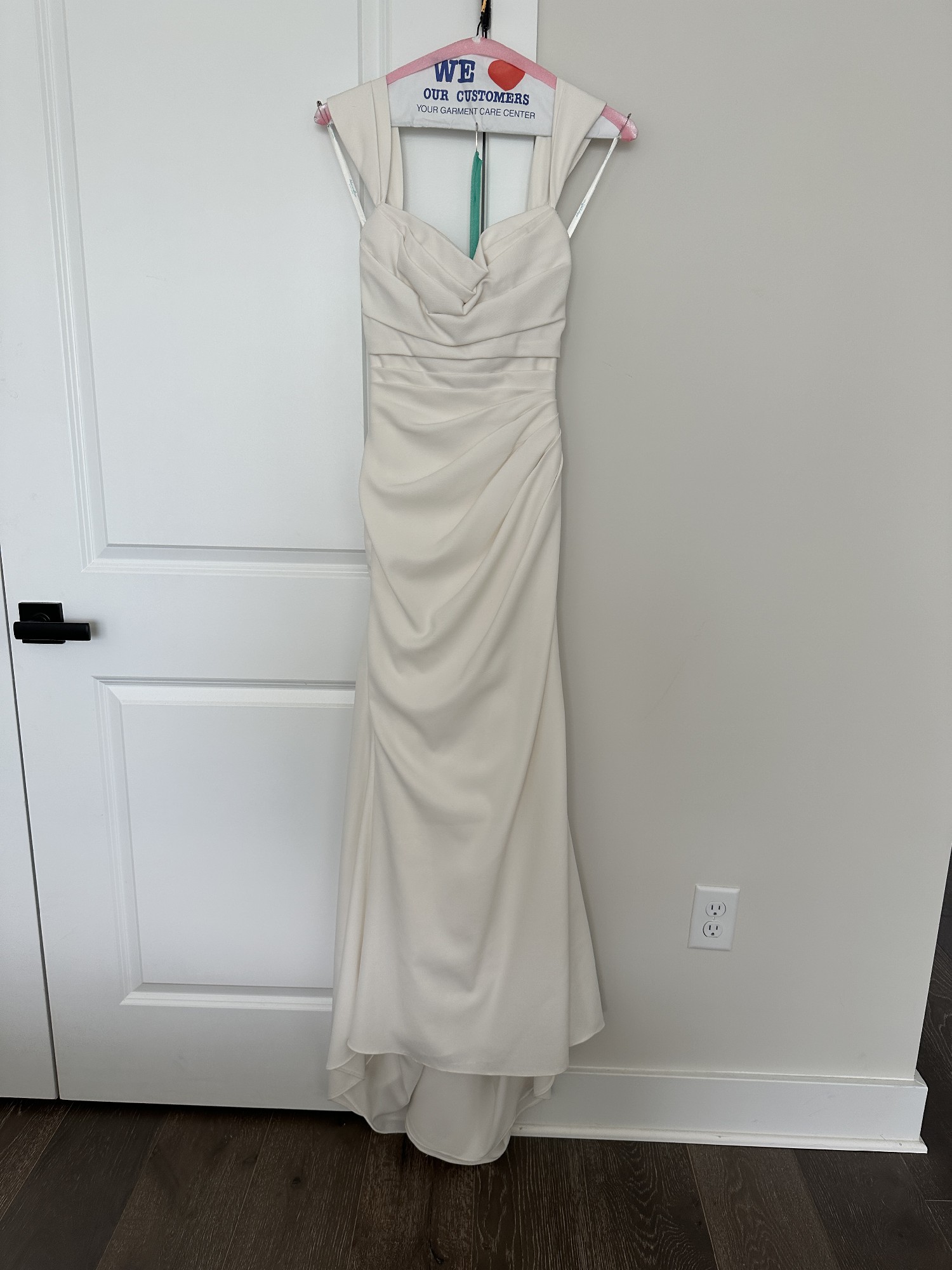 This timeless Anne Barge Naomi gown was purchased at Kleinfeld Bridal in NYC in 2024. The dress is made from crepe and was custom ordered in light ivory (instead of the standard silk white). It has a beautifully soft ivory silk liner and is very comfortable to wear. The waist was taken in to fit 23”, it was hemmed for 5’8” with shoes, and the bust taken in to fit ~30” (I wear a 32AA). For reference in the photos, I'm 5'3, and 98lbs.