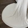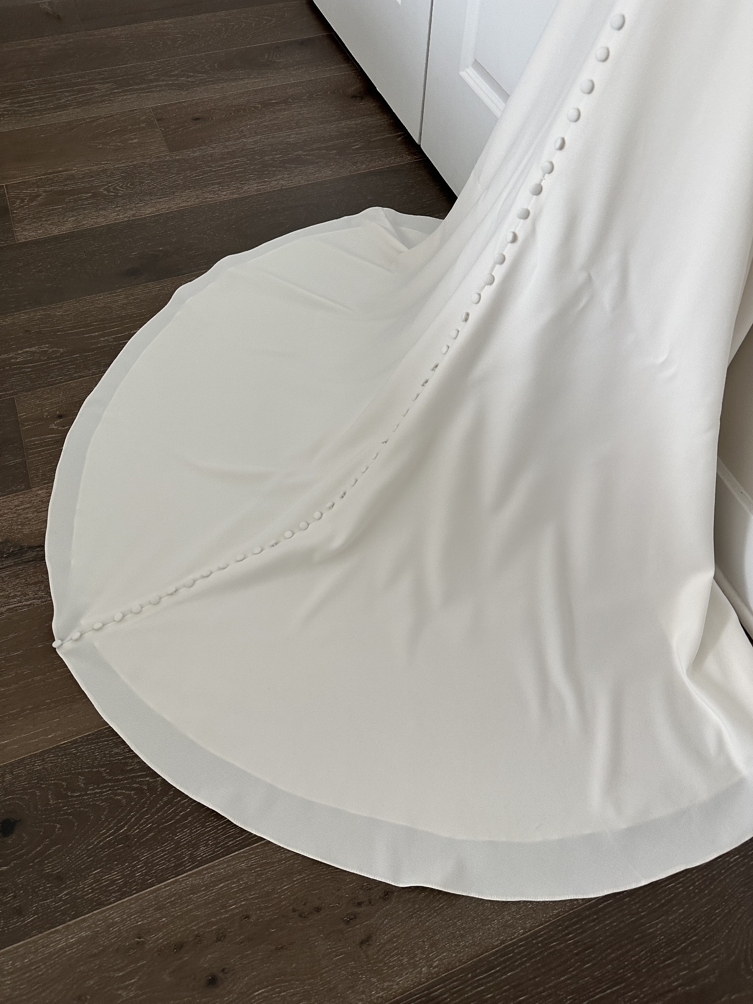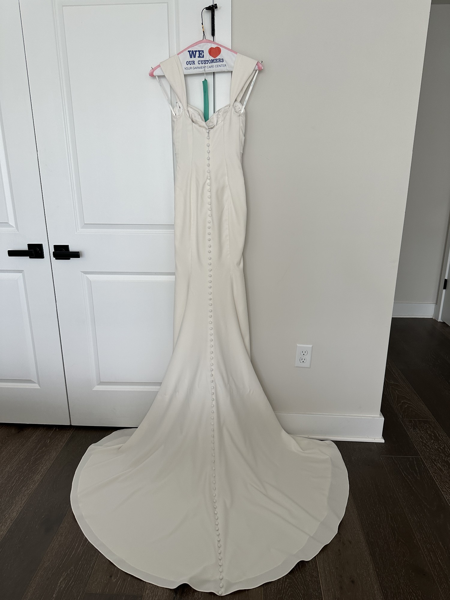 The gown was professionally dry-cleaned and in excellent condition (minor stain at the hem - shown in video - and a few very small marks on the silk liner, but these are not visible when worn) tailored to enhance its elegant, clean silhouette. Perfect for a modern yet classic bridal look. If you have any questions or need additional photos, I'm happy to accommodate any request.