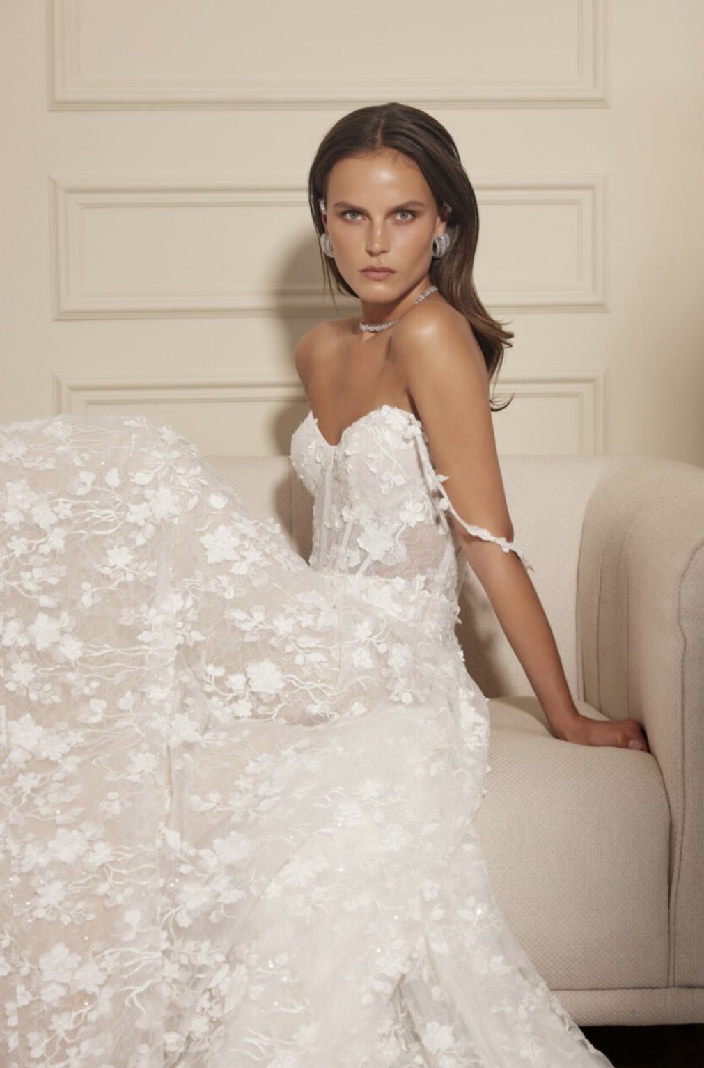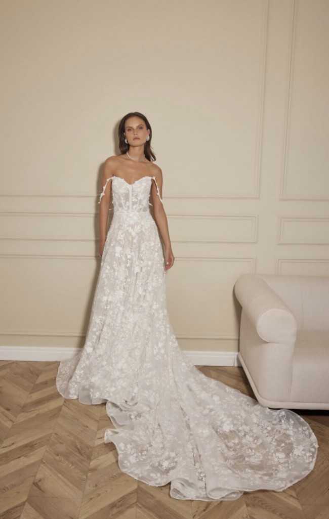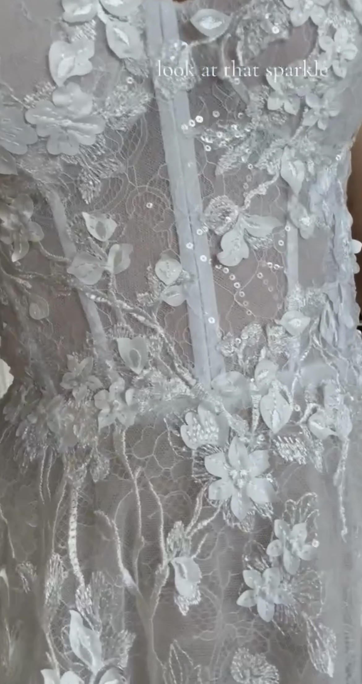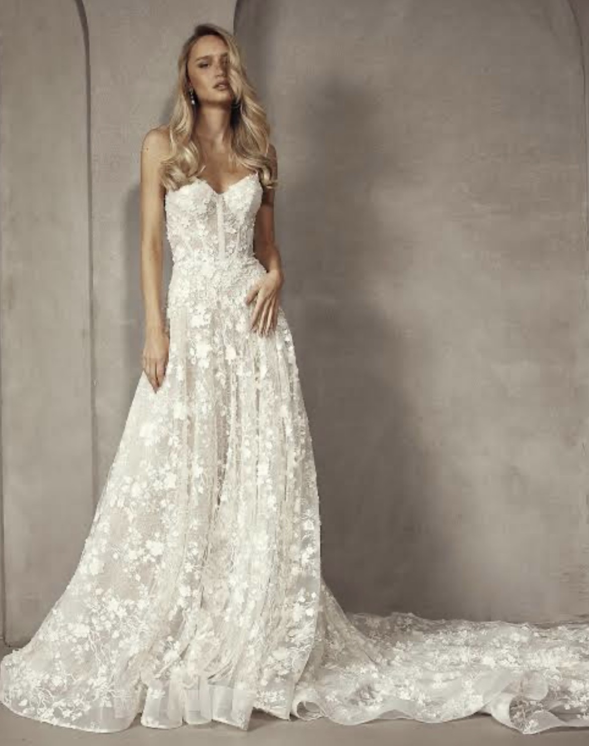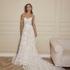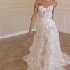 Dreamy lace A-line gown for the fairy tale bride. This style features a sweetheart neckline with dainty off-the-shoulder straps, a sheer corset bodice, and a flowy A-line skirt lined in light nude. Dimensional flowers adorn this dress from head to toe for a whimsical touch.