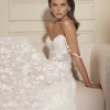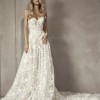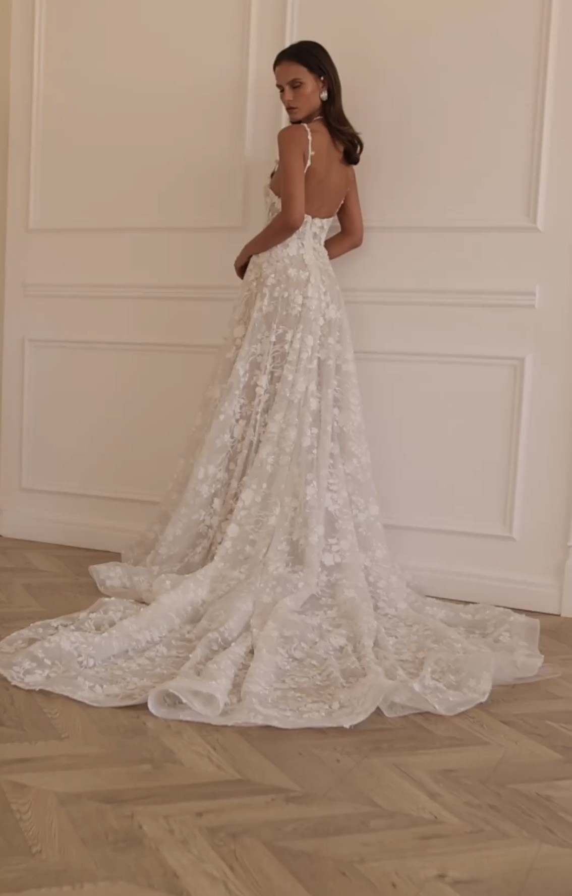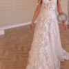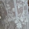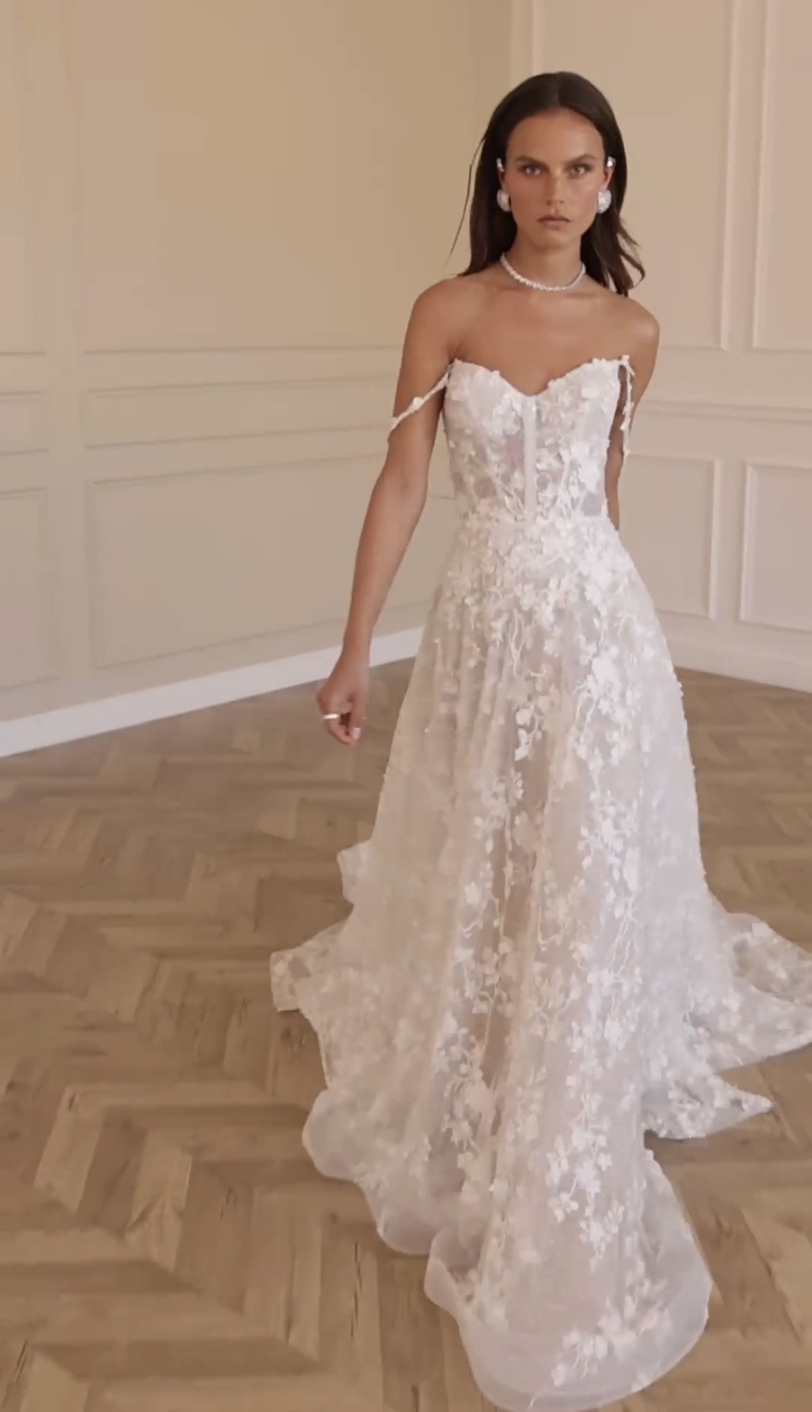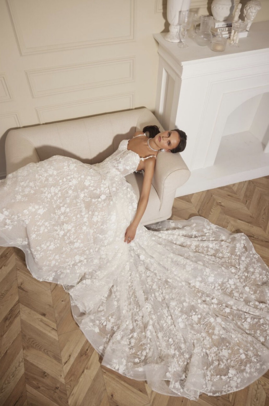 Dreamy lace A-line gown for the fairy tale bride. This style features a sweetheart neckline with dainty off-the-shoulder straps, a sheer corset bodice, and a flowy A-line skirt lined in light nude. Dimensional flowers adorn this dress from head to toe for a whimsical touch.