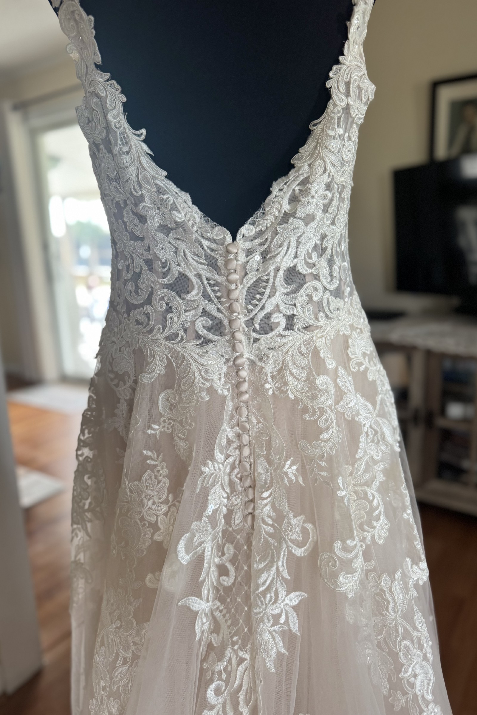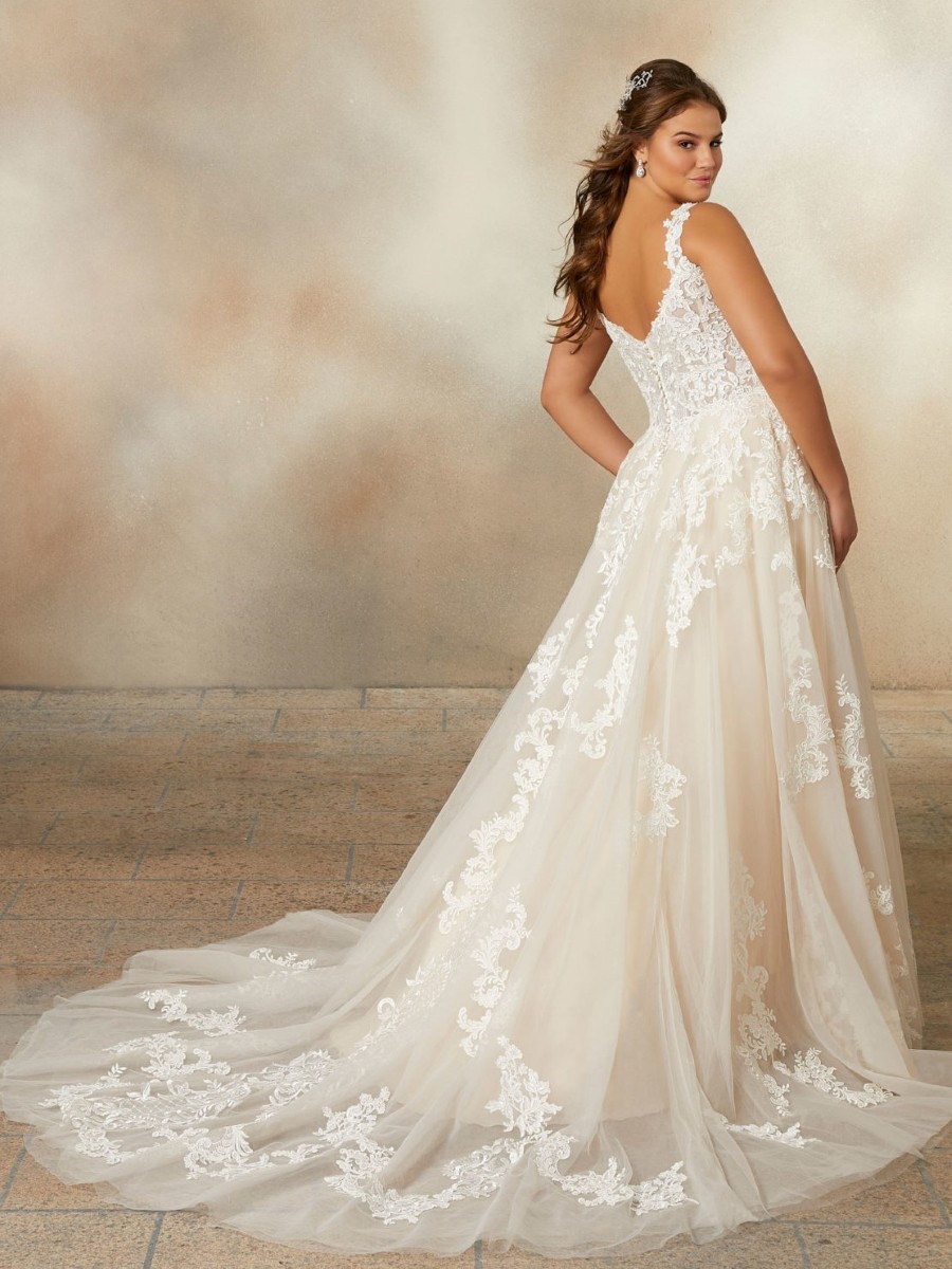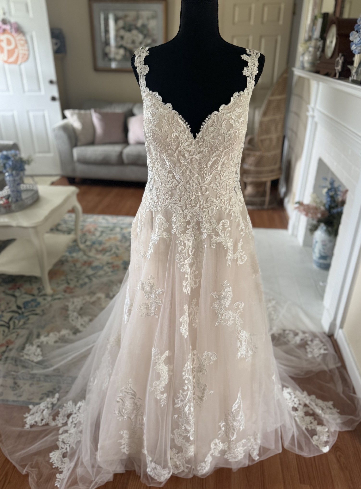 This Morilee wedding gown is an elegant and romantic piece featuring a fitted bodice adorned with intricate lace embroidery that extends into delicate lace straps. The neckline is a soft V-shape, adding a flattering and timeless touch. The lace detailing cascades down into the flowing tulle skirt, creating a graceful transition from the structured top to the airy, ethereal bottom. The skirt is finished with a chapel-length train edged in lace appliqués, giving the dress a classic yet enchanting look. Perfect for a bride who wants a blend of sophistication and fairytale charm. Make an offer, this dress needs to be shown off!