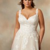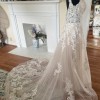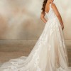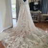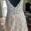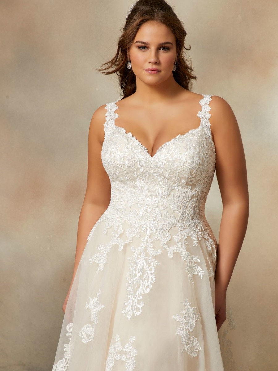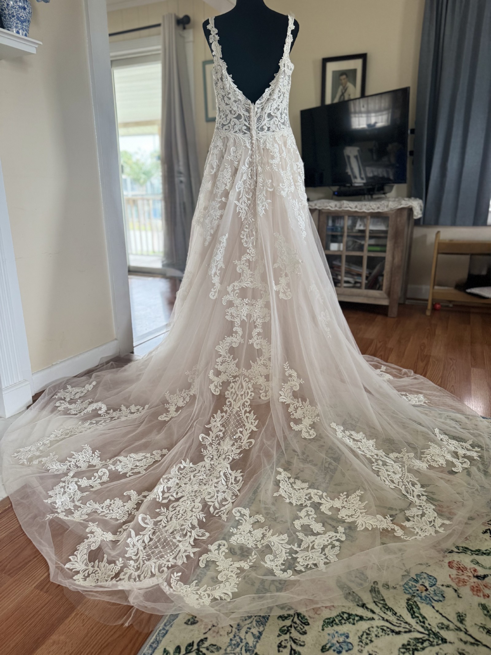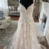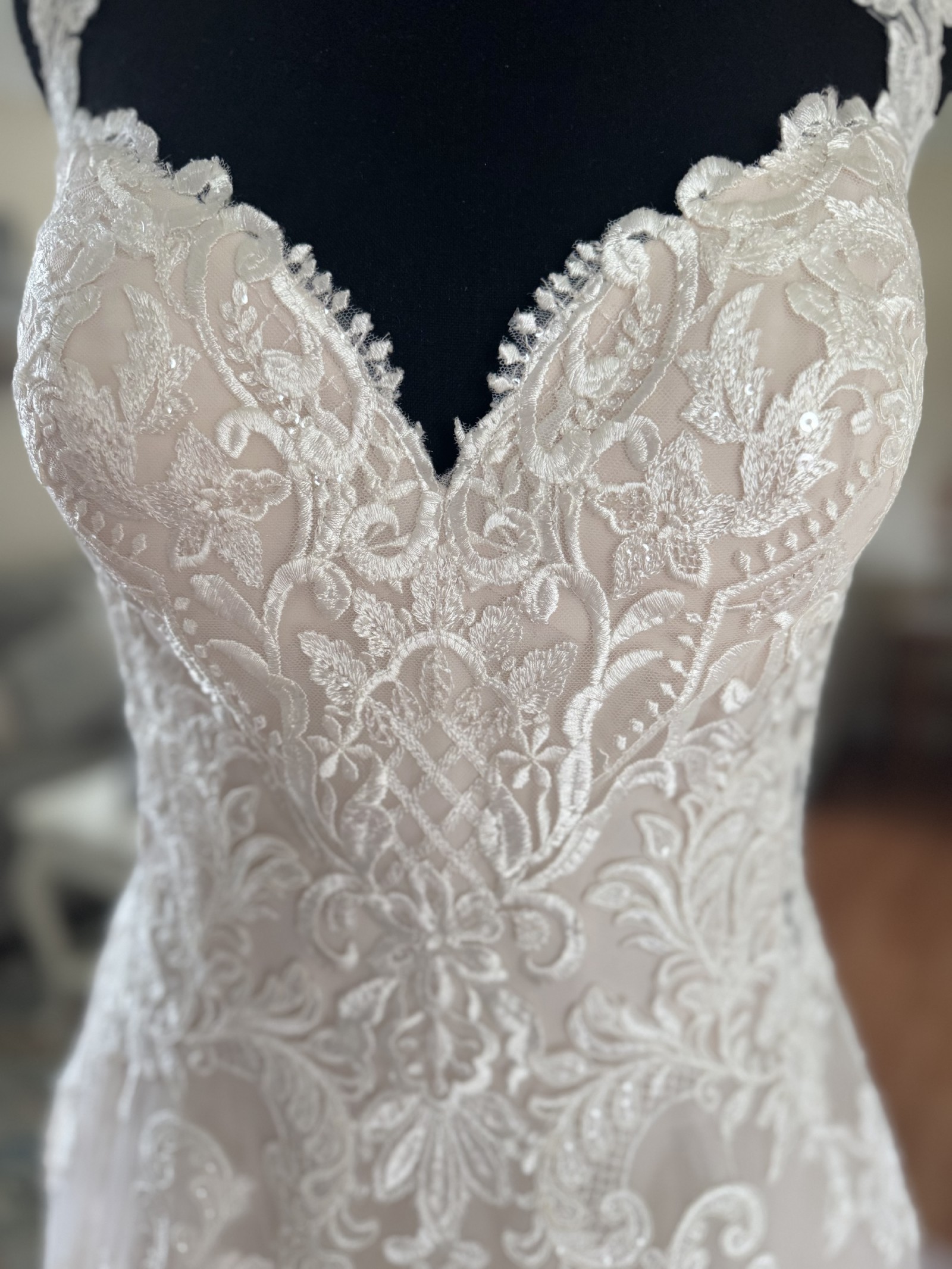 This Morilee wedding gown is an elegant and romantic piece featuring a fitted bodice adorned with intricate lace embroidery that extends into delicate lace straps. The neckline is a soft V-shape, adding a flattering and timeless touch. The lace detailing cascades down into the flowing tulle skirt, creating a graceful transition from the structured top to the airy, ethereal bottom. The skirt is finished with a chapel-length train edged in lace appliqués, giving the dress a classic yet enchanting look. Perfect for a bride who wants a blend of sophistication and fairytale charm. Make an offer, this dress needs to be shown off!