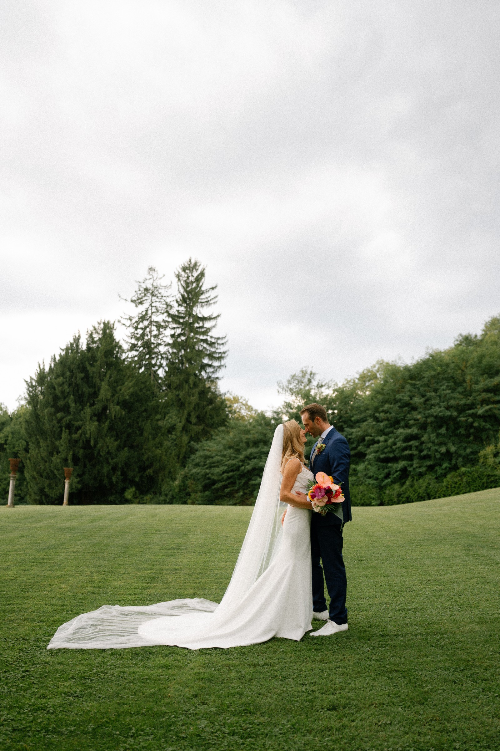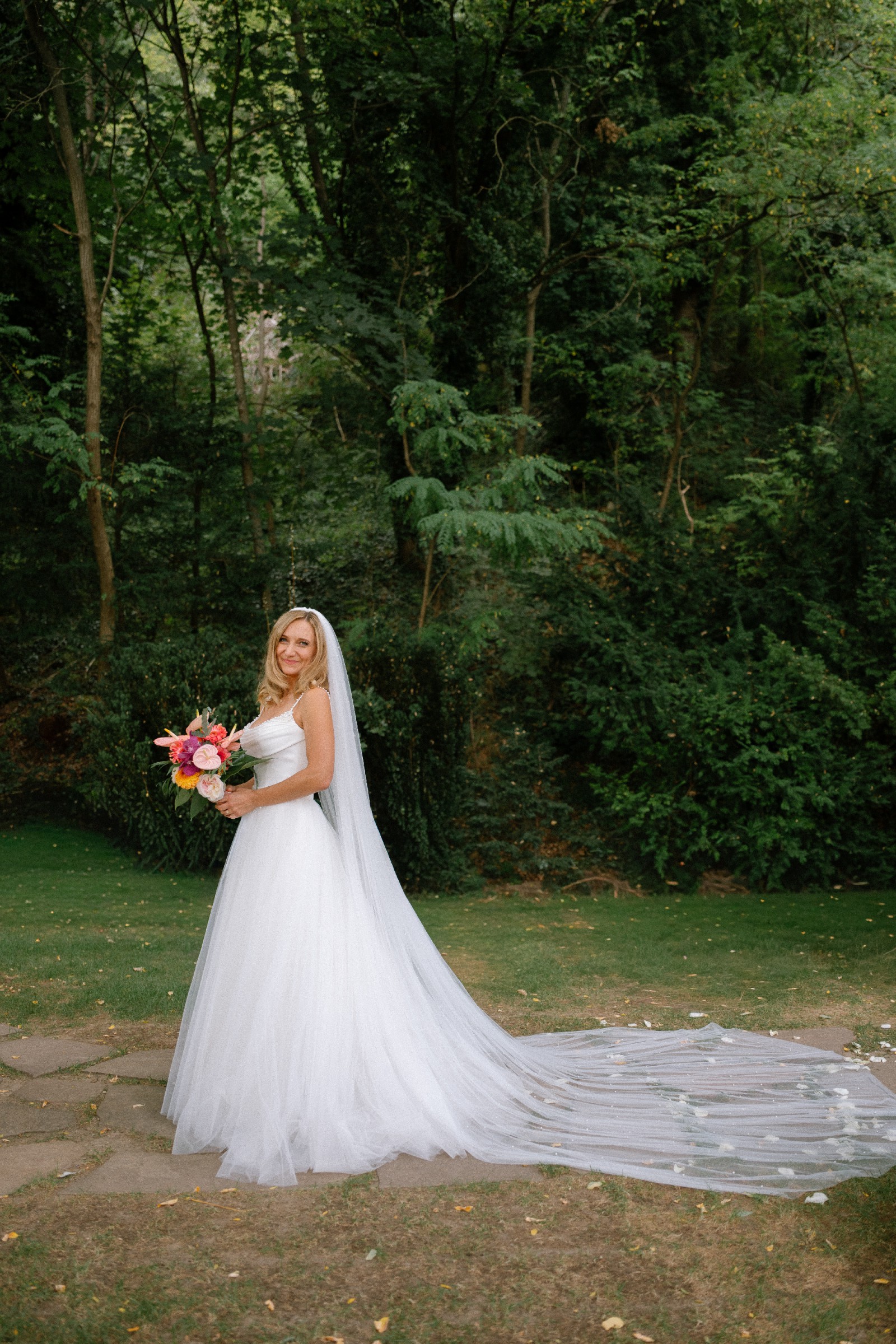 The dress creates a gorgeous décolleté (even without a bra) and is made from a wonderfully soft, comfortable fabric. The train can be cleverly bustled inside the dress, turning into a graceful “French bustle”, which looks just as beautiful when lifted.