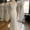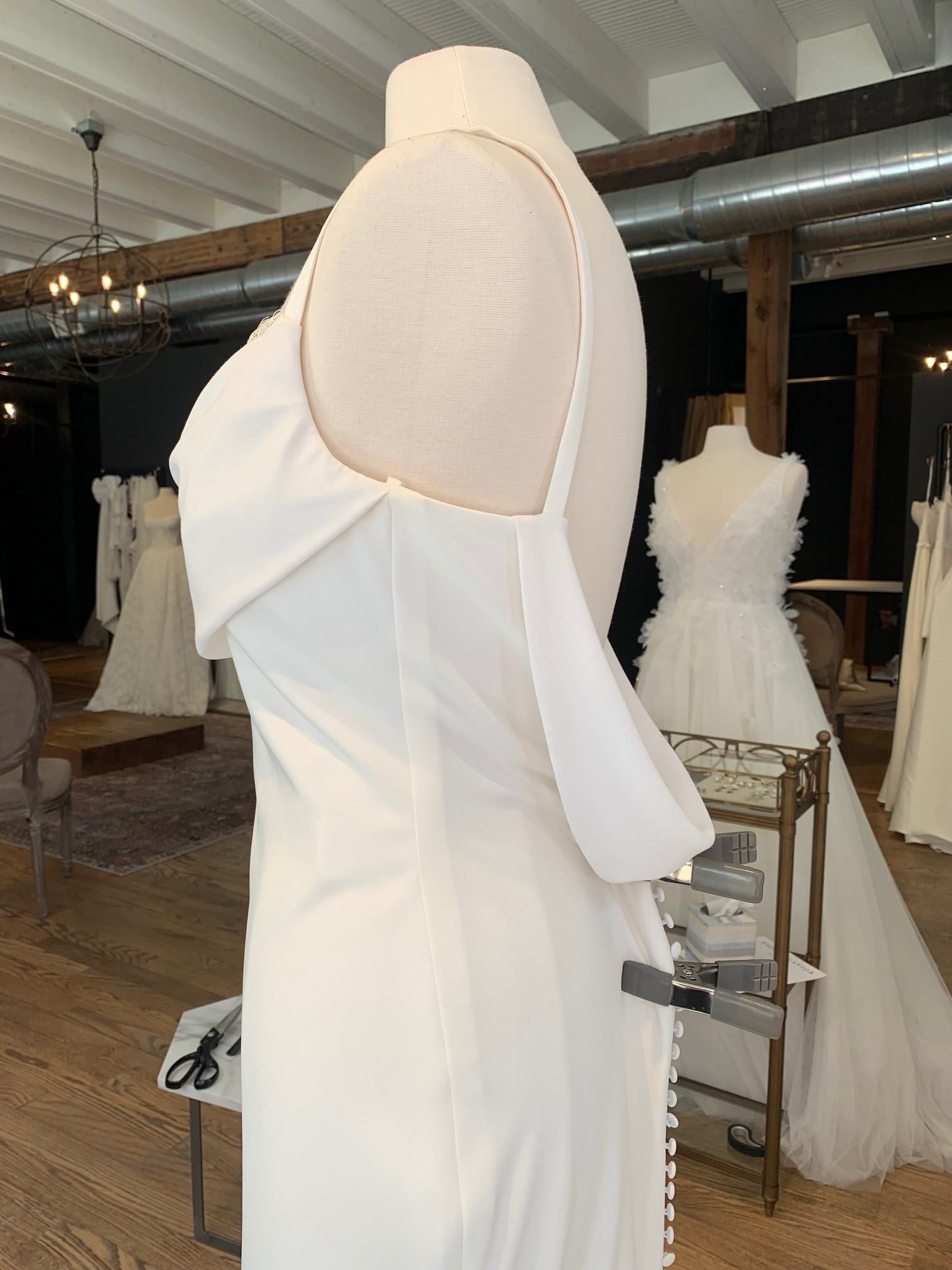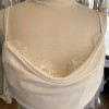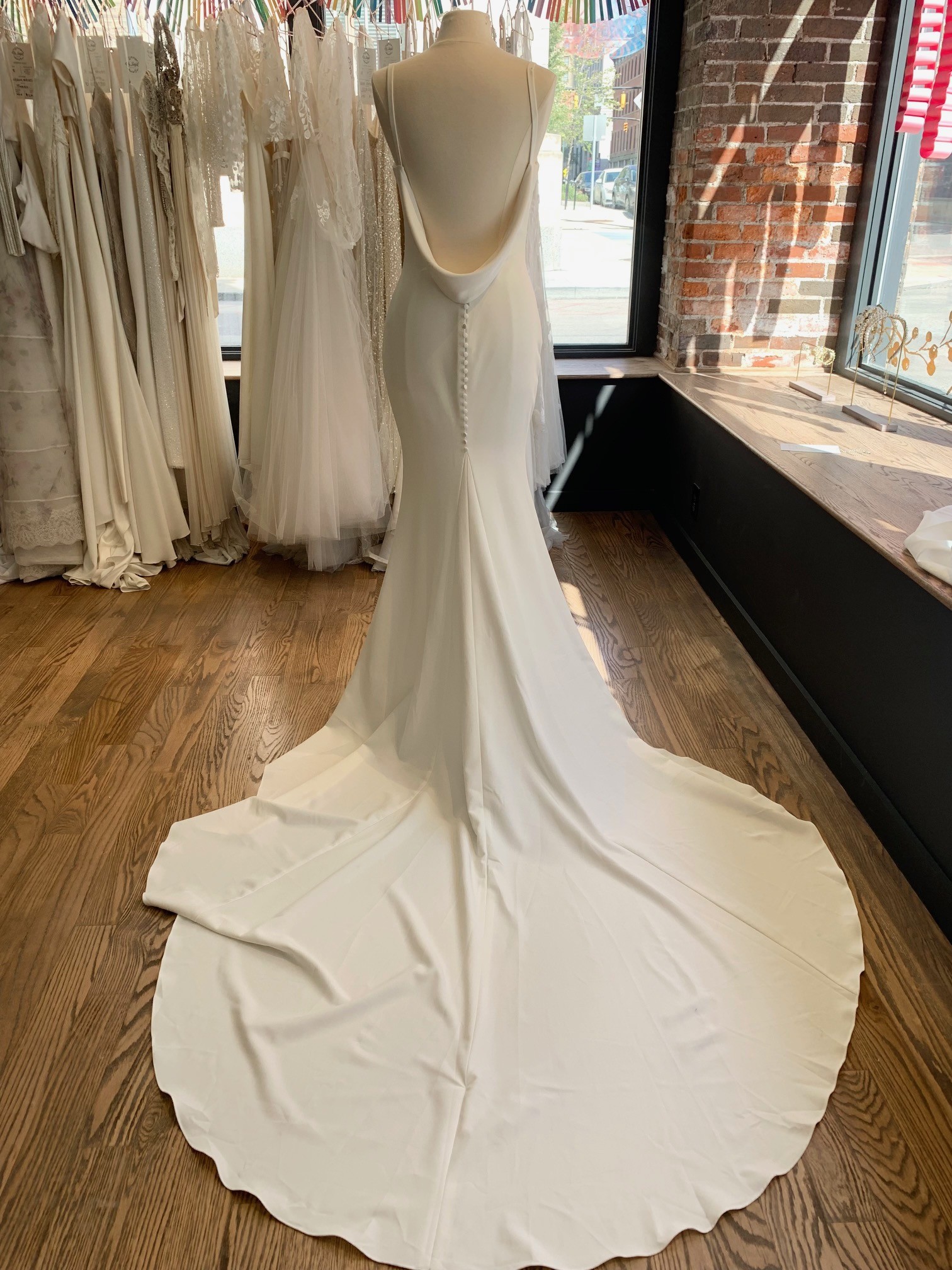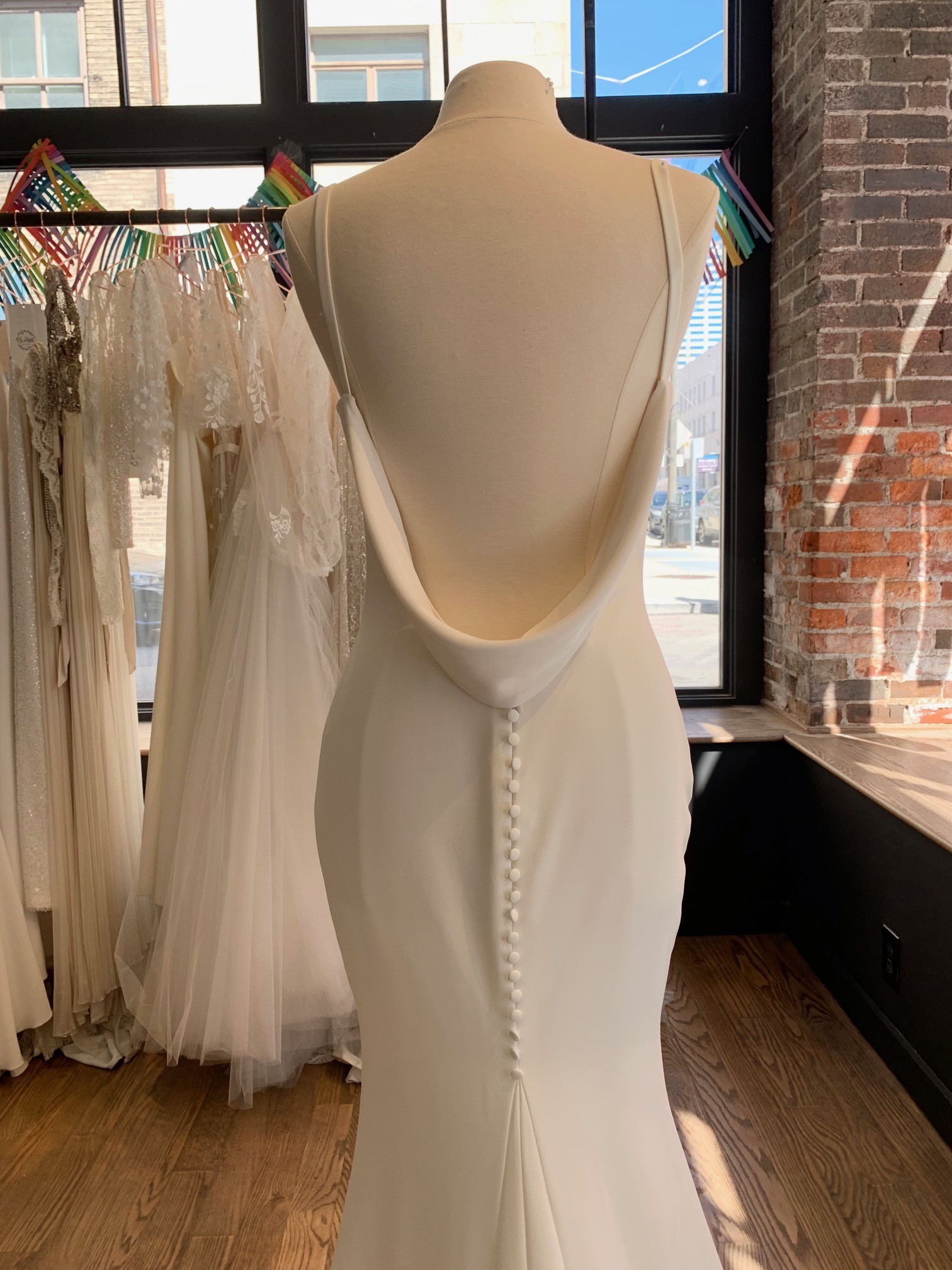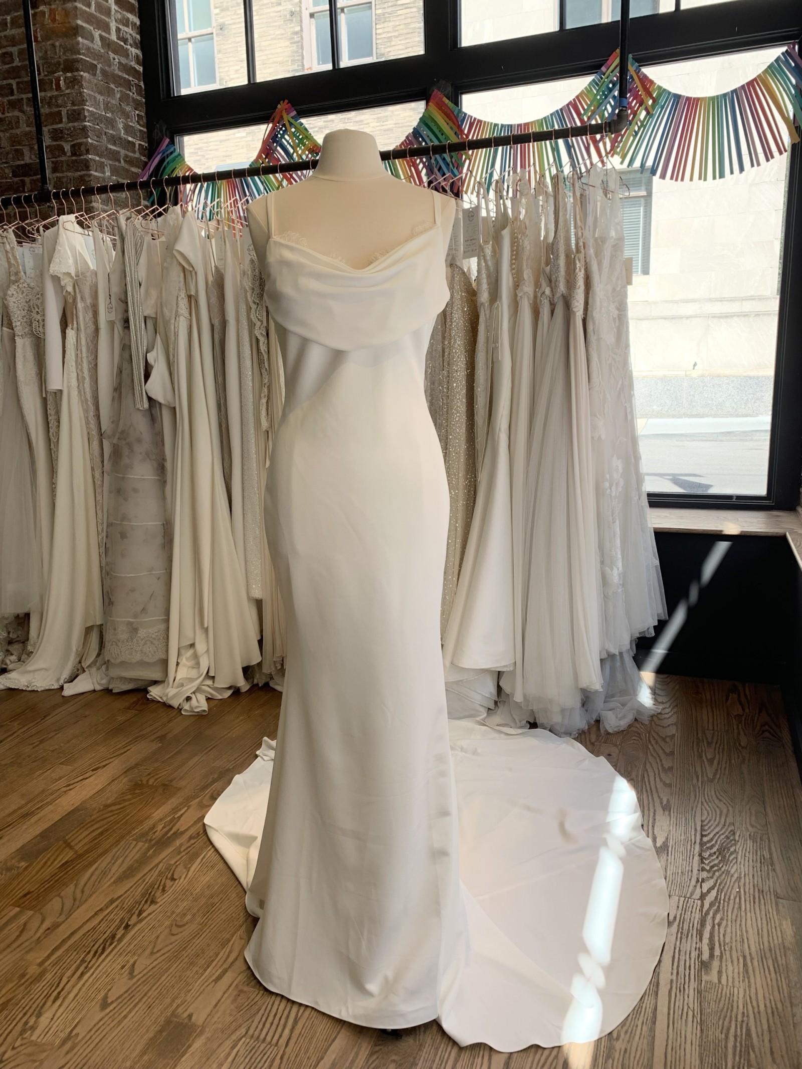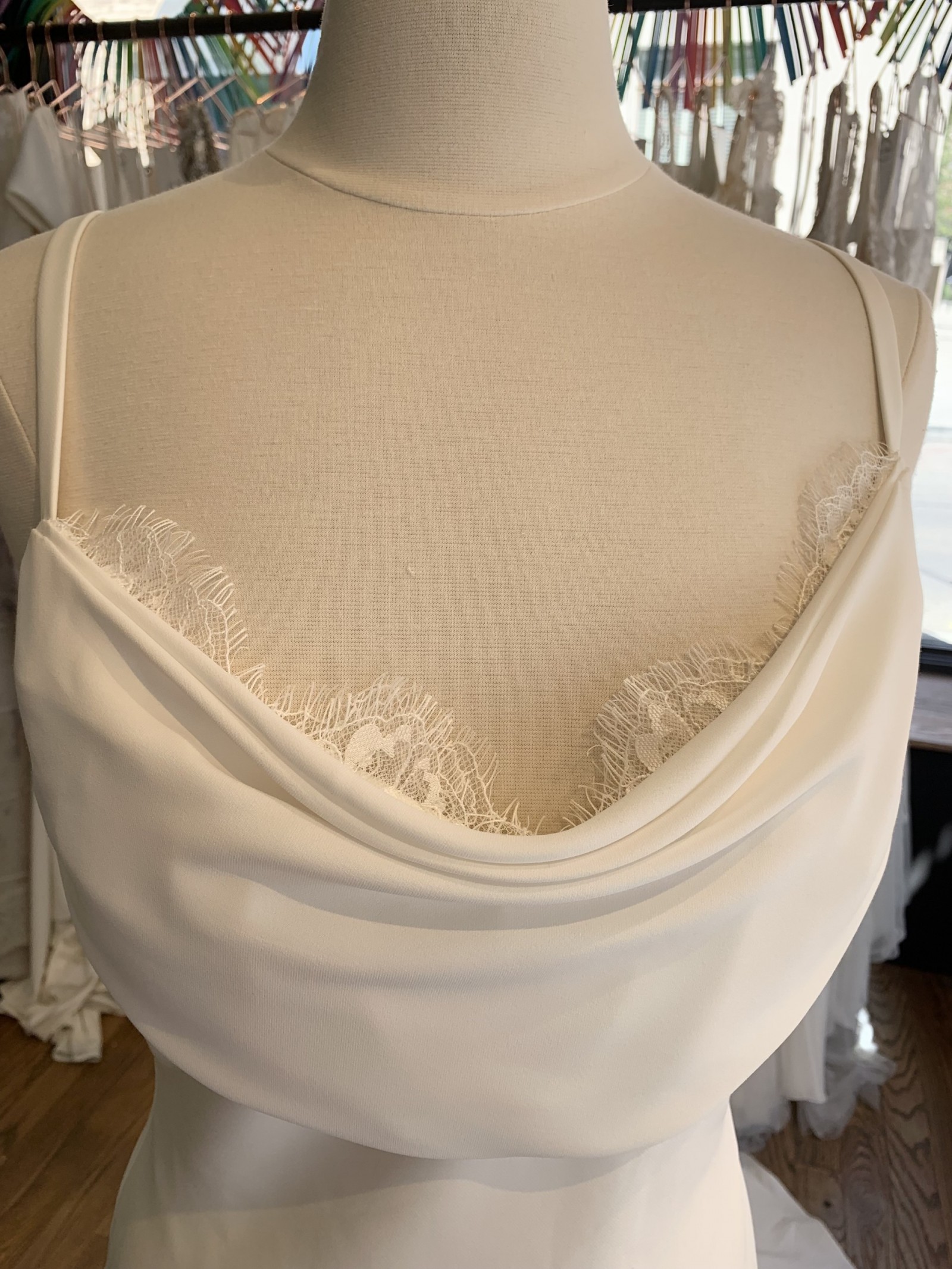 This listing is for the Archie V2 gown by Made With Love! This gown is made from a soft and stretchy crepe material in ivory. It is super comfortable with a stunning low back and a beautiful cowl in the front with Chantilly lace trim. It is in great condition! The lace trim at the neckline can be removed in alterations if that isn't your thing. The tag is a size 14 and it has never been altered.
