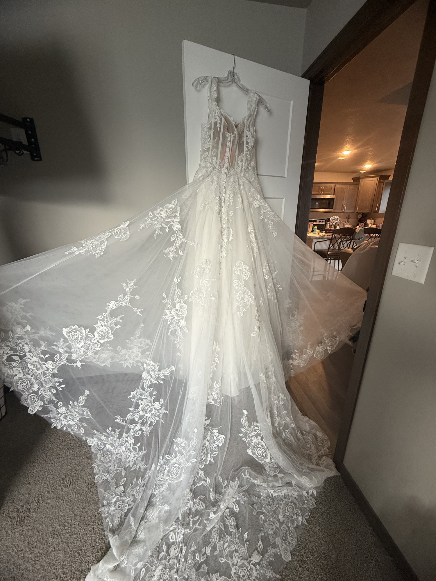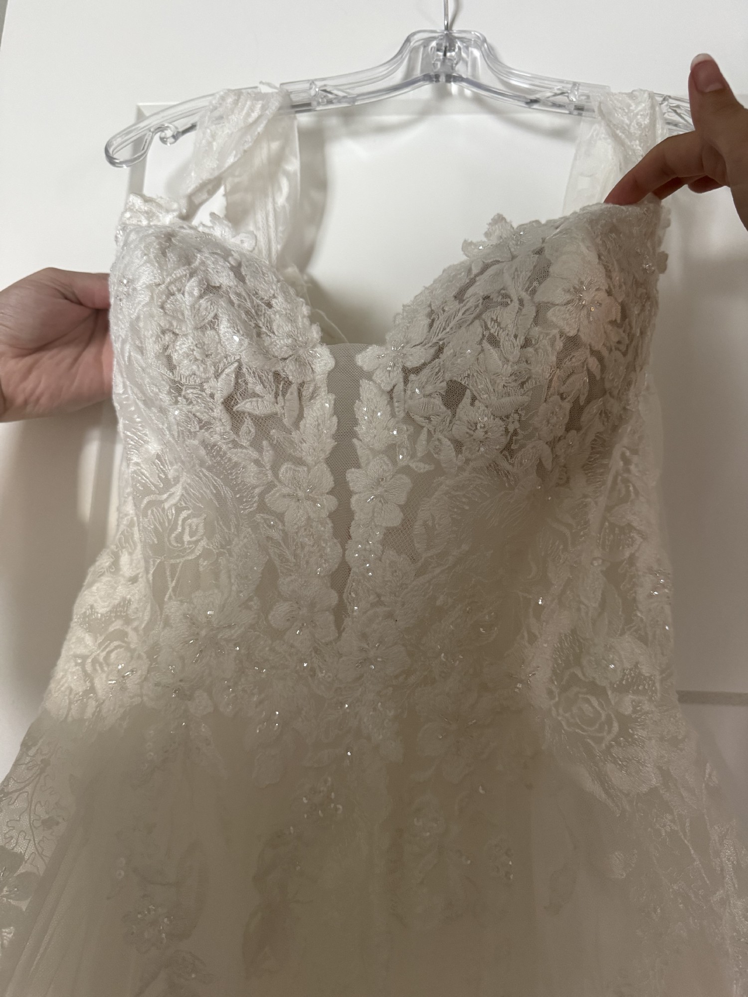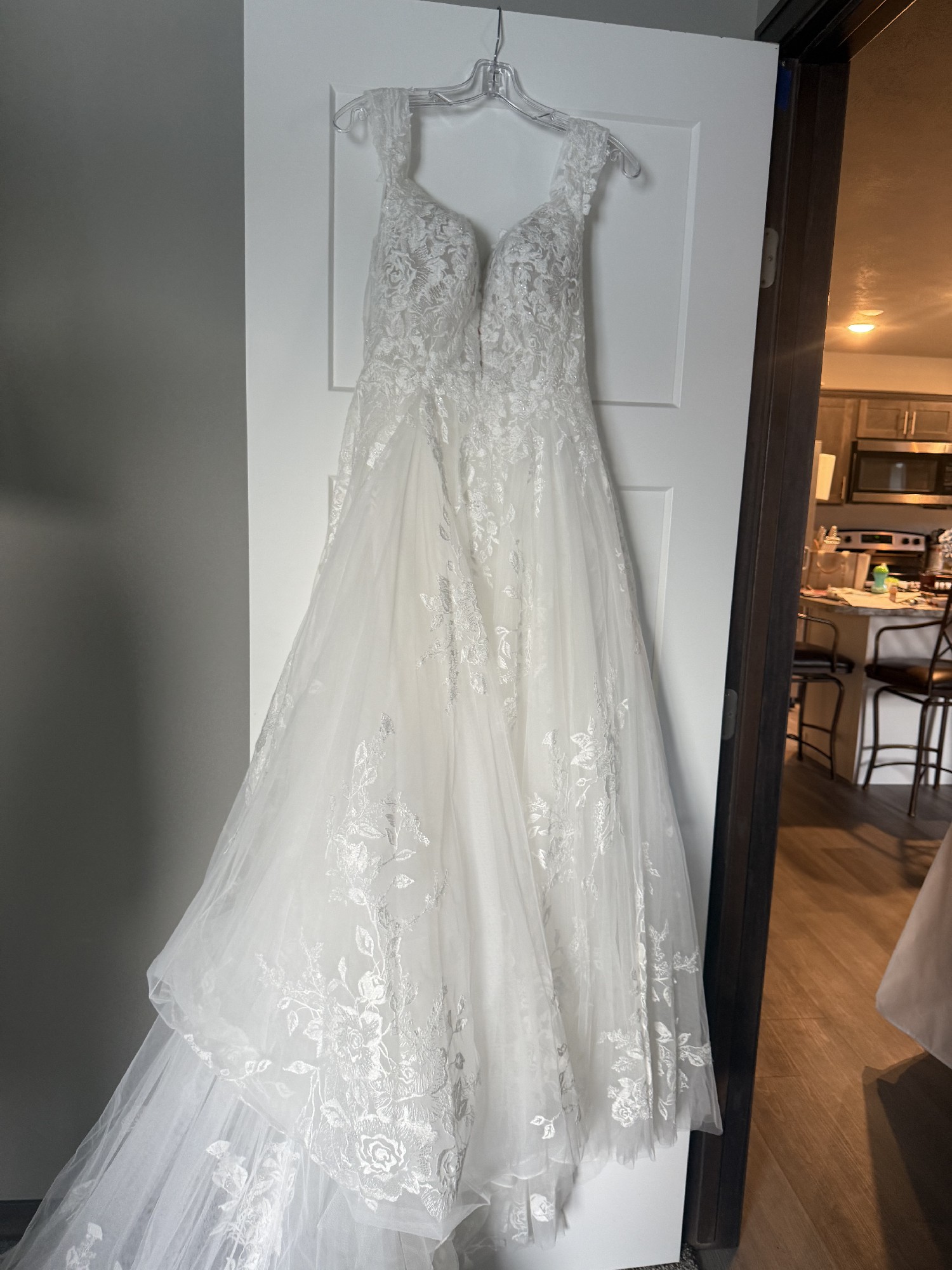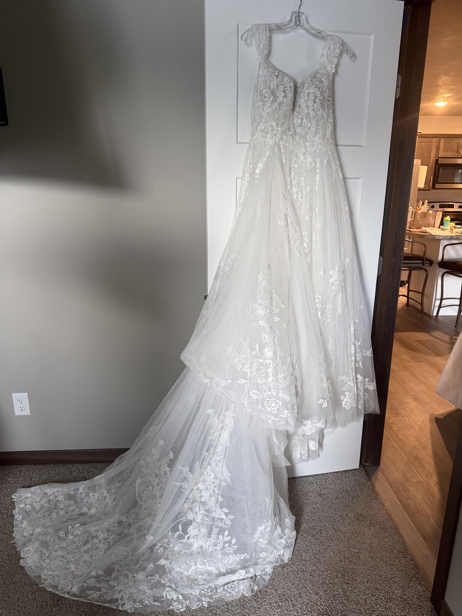 Brand new dress, never worn. Beautiful Ivory color with lace and train. Stored in smoke-free home. Selling because wanting a different style.