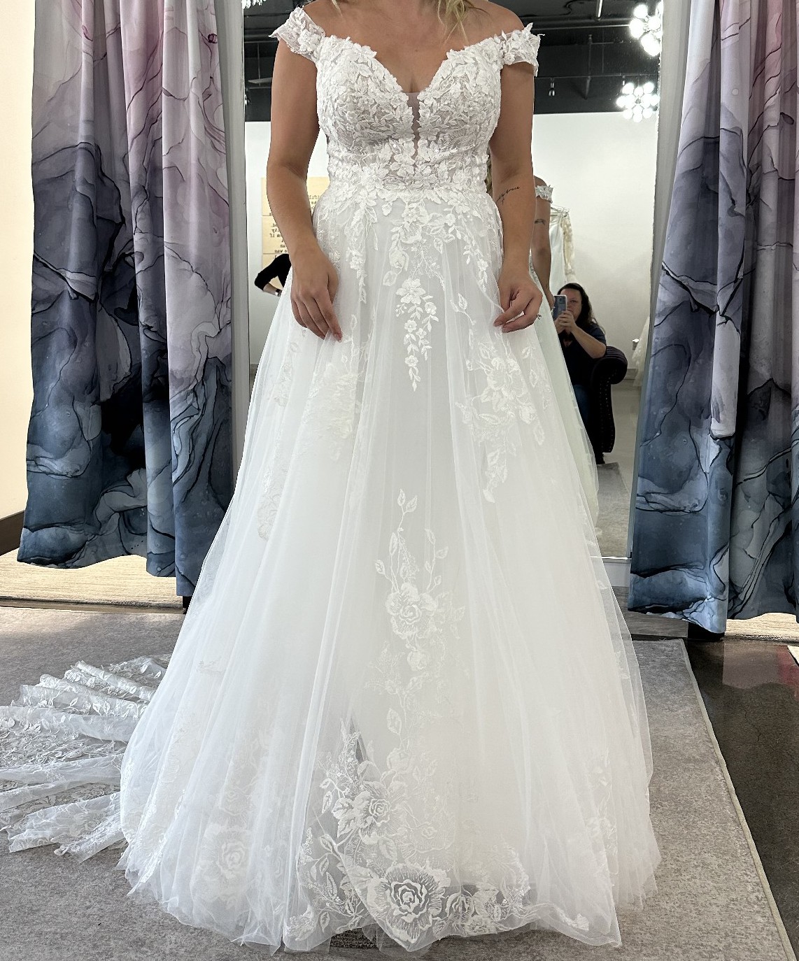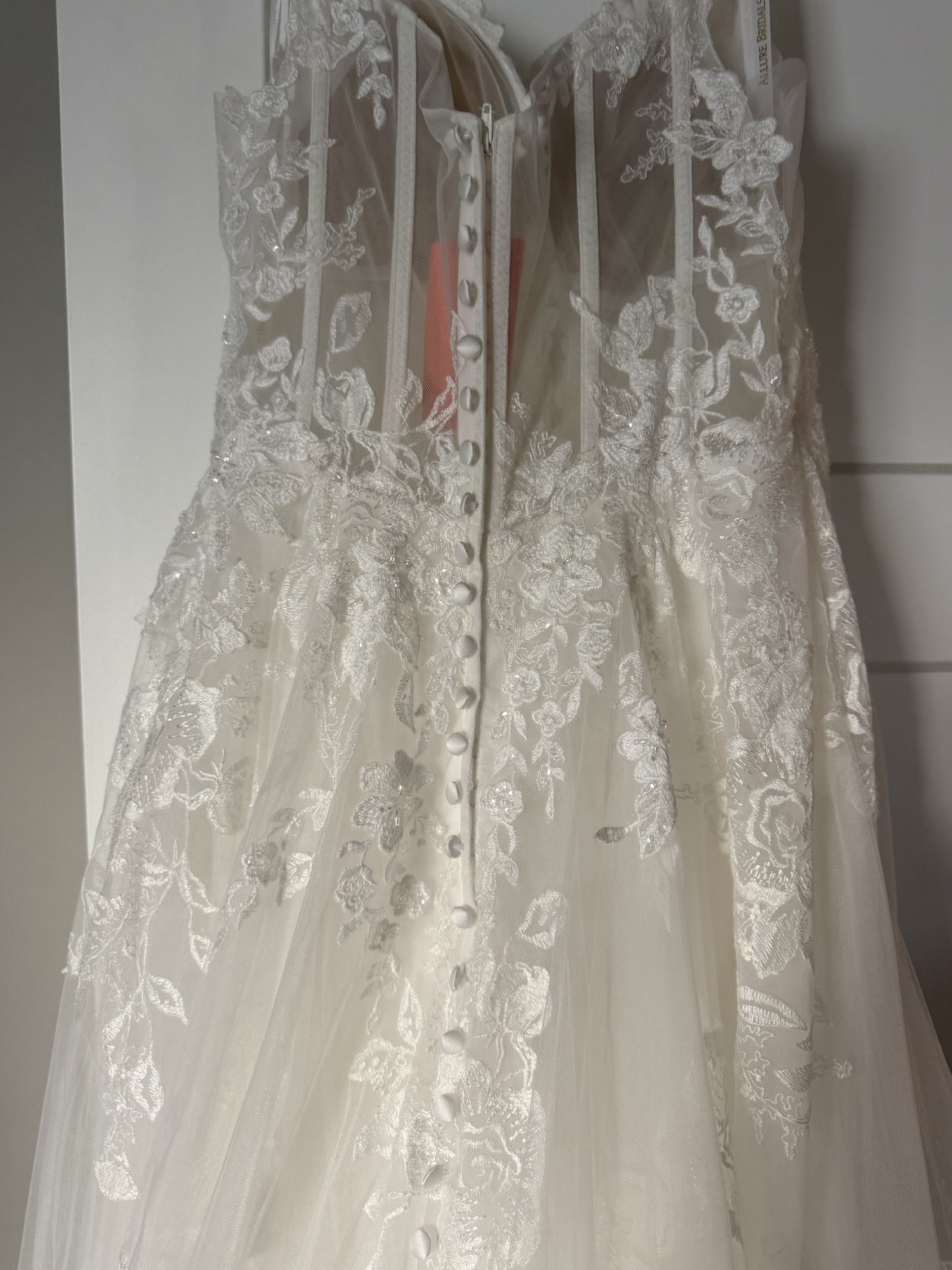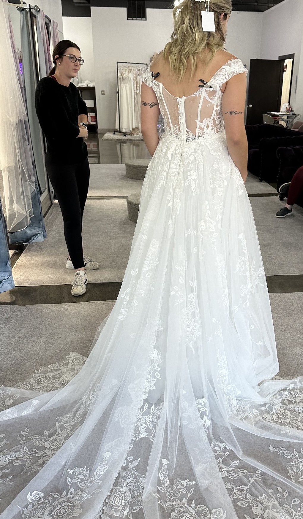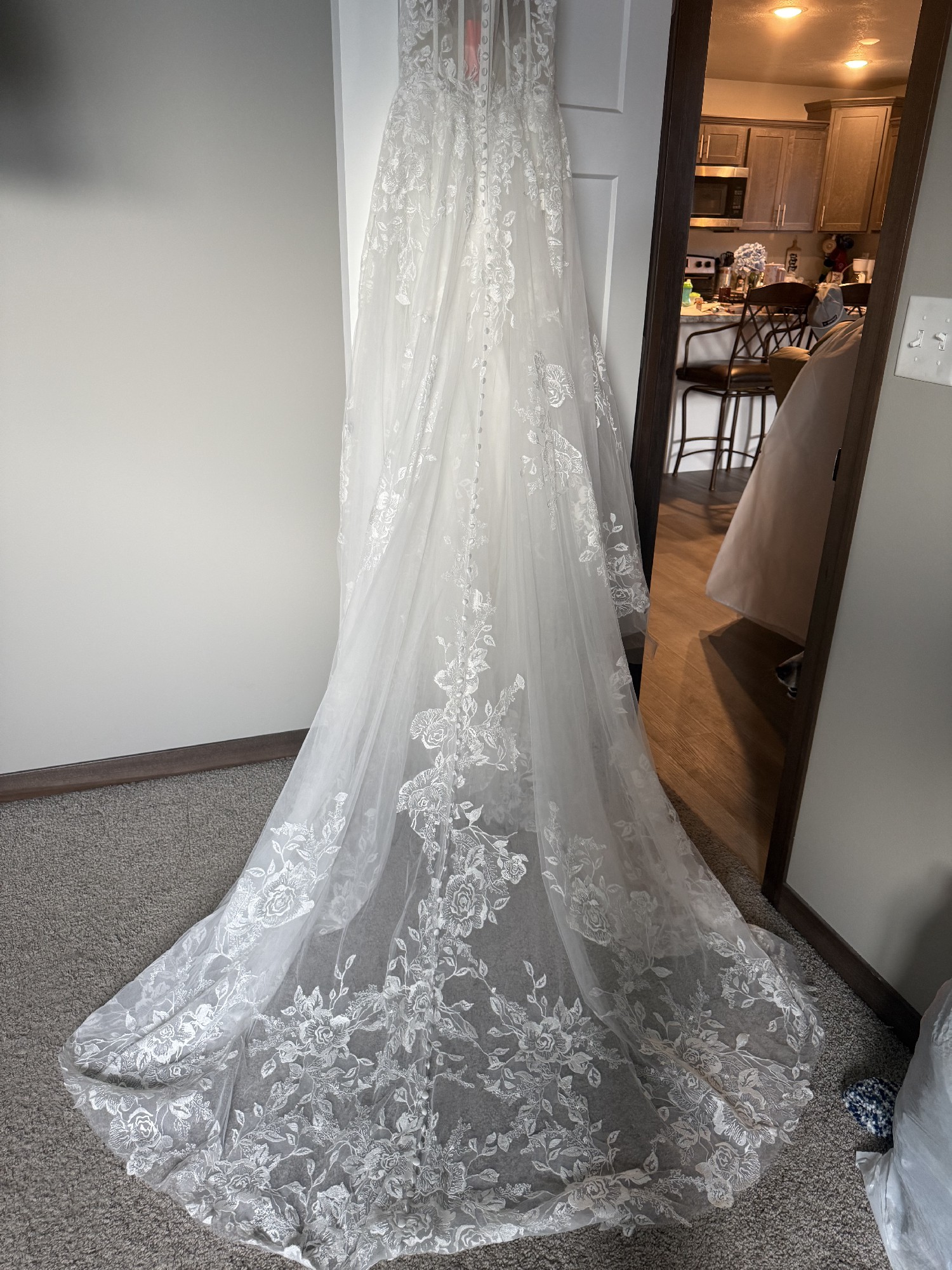 Brand new dress, never worn. Beautiful Ivory color with lace and train. Stored in smoke-free home. Selling because wanting a different style.