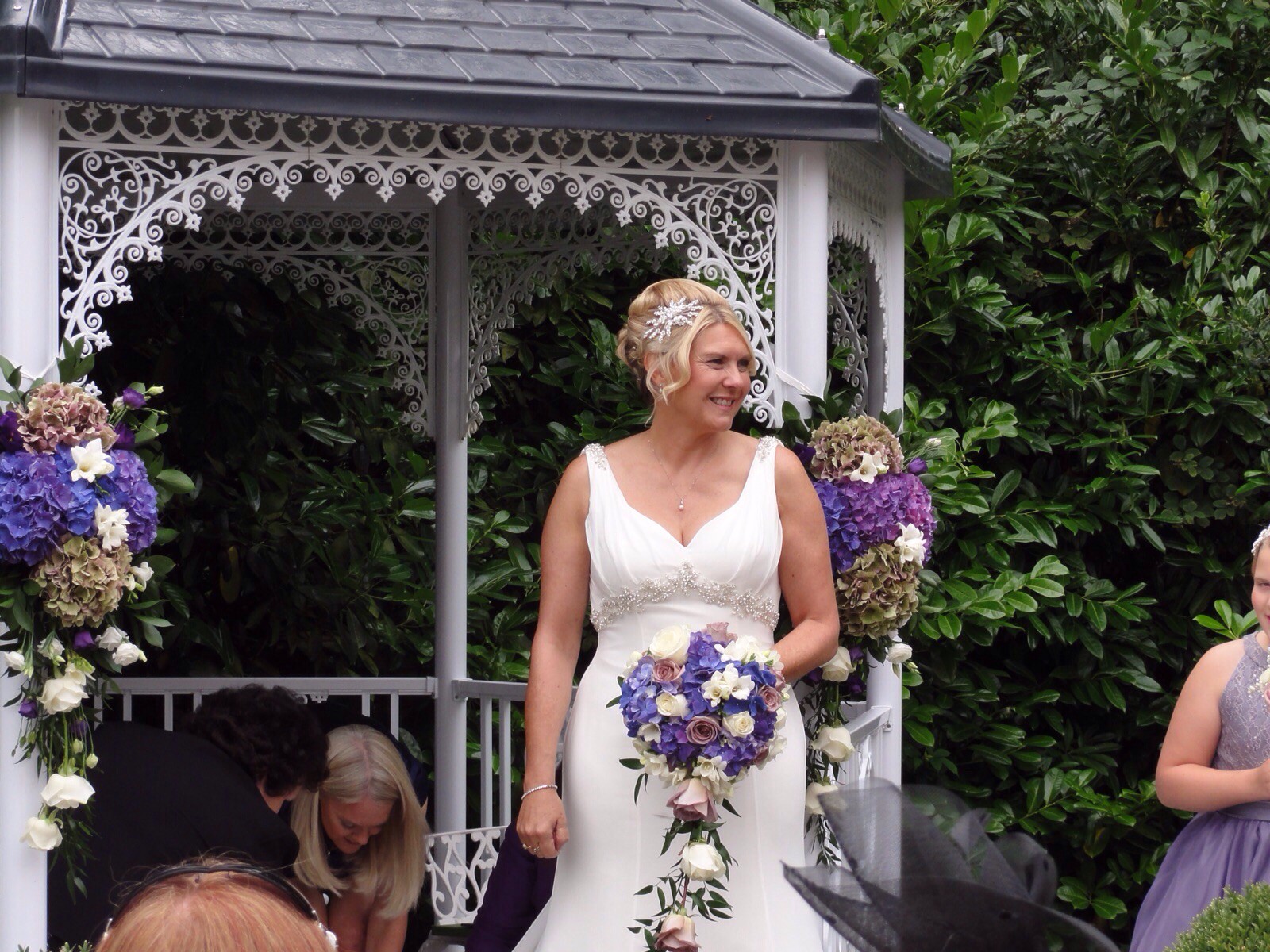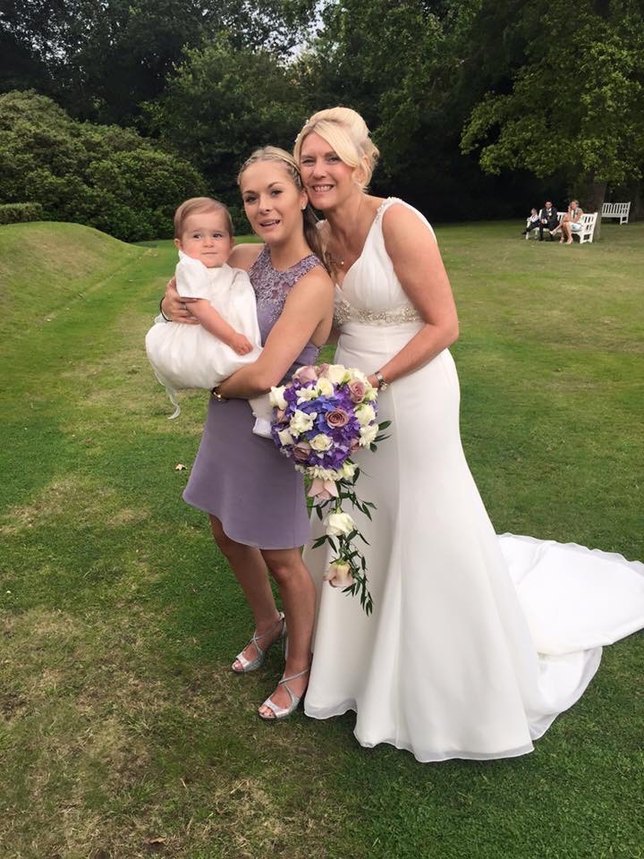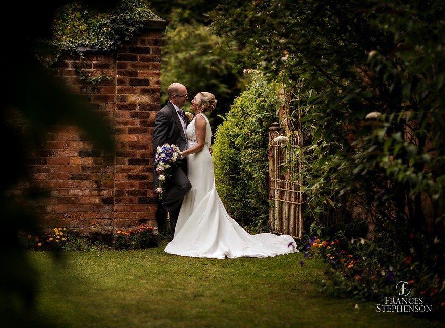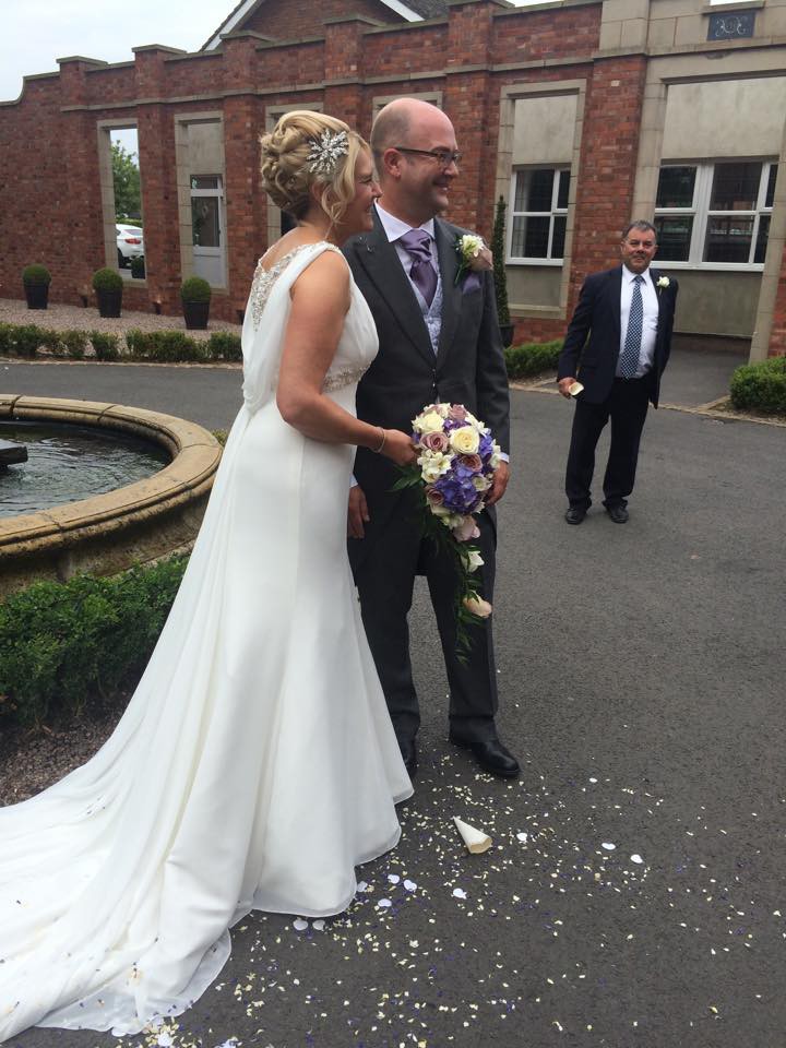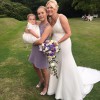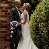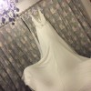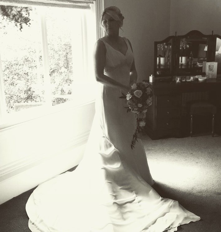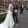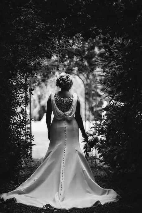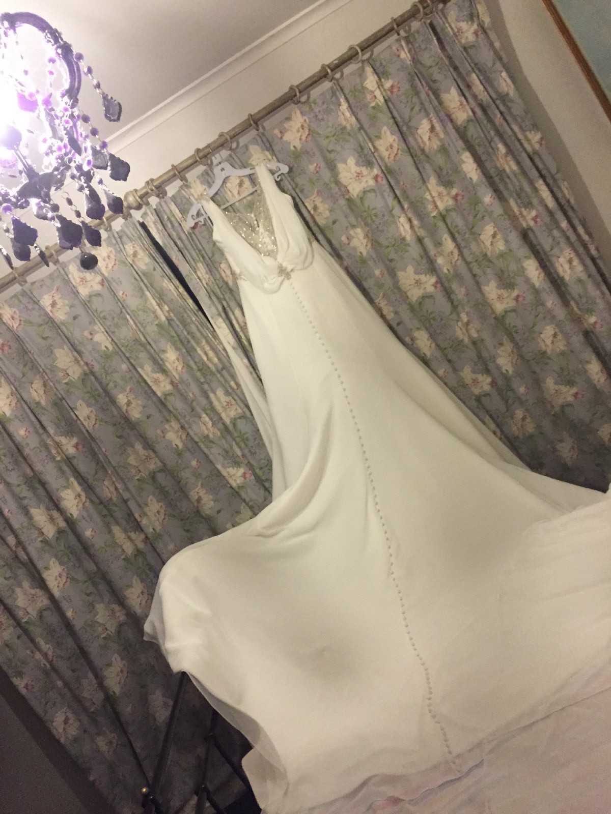 Elegant and classy, this stunning dress has beautiful beaded details to the shoulders and bodice with a beaded insert and buttoned back to the floor and train. Additional train included to complement as desired, attachable at waist to the floor.