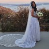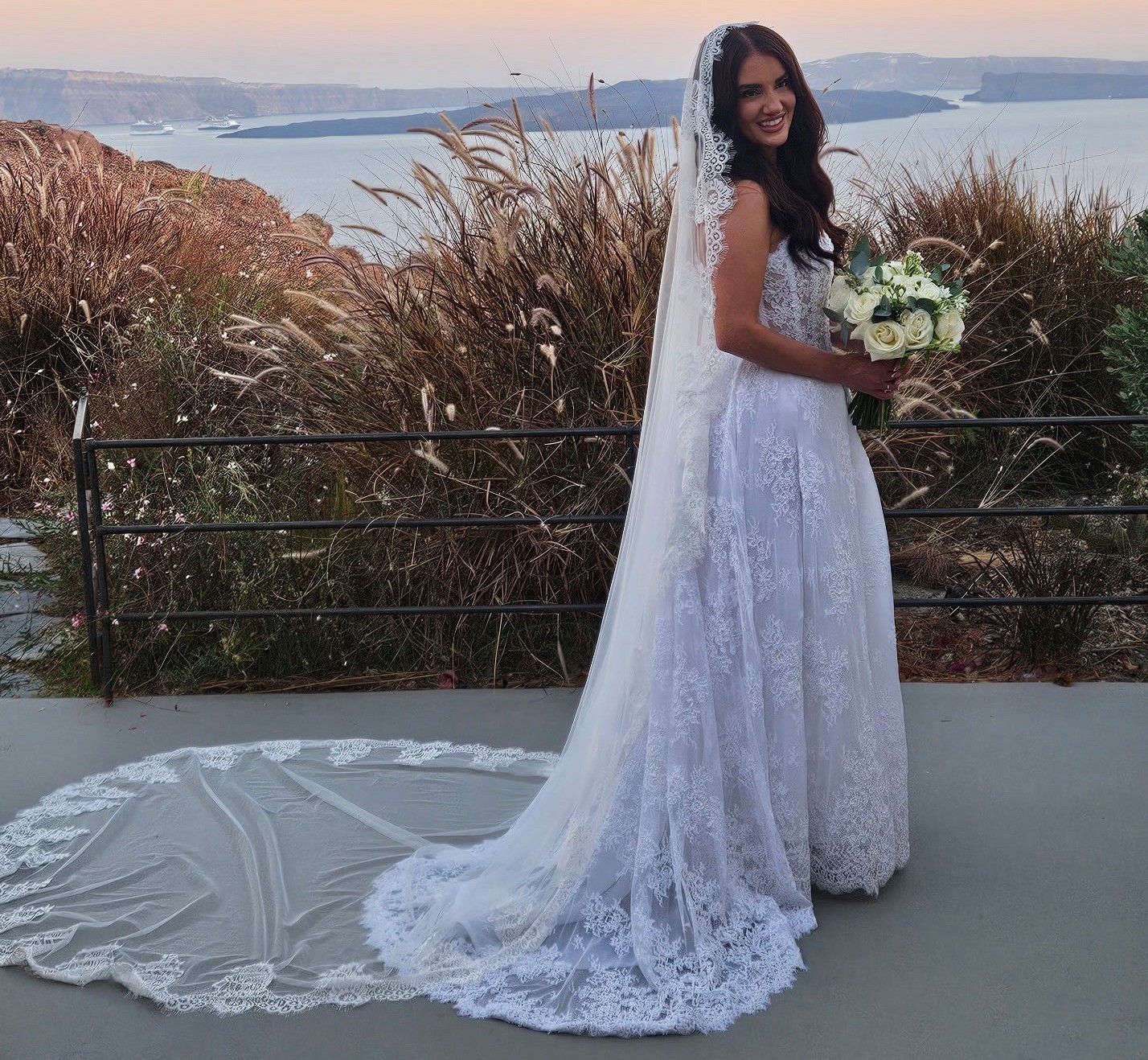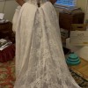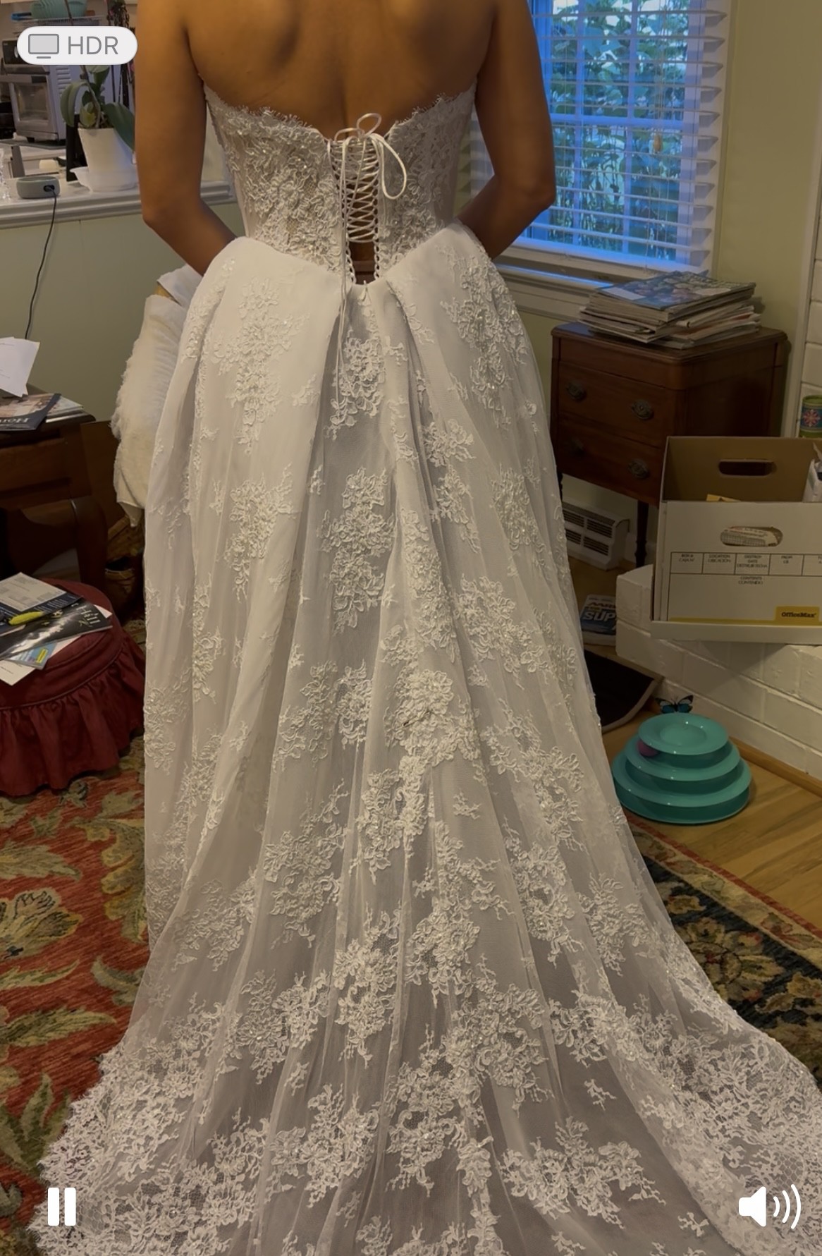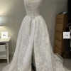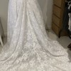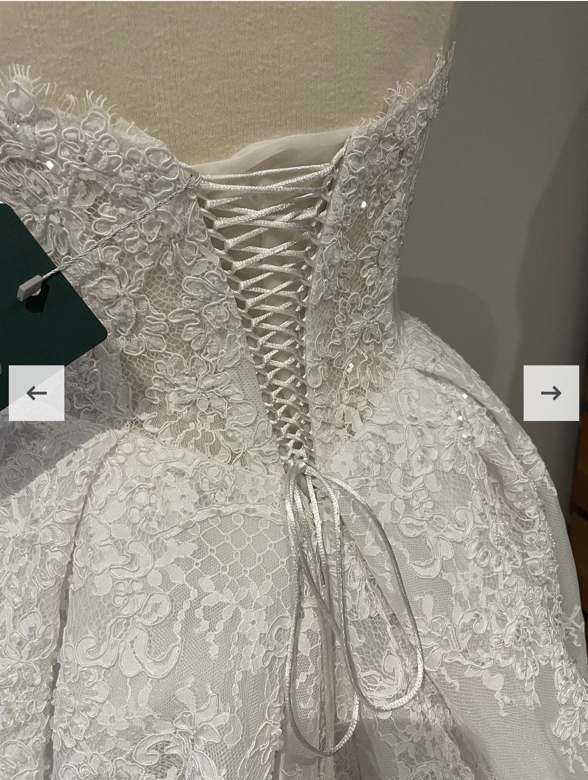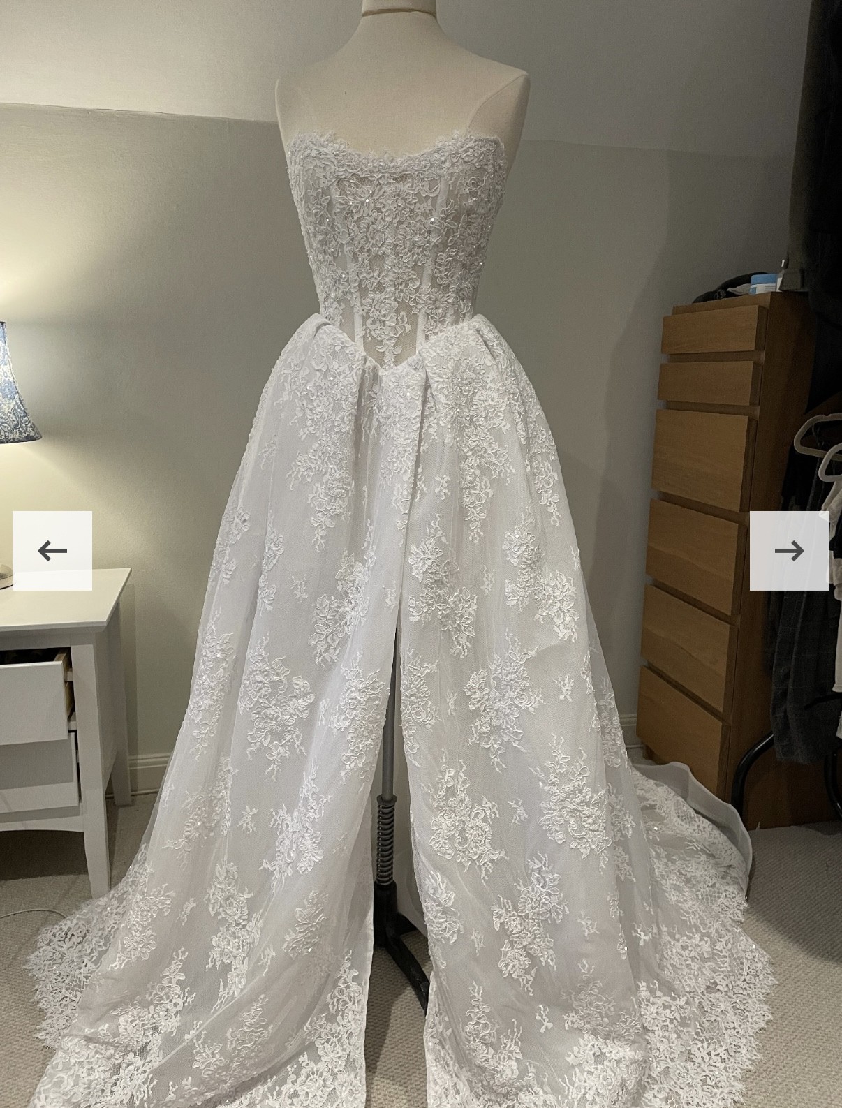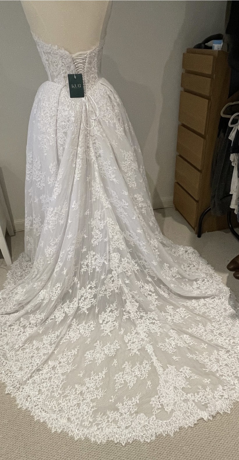 The most stunning dream dress, white sheer lace with a basque waist and subtle leg opening for a sexy sophisticated look. The corset back allows for a perfect cinched in waist and the dress will stay put all day! The lace has very intricate beads/pearls so it shimmers beautifully in the light and a bustle has been added to ensure that you can comfortably dance the night away! Designed in the style of the Tyler dress by Marquise Bridal. An extremely elegant and desirable brand at the moment with a hefty price tag. This dress was designed and made by Kug- a very talented designer from the Ukraine. It is designed to fit a size 10- I am usually a size 4-6 in US, so the double lined corset top really allows for great range. Veil and purse are included!