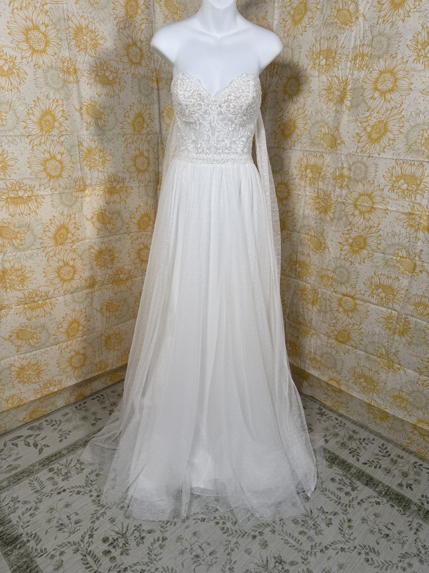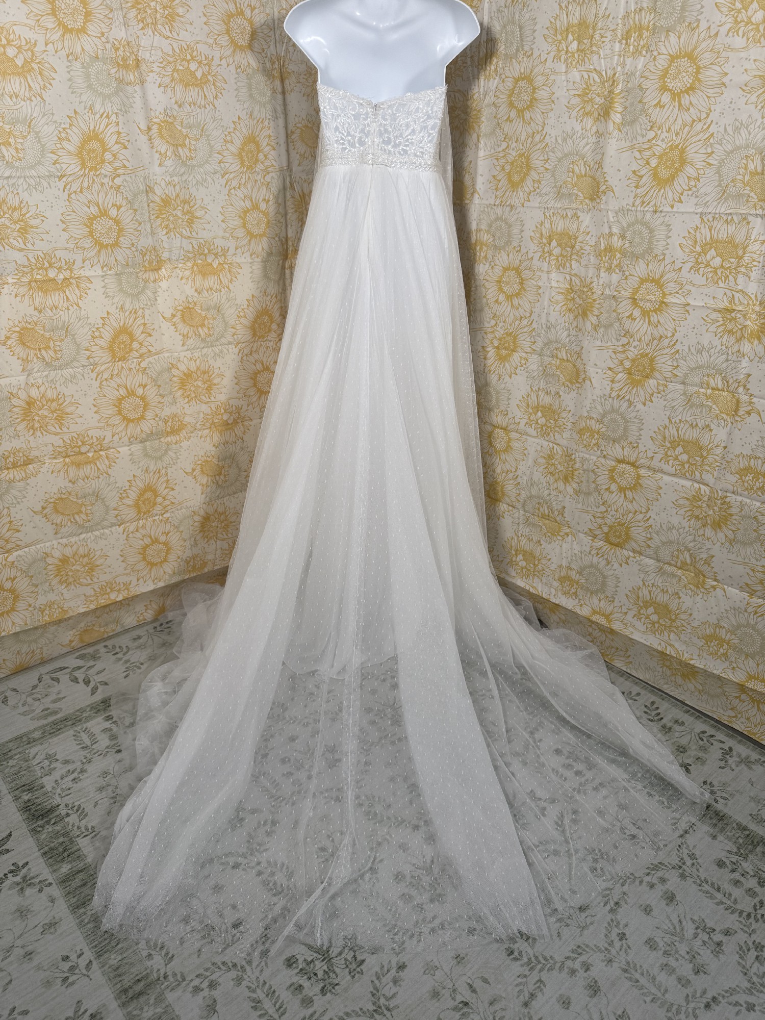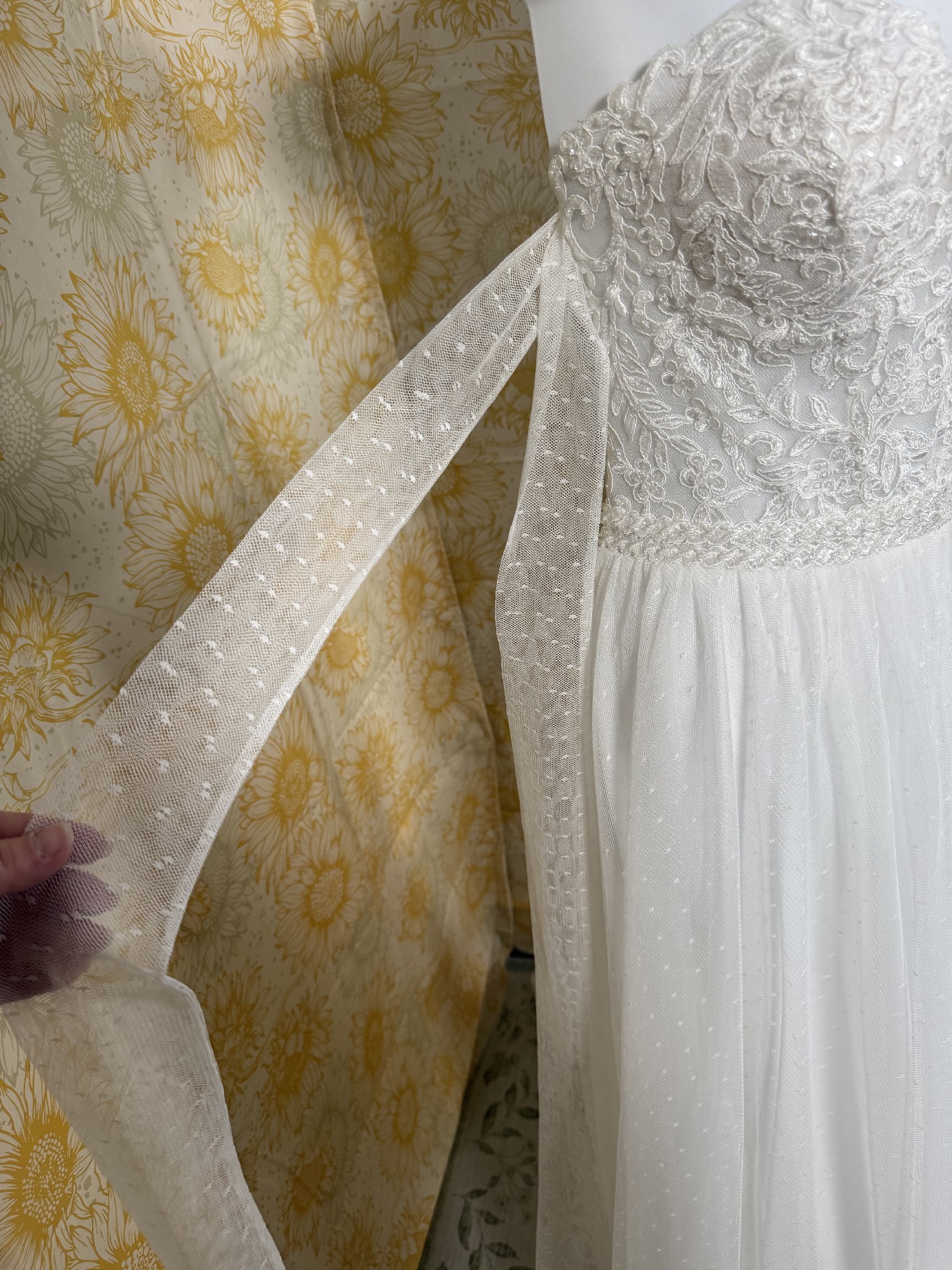 Sample gown with tags. There are no flaws on this beautiful gown! The arm pieces are attached to the bodice and can be tied however you like! I am open to all offers!