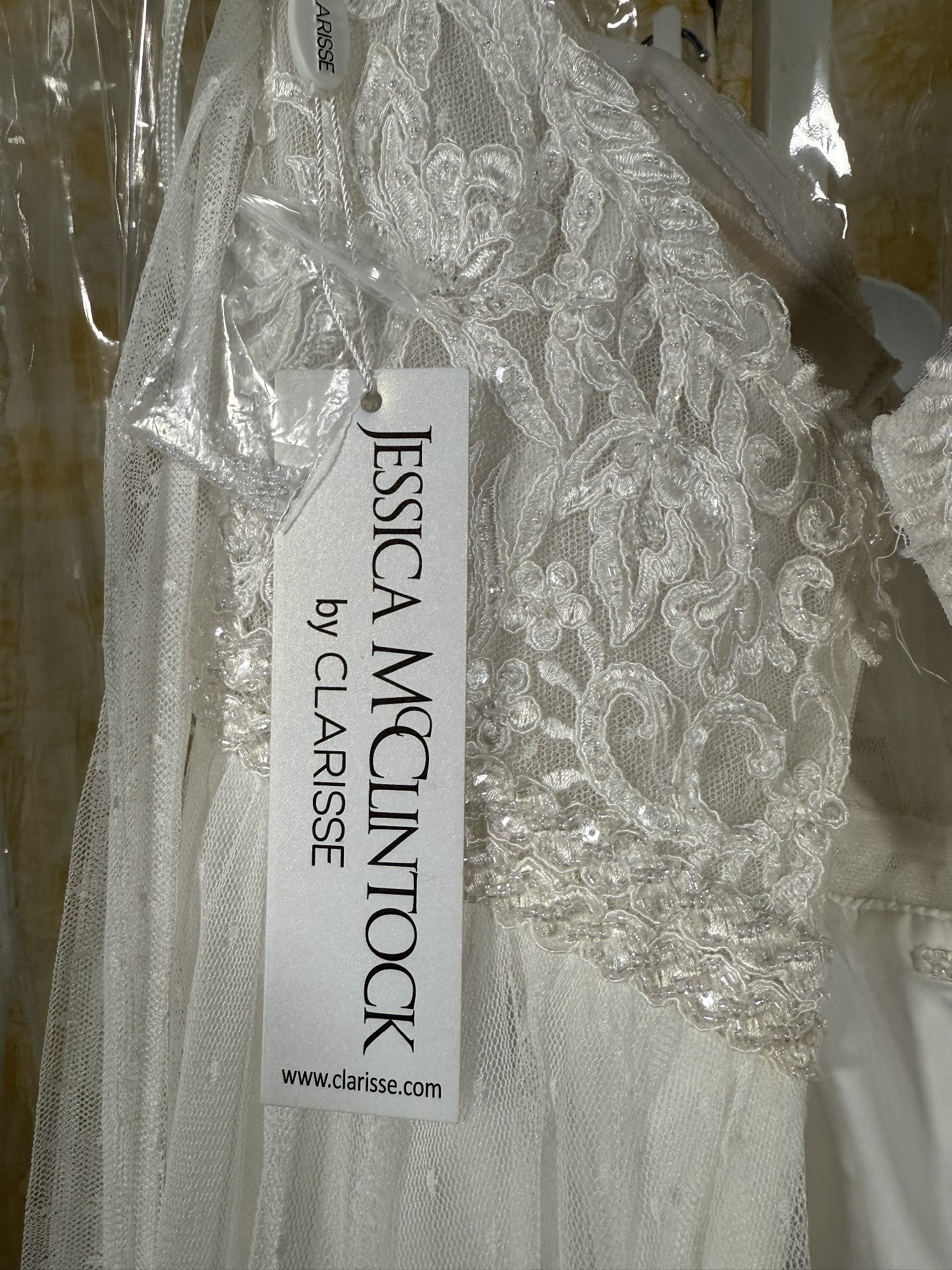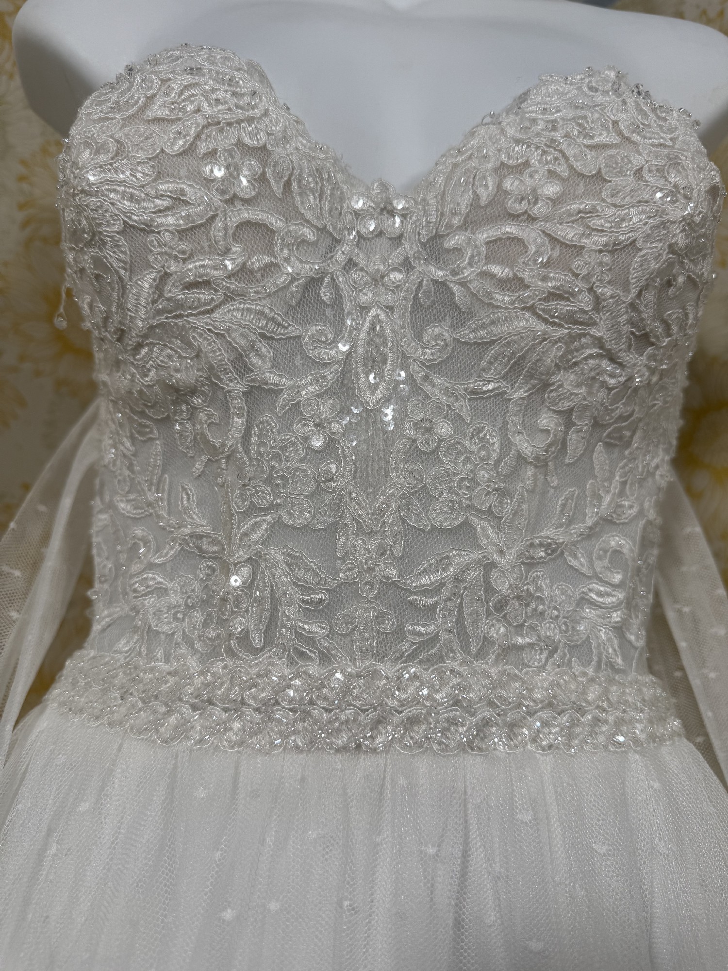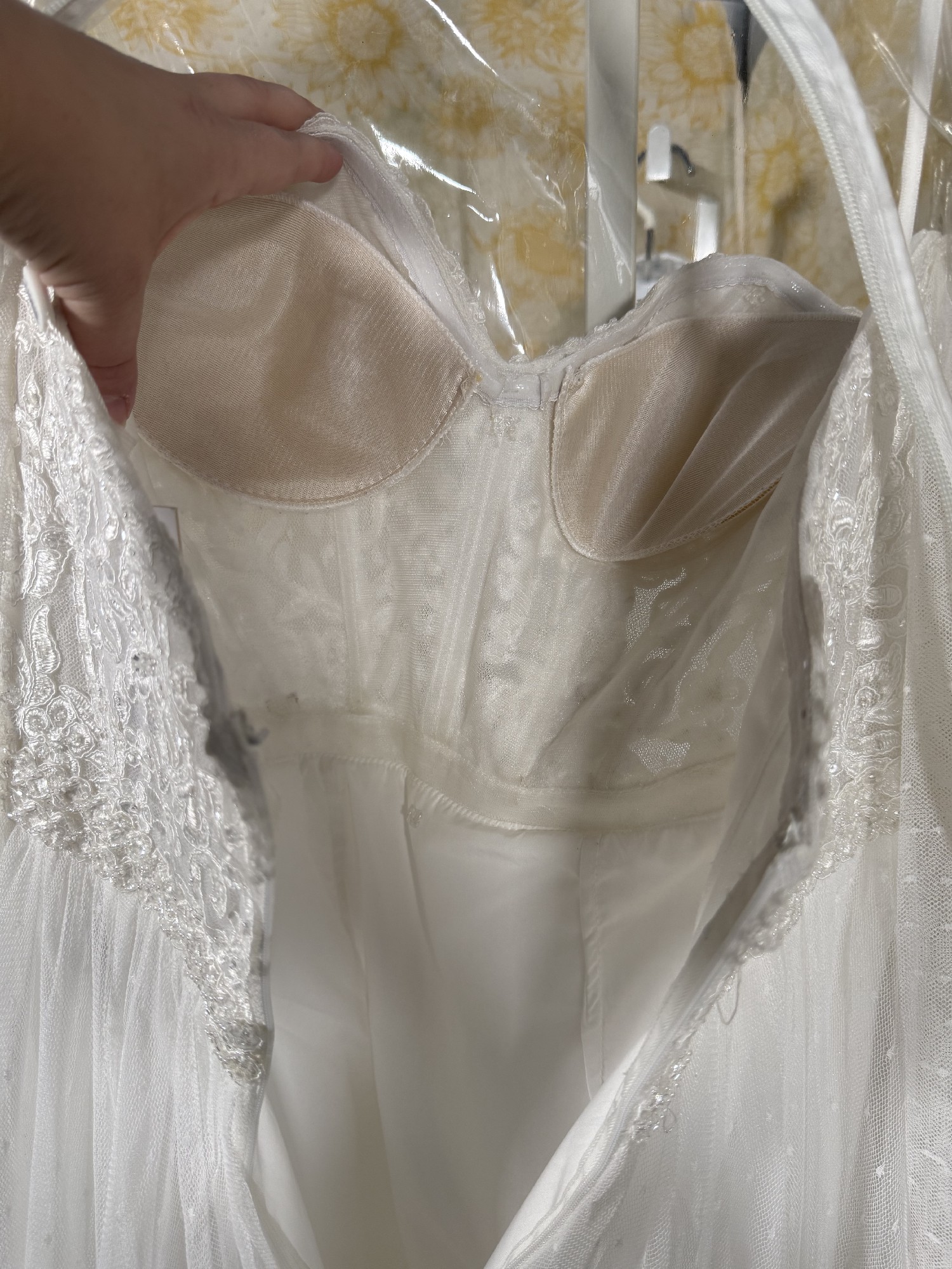 Sample gown with tags. There are no flaws on this beautiful gown! The arm pieces are attached to the bodice and can be tied however you like! I am open to all offers!