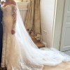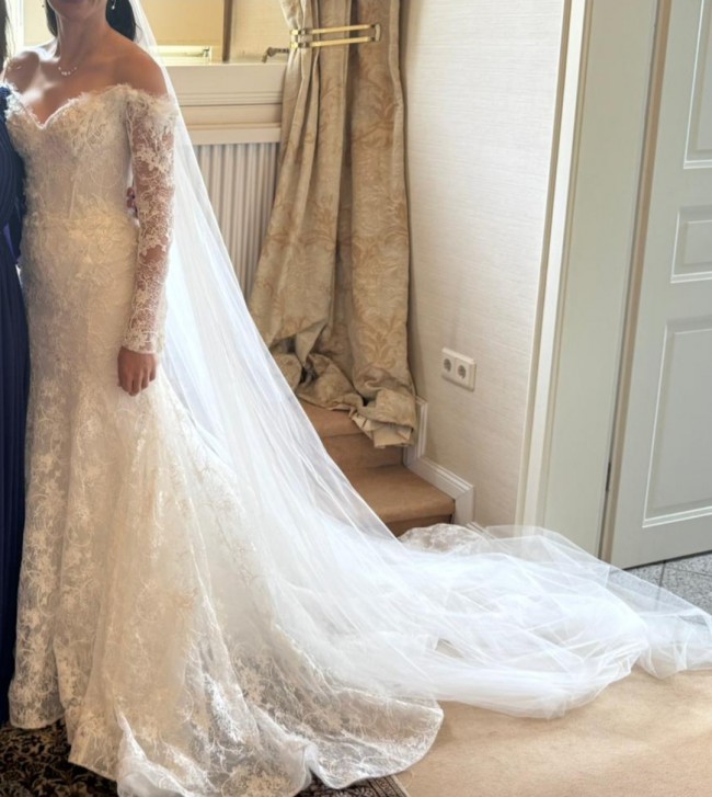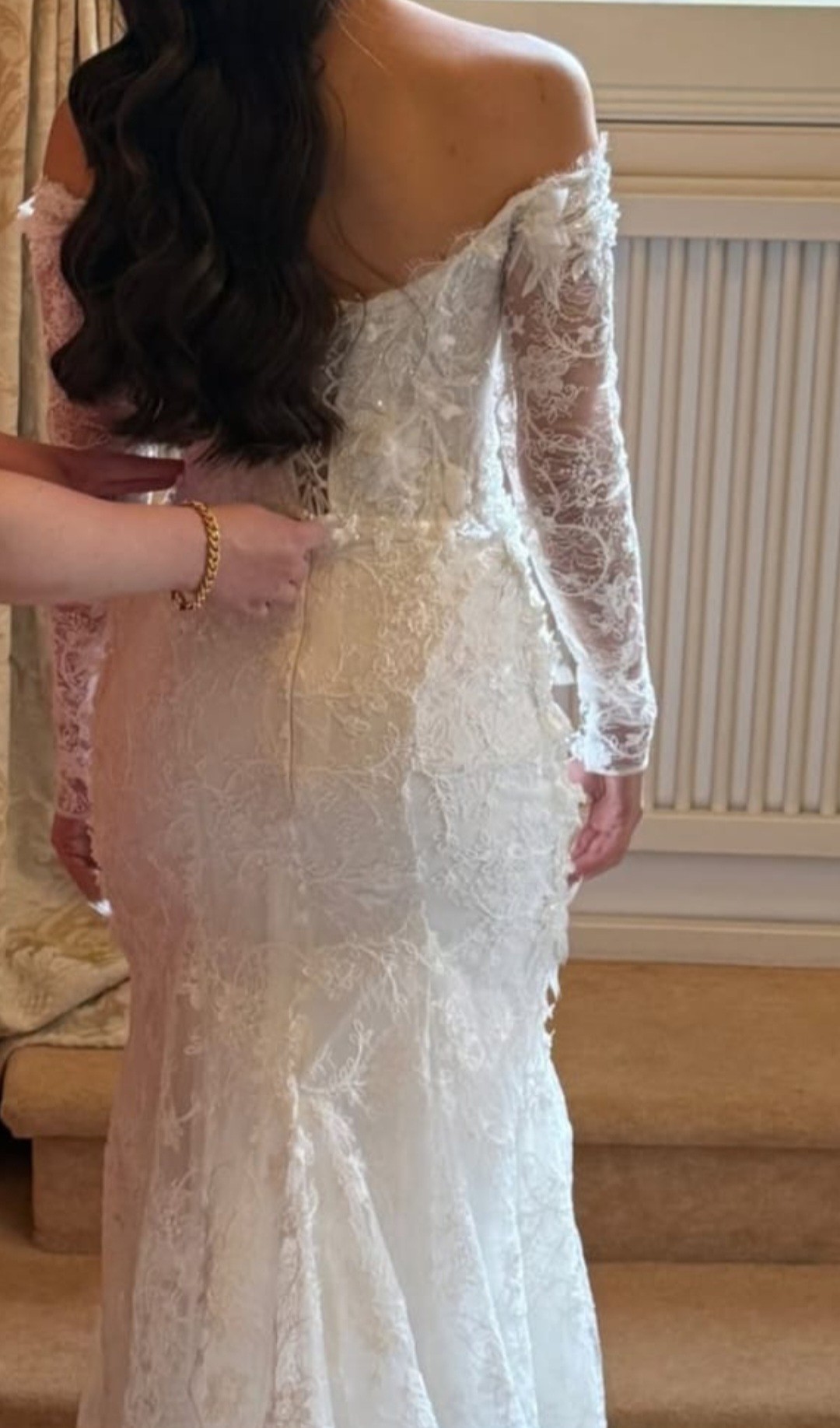 This exquisite Fit and Flare gown by Sima Couture was my dream dress, and I hope it becomes yours too. Crafted for a bride seeking elegance and comfort, the off-the-shoulder neckline beautifully accentuates the collarbone while offering a touch of romantic allure. The long sleeves add a classic vibe, perfect for both spring and fall celebrations.