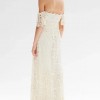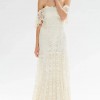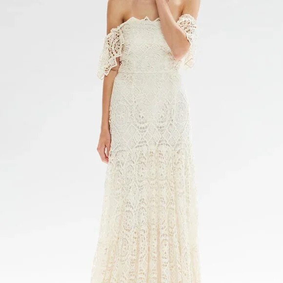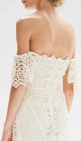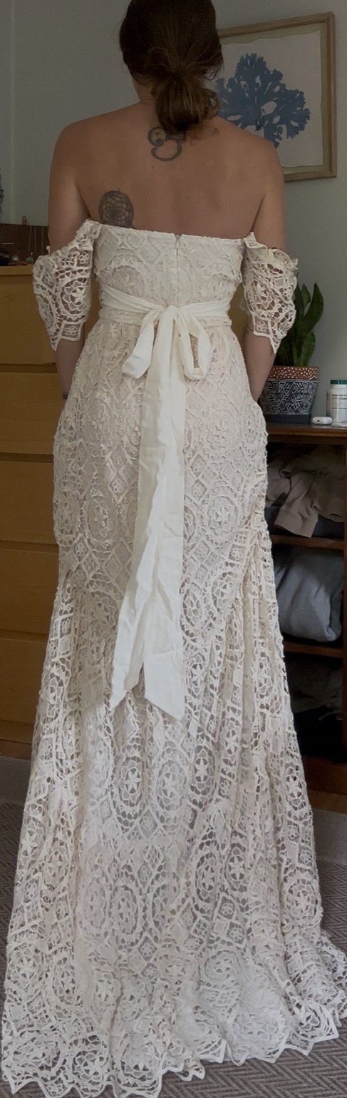 This lace and dress is so beautiful, but I ended up going with a second dress that I had also purchased. This dress has never been worn or used, just tried on. It is off the shoulders and bohemian vibe, with vintage lace.