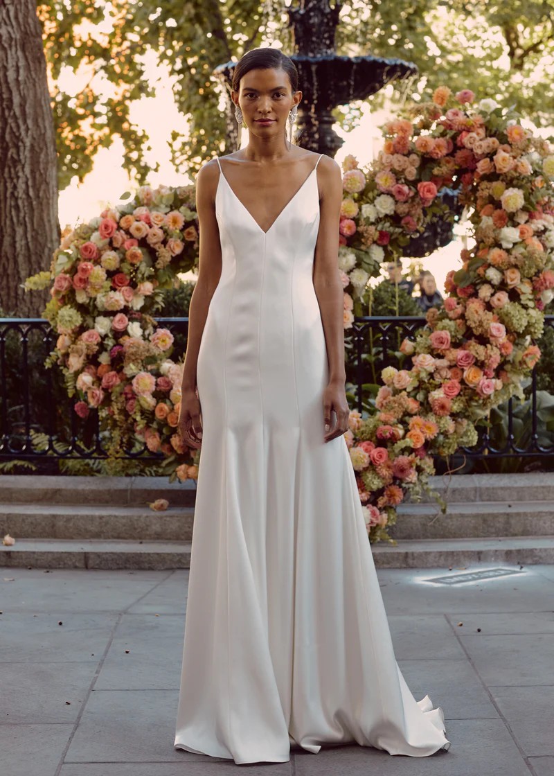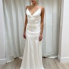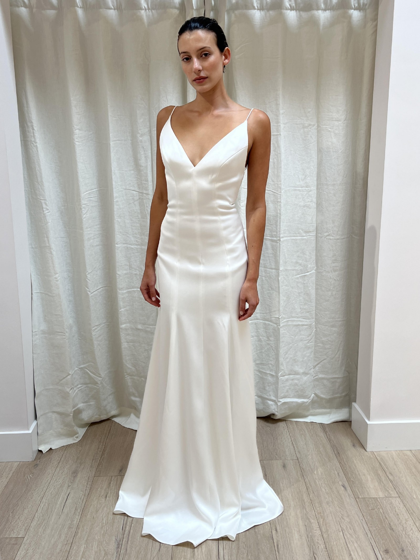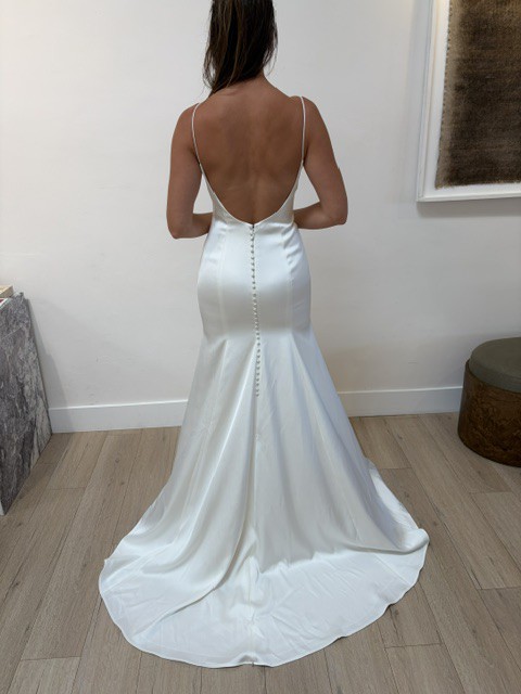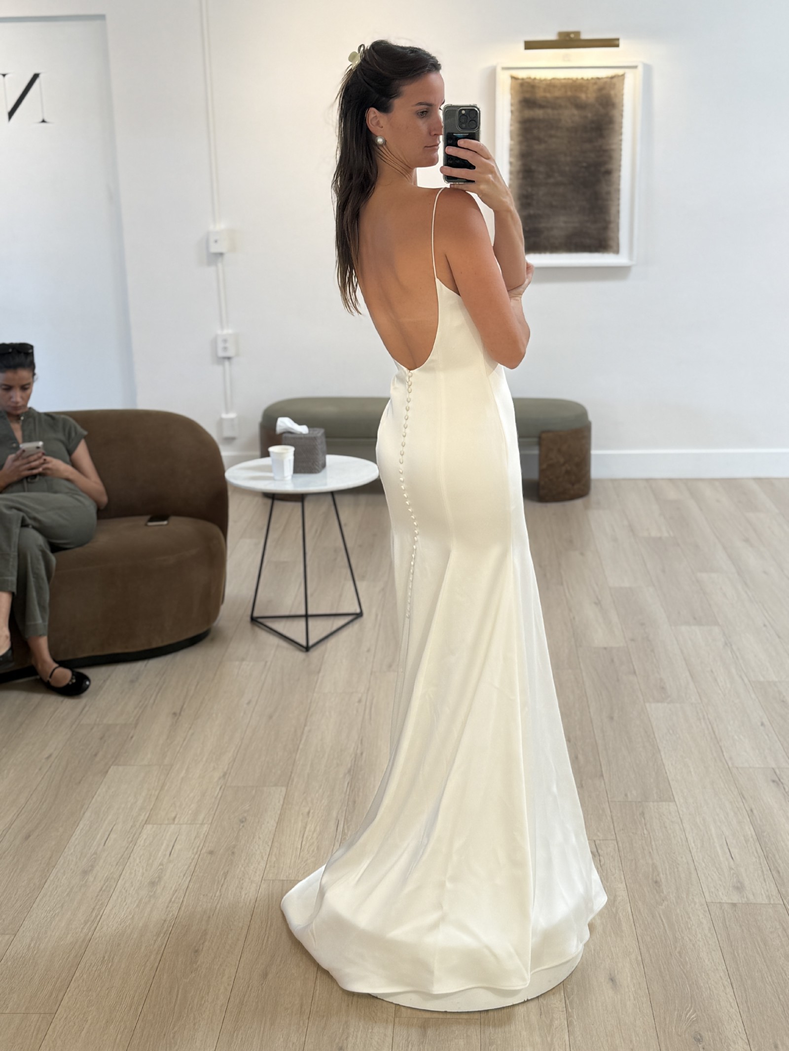 This gown features a flattering neckline, delicate spaghetti straps, and a low back that adds a subtle, modern edge. Made from lustrous satin, it drapes beautifully with buttons down the back and feels as good as it looks. Minimalist in design but striking in its simplicity.